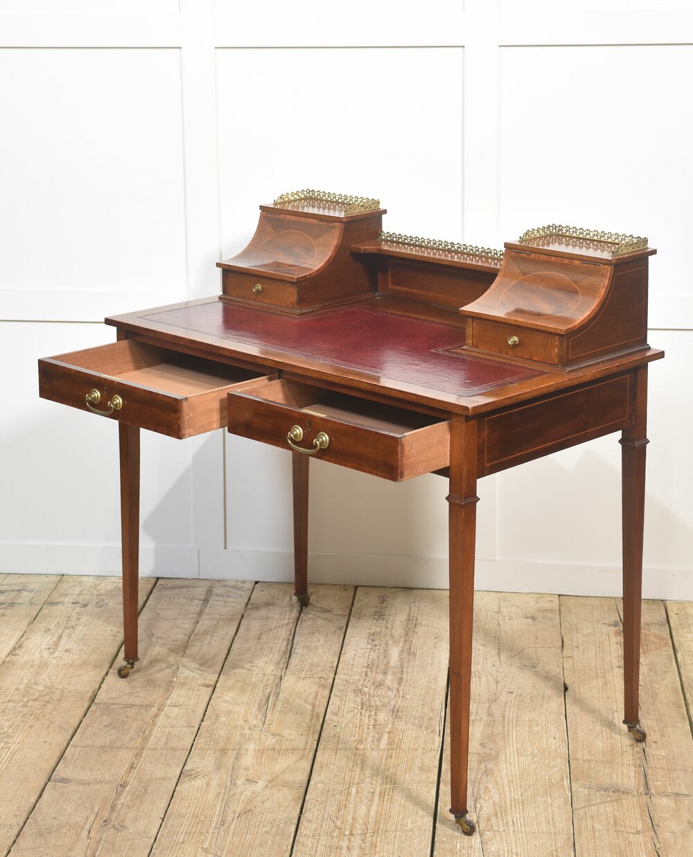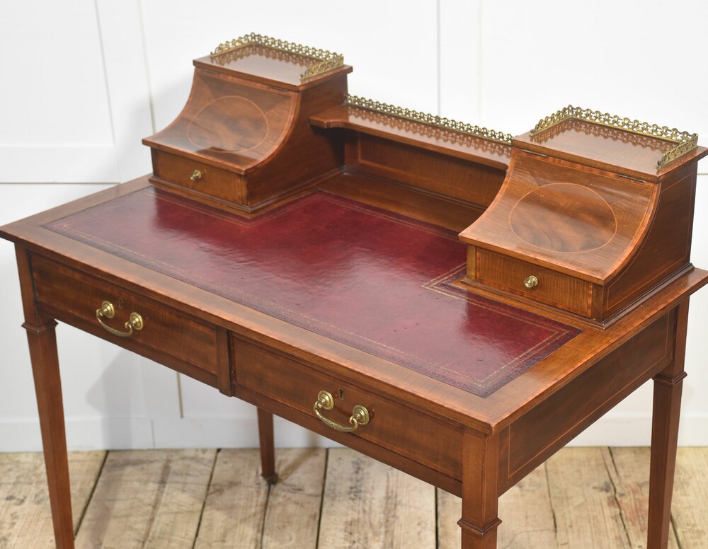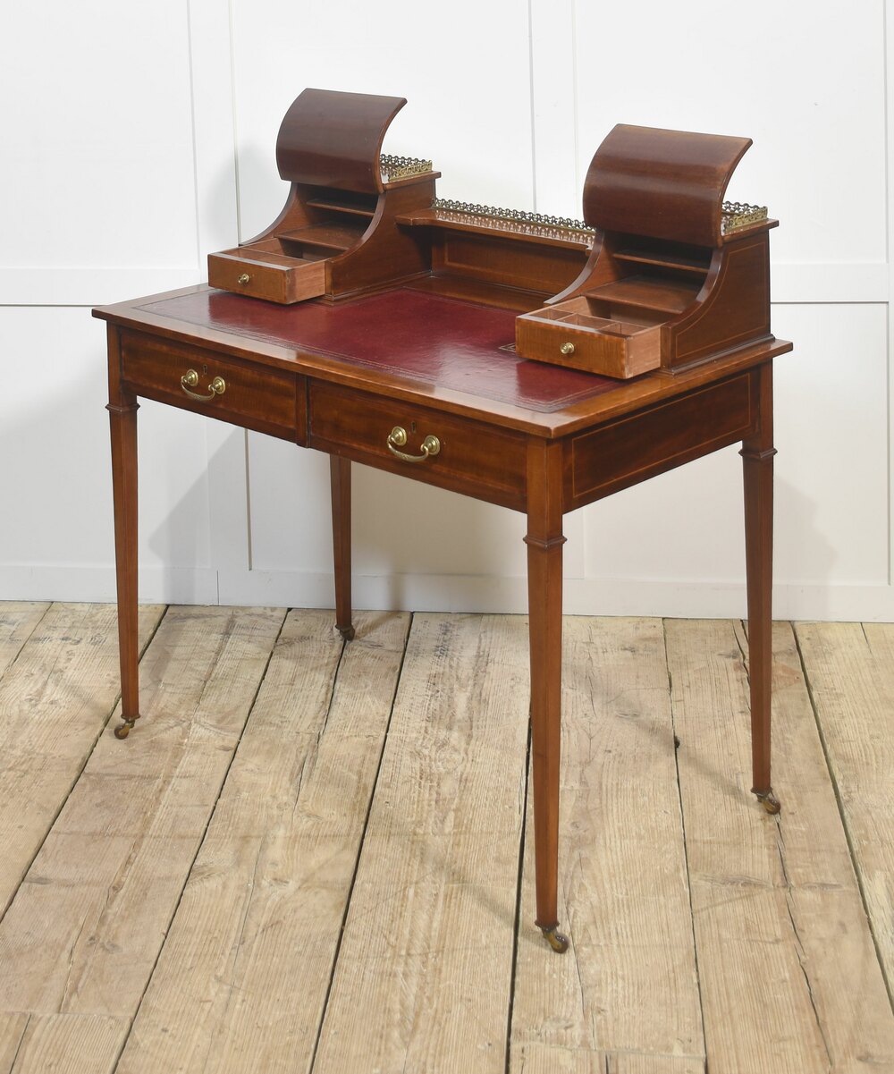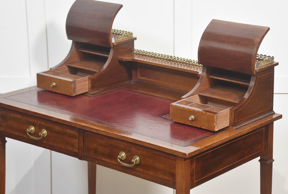 A fine quality Edwardian mahogany writing desk featuring elegant satinwood inlay and a rich patina. The desk is fitted with a tooled red leather writing surface, complemented by a pair of curved-front stationery boxes with small drawers and brass gallery surrounds. Beneath the writing surface are two full-width drawers with original brass swan-neck handles, offering generous storage.Raised on slender tapered legs with brass castors, this desk combines both style and practicality, making it an excellent addition to a study, office, or period-inspired interior.