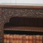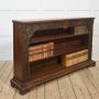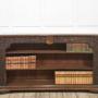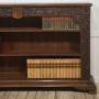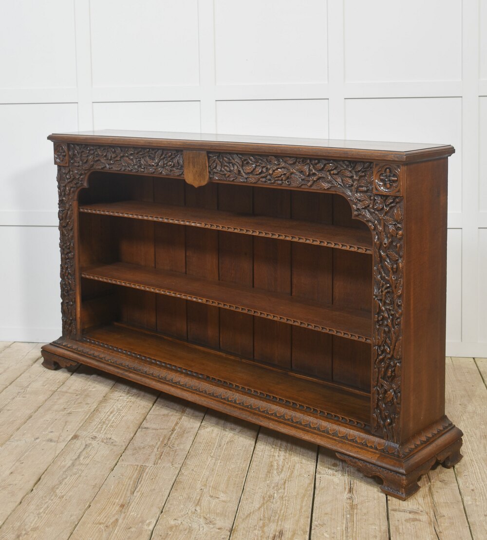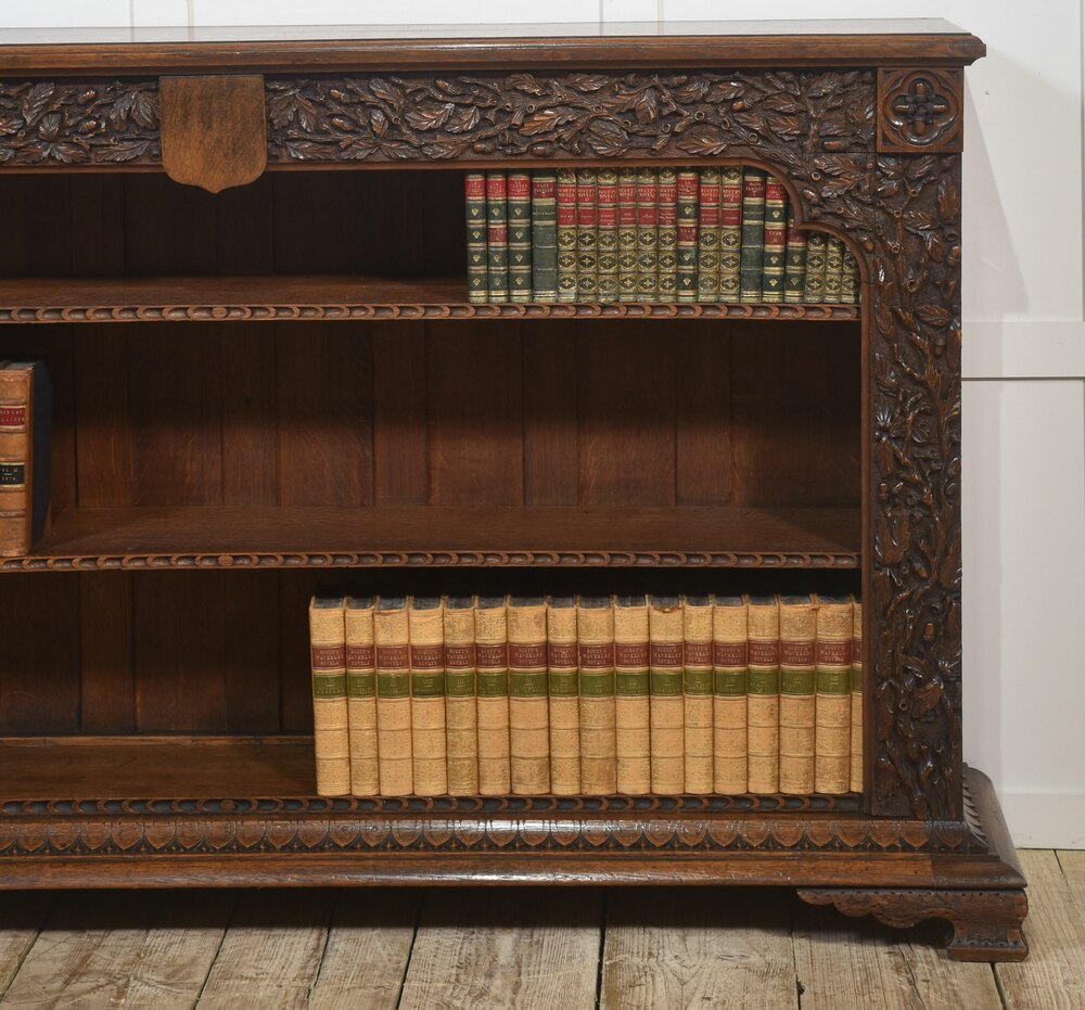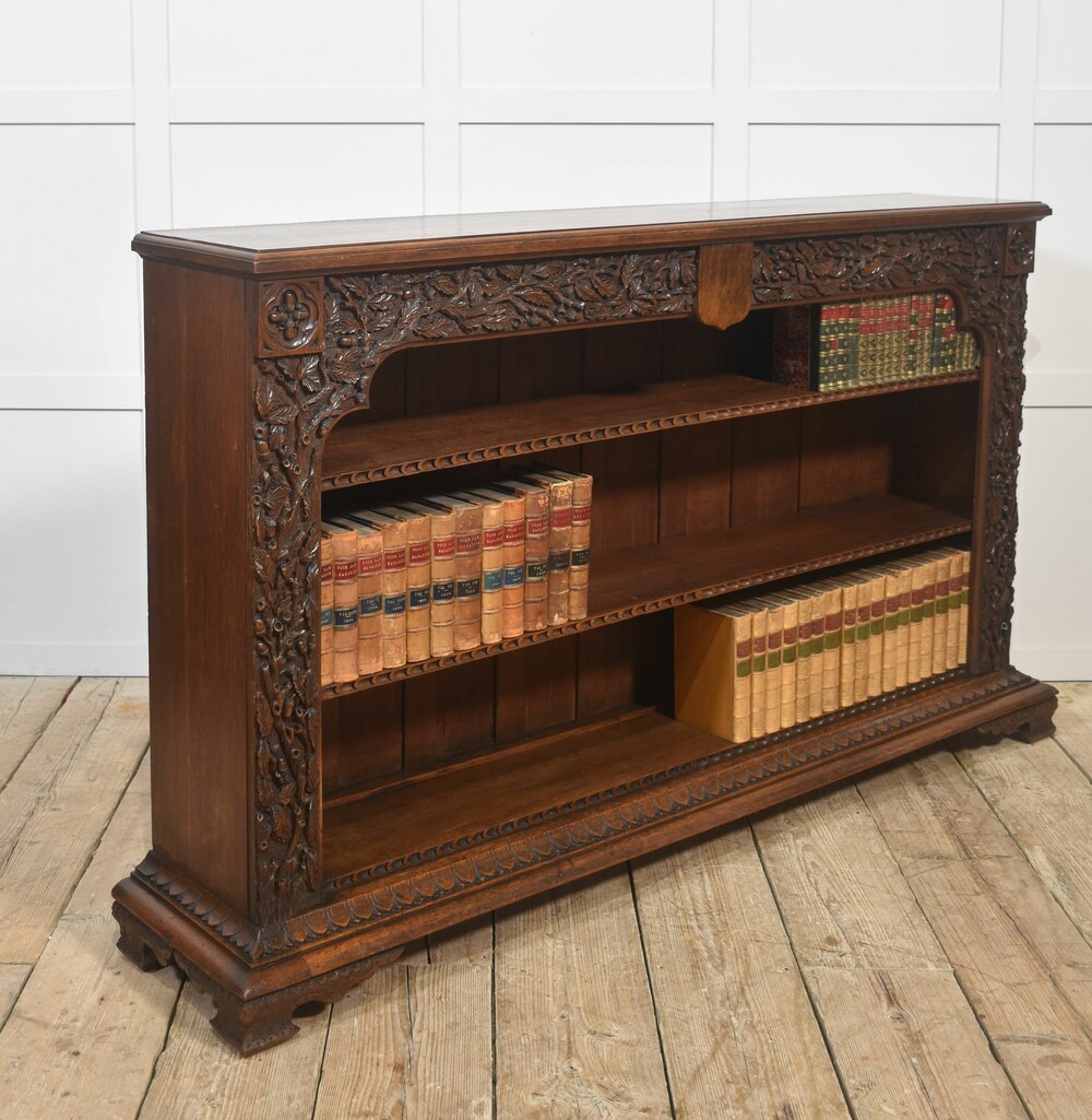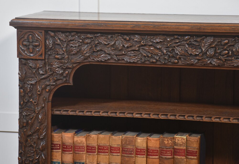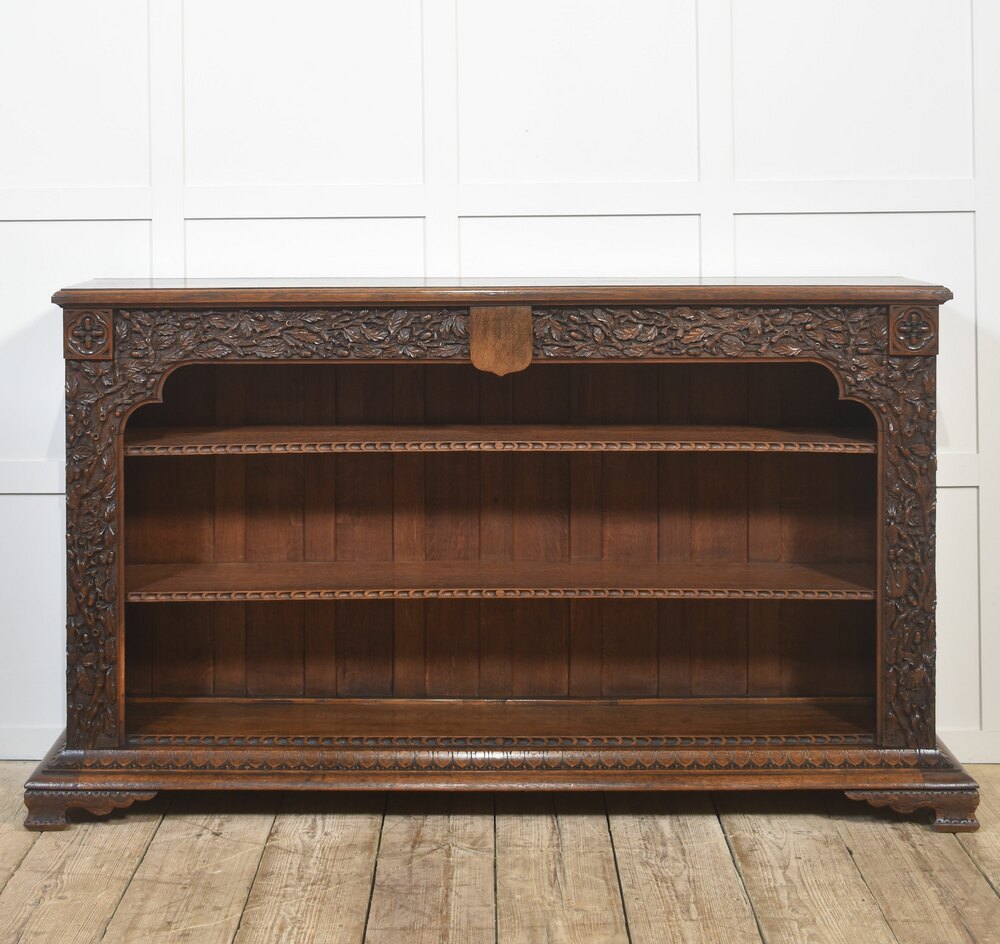 A beautifully crafted late 19th-century oak open bookcase, richly detailed with deep hand-carved decoration. The frieze is adorned with an intricate foliate design of oak leaves and acorns, framed at each corner with quatrefoil motifs, giving it a striking Gothic Revival character. The bookcase features two sturdy adjustable shelves, each finished with carved moulding, offering generous storage for books or display pieces.Raised on a plinth base with carved edging and bracket feet, this piece combines functionality with fine craftsmanship. The warm oak patina enhances its timeless appeal, making it a statement addition to any traditional or period-inspired interior.