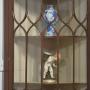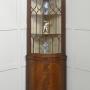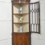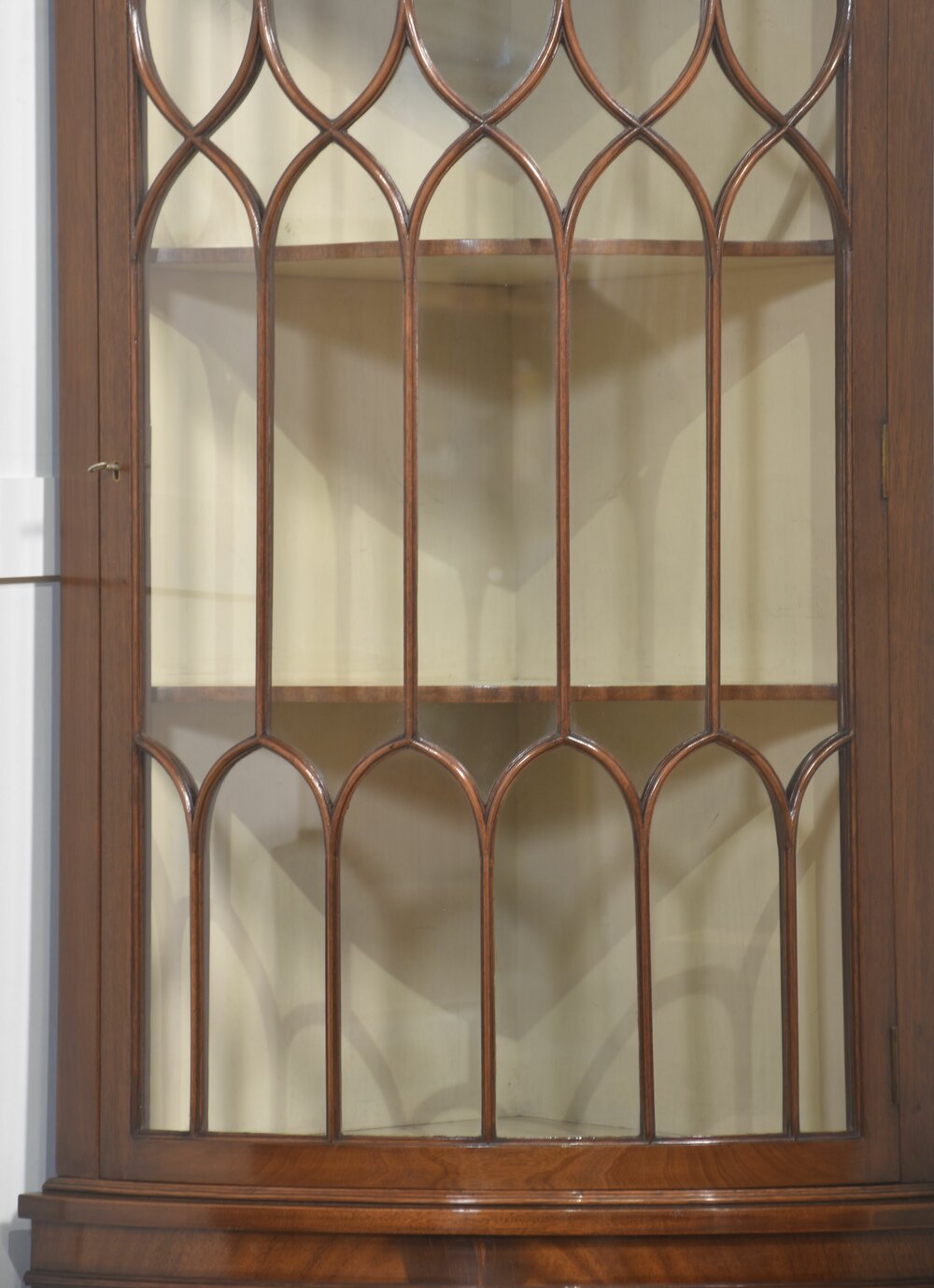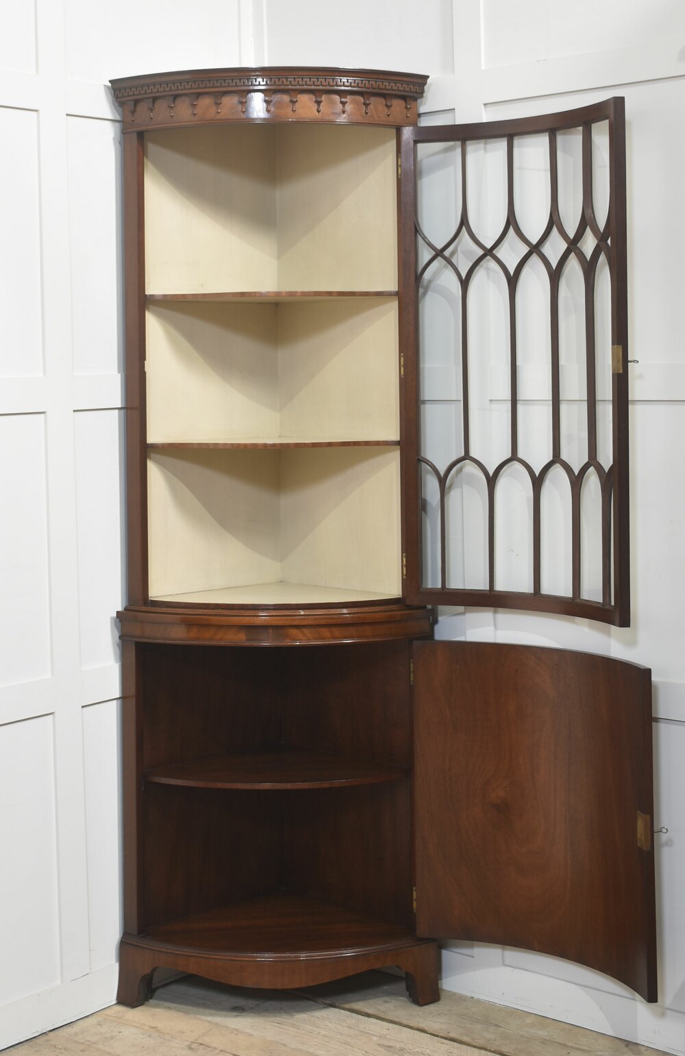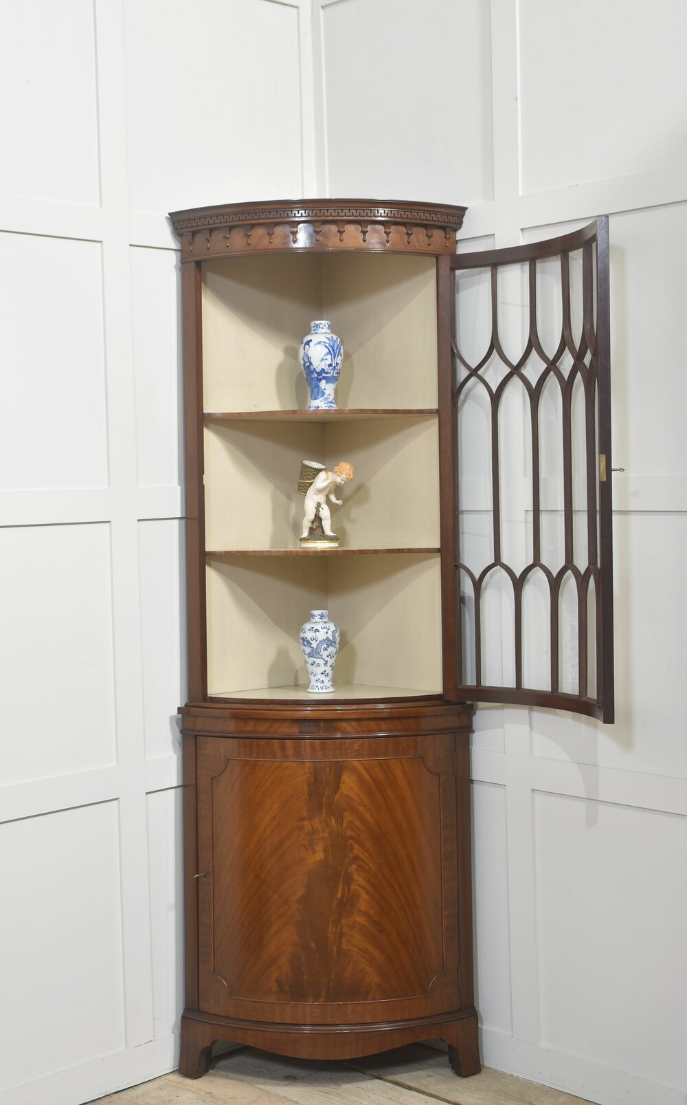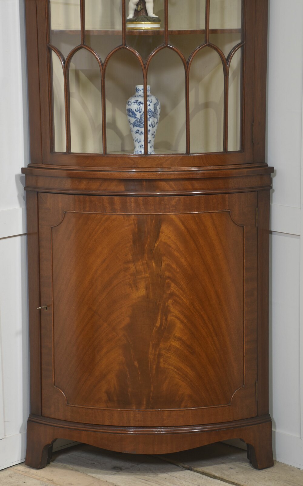 This elegant mahogany corner cabinet is designed in the Georgian style, showcasing fine craftsmanship and timeless appeal. The upper section features a glazed door with decorative astragal glazing bars, opening to reveal three display shelves ideal for china, glassware, or decorative pieces. The cabinet is topped with an intricately carved cornice, adding a refined architectural detail.The lower section offers a panelled cupboard door with figured mahogany veneers, opening to additional storage with shelving inside. The piece stands on shaped bracket feet, completing its classic silhouette.