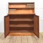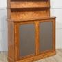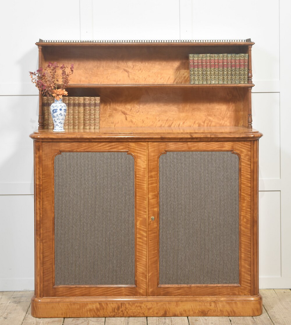 A superb William IV period chiffonier, beautifully crafted in richly figured maple with a lustrous hand-polished finish that enhances the natural depth and movement of the grain. The upper section features two open display shelves supported by elegant turned columns and finished with a fine brass gallery, ideal for displaying books or decorative objects.The lower section comprises a pair of paneled doors with finely striped fabric inserts, opening to reveal a spacious shelved interior for ample storage. The doors are fitted with a Bramah lock and working key, a hallmark of quality craftsmanship from this period.