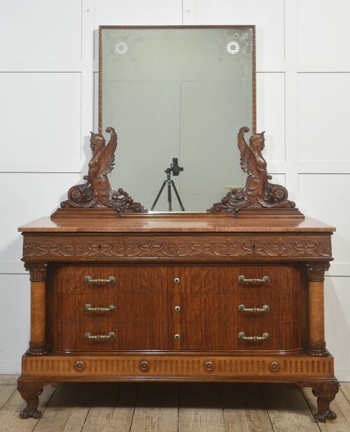 Impressive 19th-Century Mahogany Dressing Chest with Marble Top and Carved Winged CaryatidsA magnificent late 19th-century mahogany dressing chest featuring a richly figured marble top and an imposing mirror supported by finely carved winged female caryatids. The large mirror is framed in carved mahogany and embellished with etched floral corner motifs, adding refinement and period character.