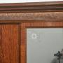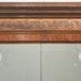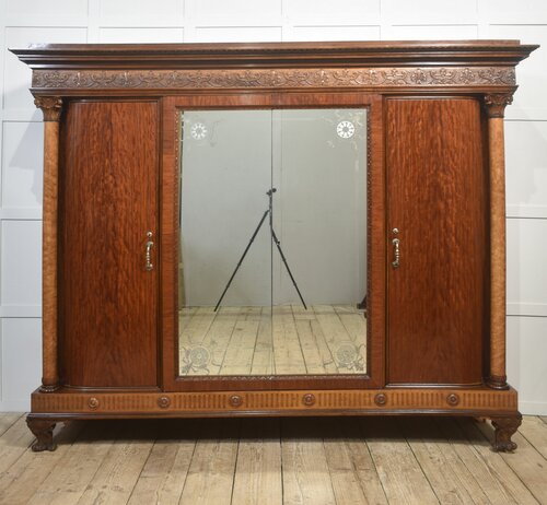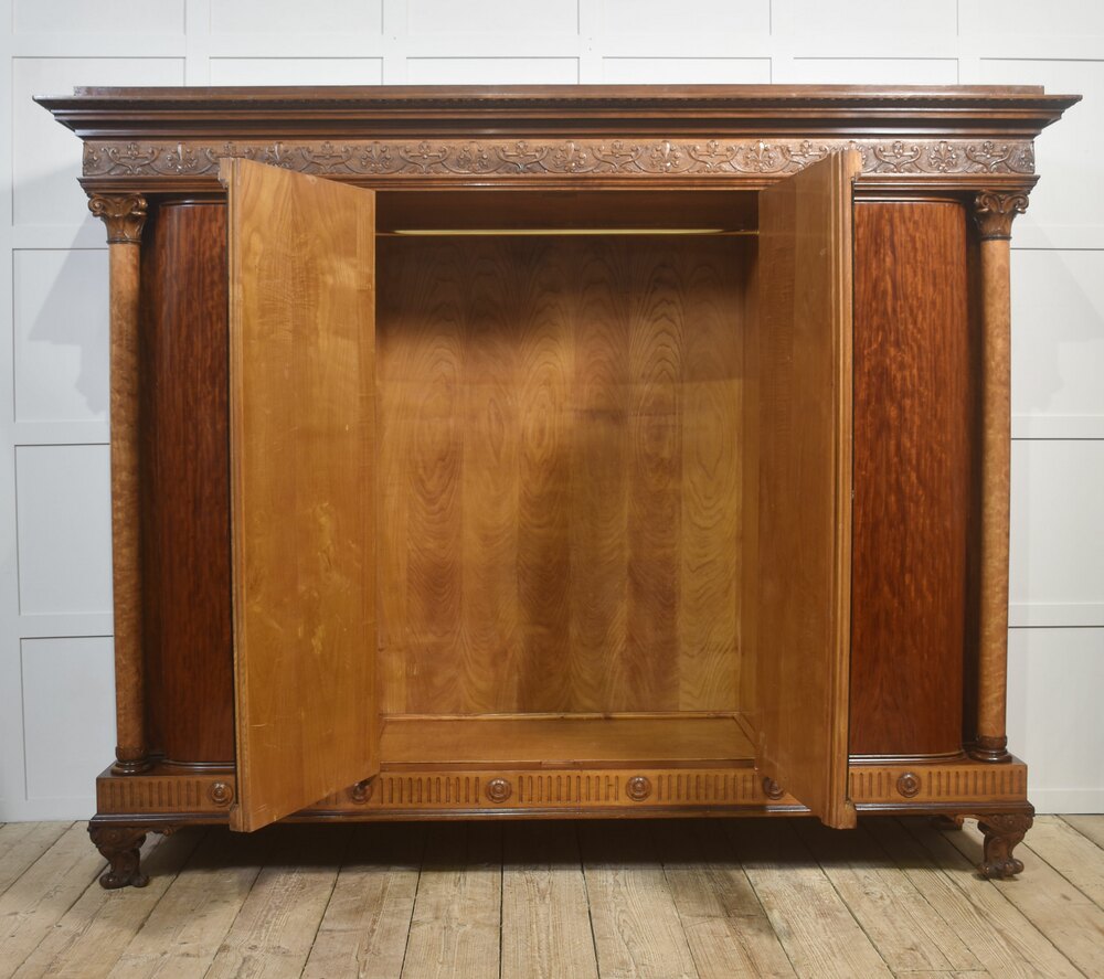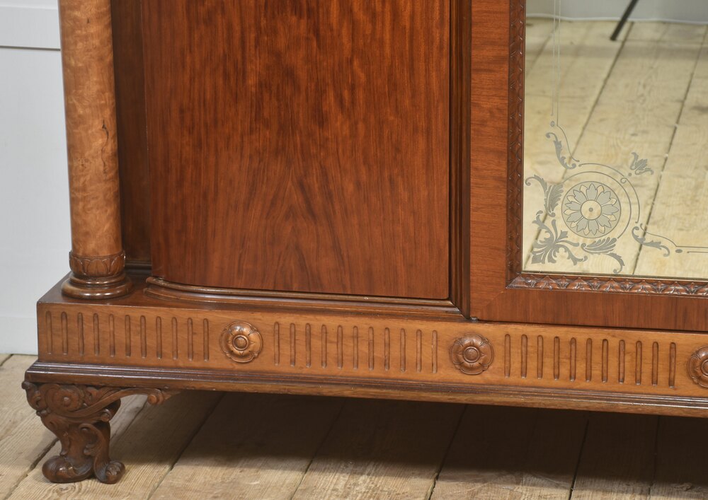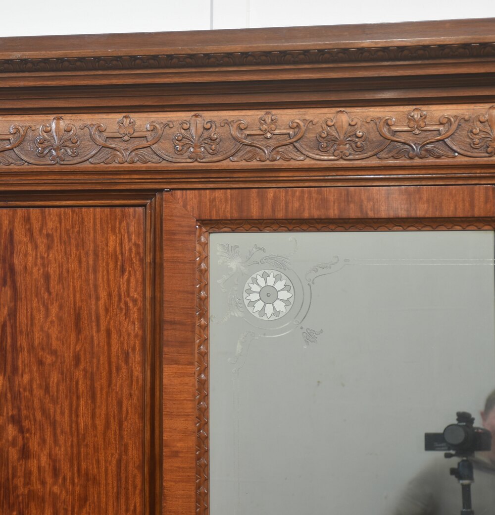This exceptional late-19th to early-20th-century four-door wardrobe showcases superb craftsmanship, rich materials, and grand architectural presence. Constructed from beautifully figured mahogany, it features striking maple front columns with finely carved capitals, adding warm contrast and distinctive character to the piece.At the centre, a pair of bevelled mirror doors is framed with delicate hand-carved edging and decorated with elegant floral corner etchings. The wardrobe is crowned with an intricately carved frieze of scrolling foliage and stylised motifs, creating an impressive decorative statement. Below, the fluted base rail is accented with carved rosettes and supported by sculpted cabriole feet with ornate acanthus motifs.