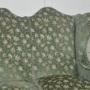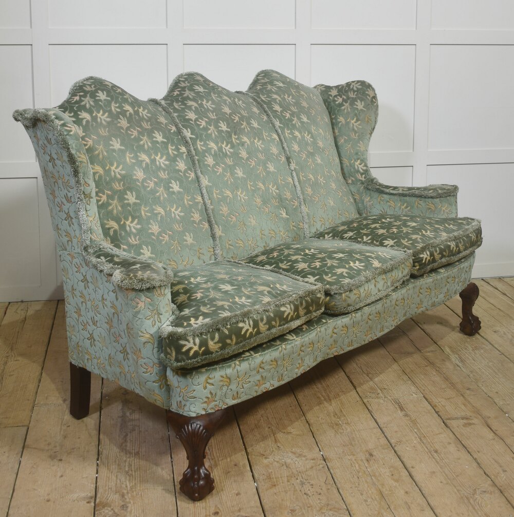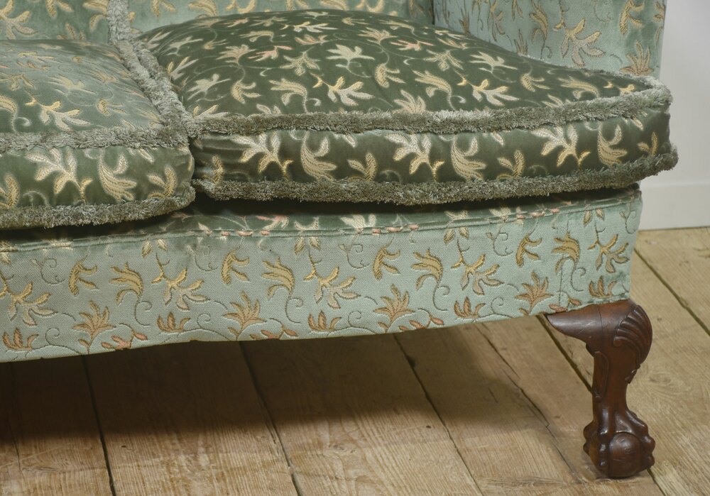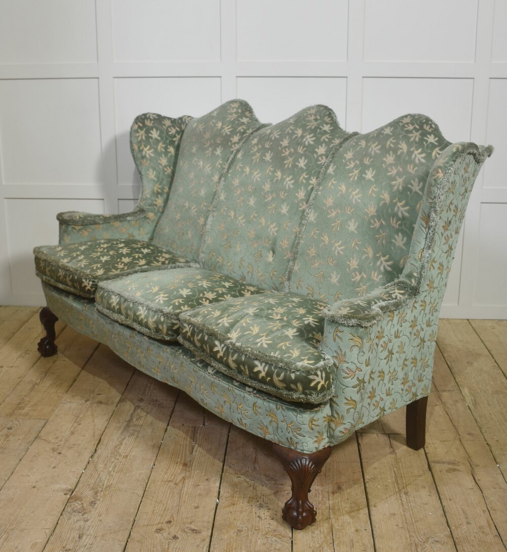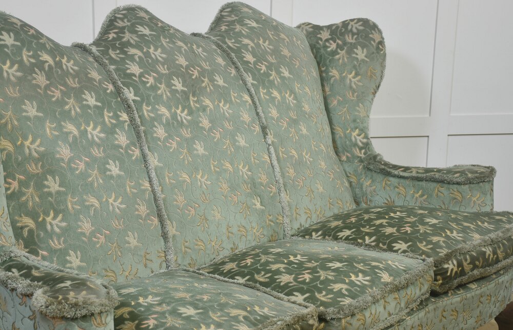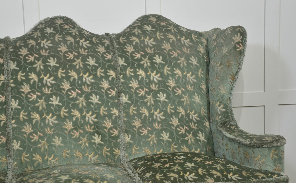 Bring refined character into your space with this beautifully upholstered three-seat sofa, distinguished by its graceful silhouette and richly detailed craftsmanship. The gently scalloped backrest, paired with softly flared winged sides, creates an inviting and sculptural profile from every angle.The sofa is upholstered in a plush sage-green patterned fabric featuring an intricate leaf-and-vine motif in warm gold and soft blush tones. Matching loose seat cushions with coordinating fringe trim add both comfort and charm. The upholstery presents an appealing aged patina, enhancing its decorative appeal.