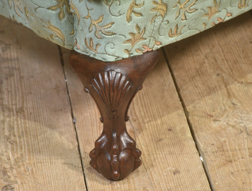 A standout feature of this piece is its set of finely hand-carved front legs, shaped in a traditional cabriole form with shell and scroll details terminating in stylized claw feet. The rear legs are straight and squared, providing stability while maintaining the classic aesthetic.