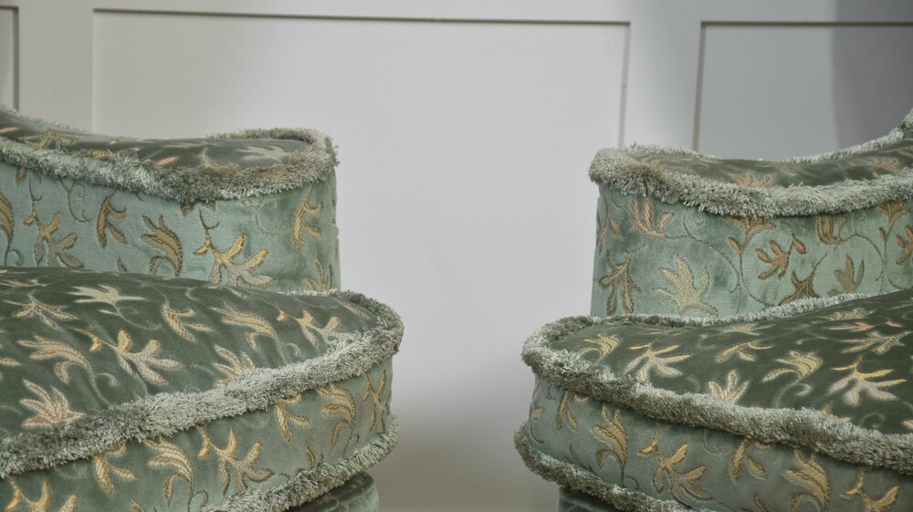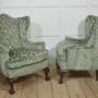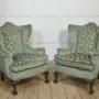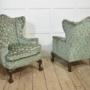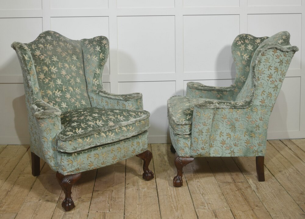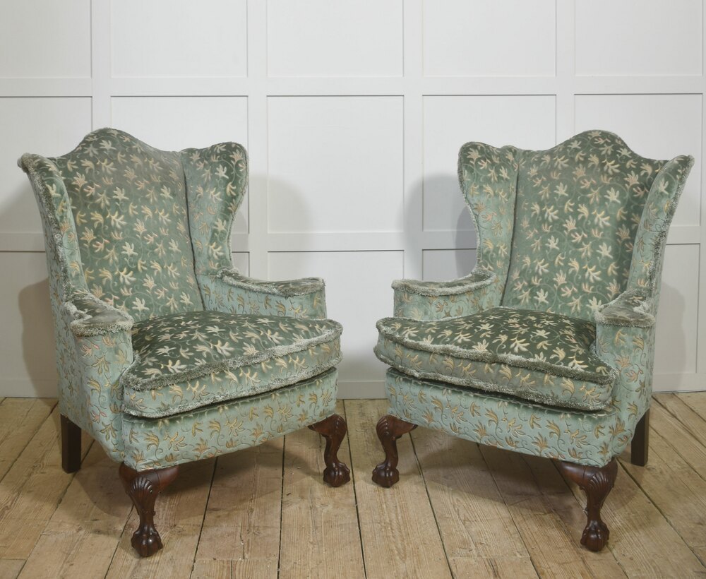 This handsome pair of generously proportioned wingback armchairs showcases early 20th-century craftsmanship and classic traditional styling. Upholstered in a soft sea-green fabric with an elegant woven foliate motif in muted gold, sage, and rose tones, the chairs present a beautifully textured surface with subtle sheen and depth. Plush, loose seat cushions and matching arm padding are finished with coordinating fringe trim, adding a touch of decorative refinement.The chairs feature sweeping wings, gently flared arms, and a high, sculpted backrest that together create a graceful and inviting silhouette. Beneath the upholstery, the front legs are crafted from richly toned mahogany and distinguished by shell-carved knees and robust ball-and-claw feet—an iconic nod to 18th-century English design traditions. Straight rear legs provide balance and structural stability.