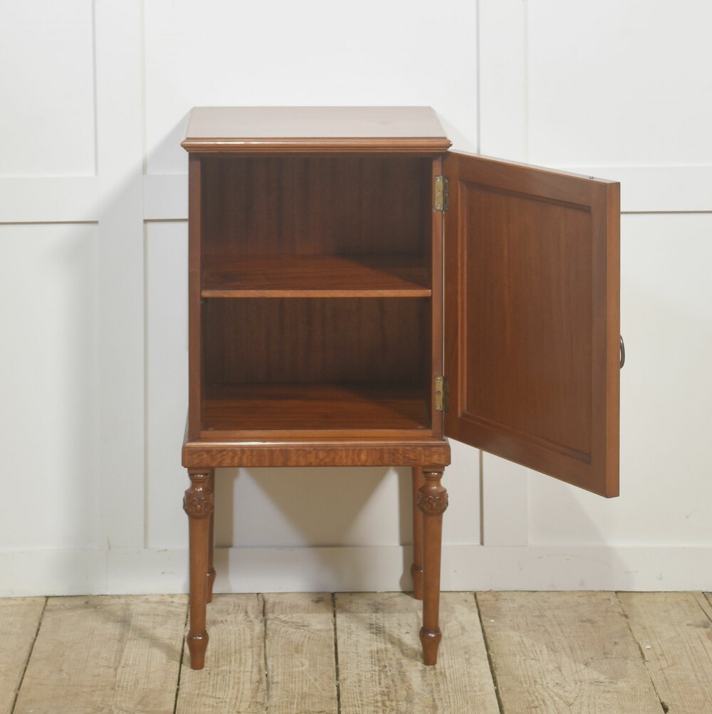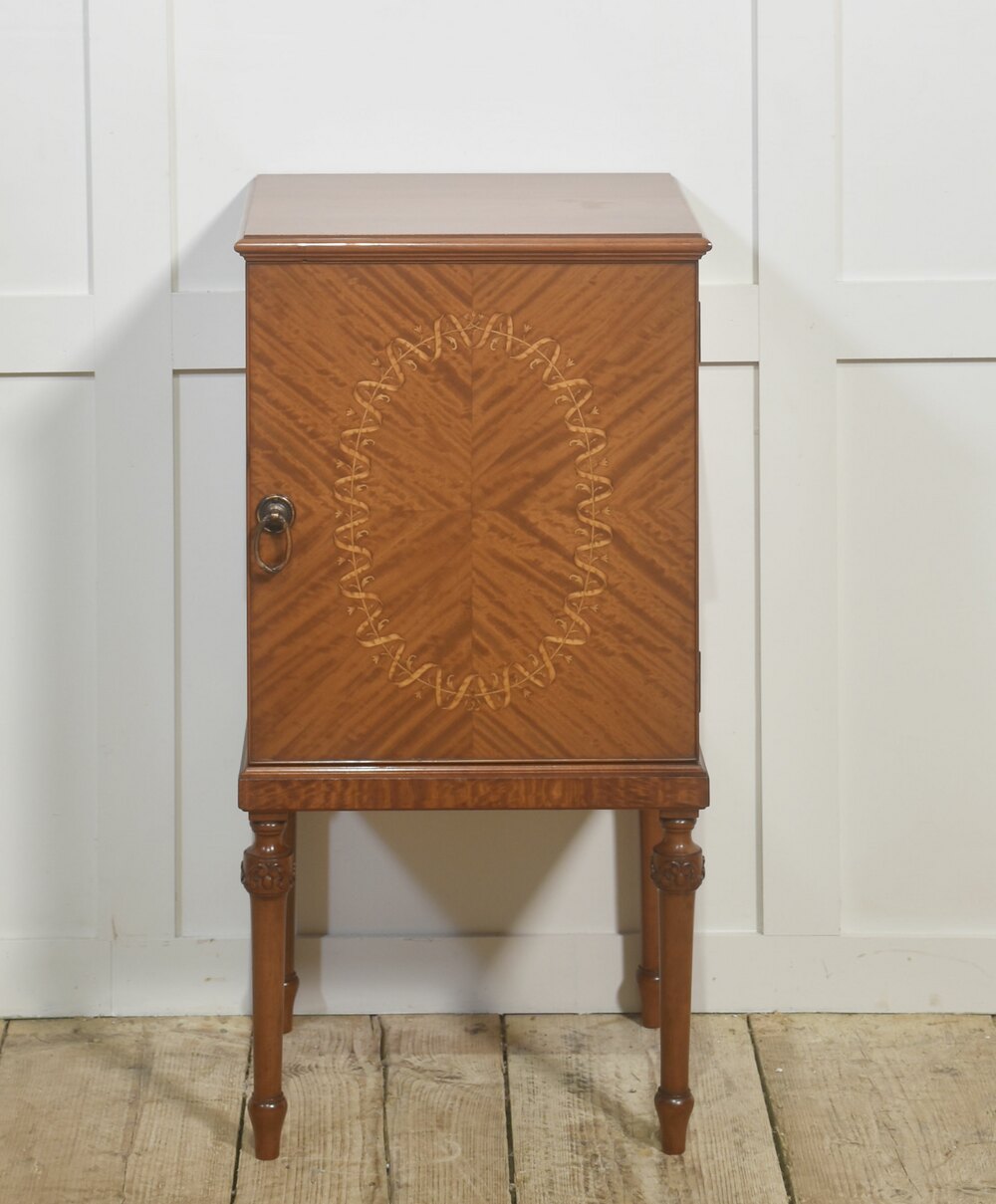 This elegant bedside cabinet is crafted in beautifully figured satinwood, exhibiting the species’ characteristic light golden tone and fine, shimmering grain. The door showcases a striking book-matched veneer pattern framed by an intricate oval marquetry inlay, executed in a delicate ribbon-and-foliate motif that enhances the cabinet’s refined aesthetic. A traditional brass ring pull provides a subtle period accent.Raised on four slender, turned legs with carved decorative collars, the cabinet presents a graceful, elevated profile. The interior features a single fixed shelf, offering functional storage suitable for bedside use or as an accent cabinet in any room.