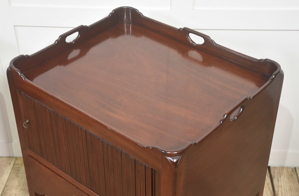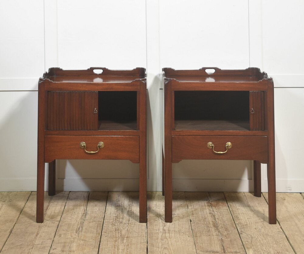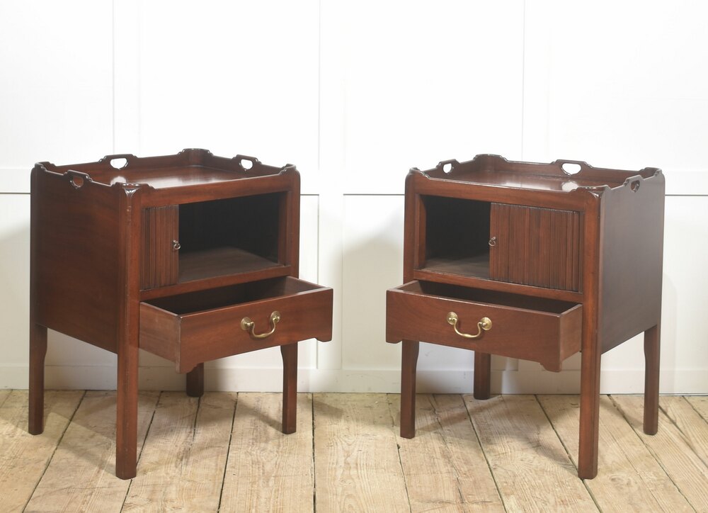 A handsome pair of bedside cabinets, crafted in well-figured mahogany with understated classical lines. Each cabinet is fitted with a raised gallery top incorporating pierced carry handles, lending both practicality and visual refinement. The upper section features a tambour-style sliding door opening to an open storage compartment, suitable for books or personal effects. Below, a single drawer with original brass swan-neck handle provides additional enclosed storage, all supported on square tapered legs.Dimensions