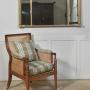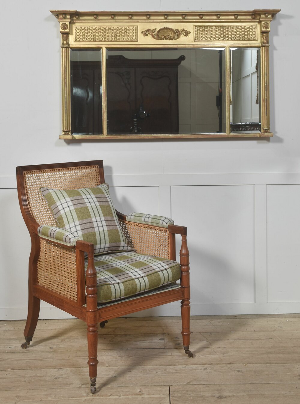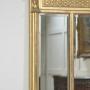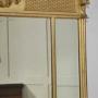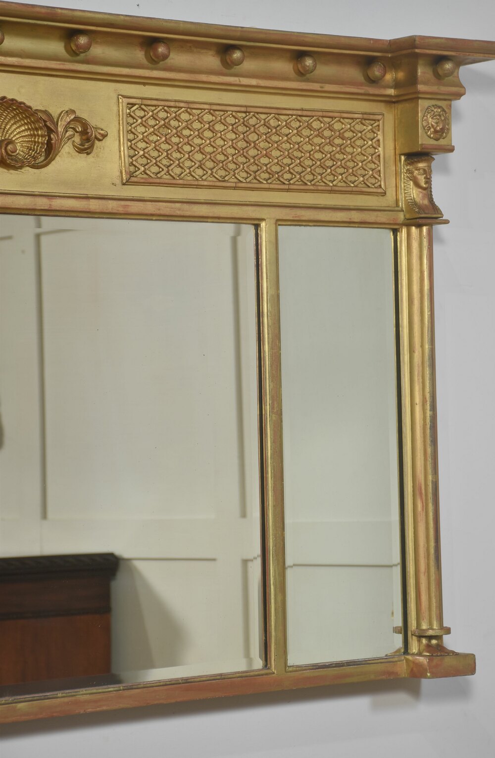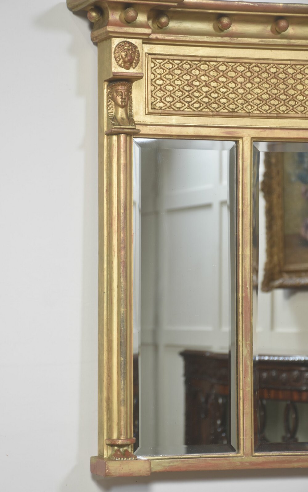 A finely proportioned and richly ornamented neoclassical overmantel mirror, carved in giltwood and retaining a warm, softly aged gilded surface with areas of original bole and intentional patina. The rectangular frame is surmounted by a deep projecting cornice with a repeating band of carved roundels, above a frieze composed of two finely tooled lattice panels flanking a central anthemion shell cartouche with scrolling acanthus terminals.The mirror plate is divided into three vertical sections, emphasising architectural balance and scale, and framed by slender moulded surrounds. The uprights are articulated as fluted pilasters, each topped with carved classical bust masks beneath paterae blocks, lending a distinctly archaeological neoclassical character. The lower sections terminate in stepped plinths with carved paw-foot details.