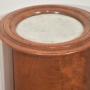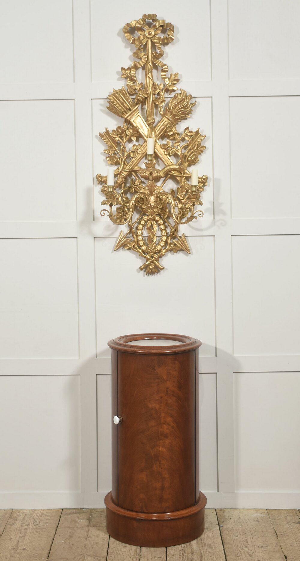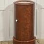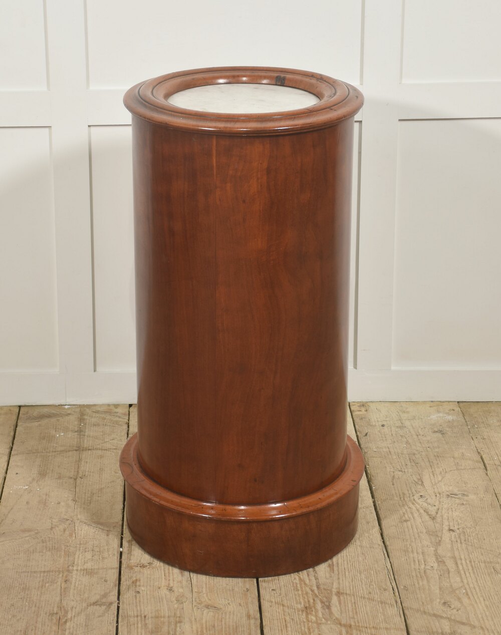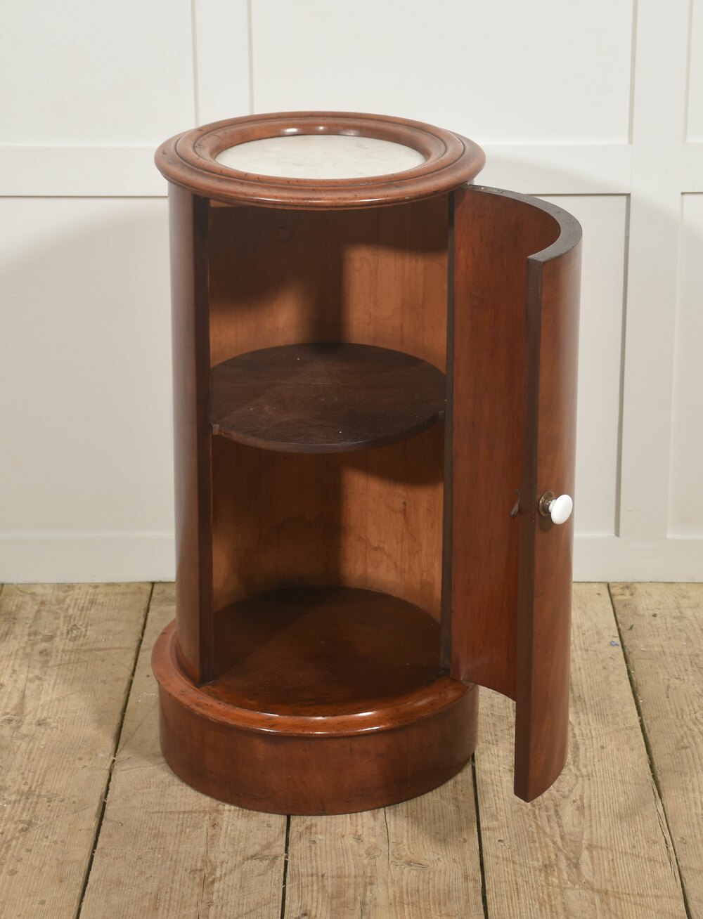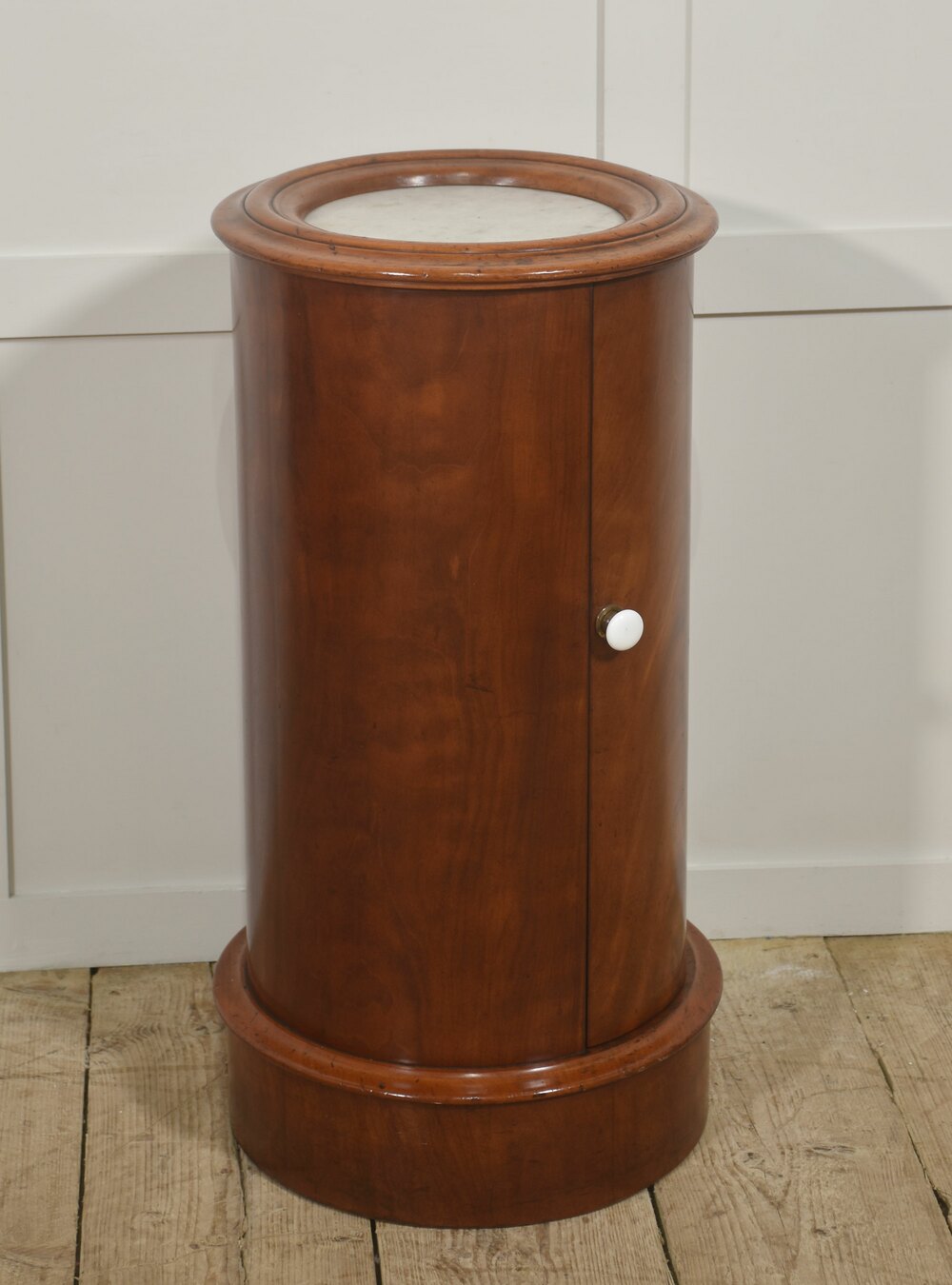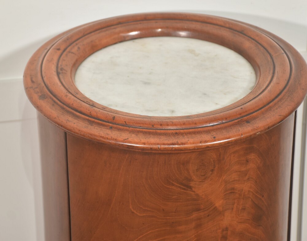 A fine early Victorian cylindrical bedside or occasional cabinet, constructed in richly figured mahogany and retaining its original white marble inset top. The piece is of elegant drum form, the vertical body veneered in beautifully matched flame mahogany with a warm, honeyed patina that highlights the natural movement and depth of the grain. The cylindrical outline is accentuated by a boldly moulded top and plinth base, creating a balanced and architecturally confident silhouette.The top is fitted with a circular white marble panel, neatly recessed within a substantial moulded mahogany surround. The marble displays gentle age-related marking consistent with use, complementing the character of the timber. The body is enclosed by a single curved door, seamlessly integrated into the drum form and fitted with a simple white ceramic knob and brass collar. When opened, the door reveals a well-proportioned interior fitted with a fixed circular shelf, providing practical storage while maintaining the cabinet’s clean external lines.