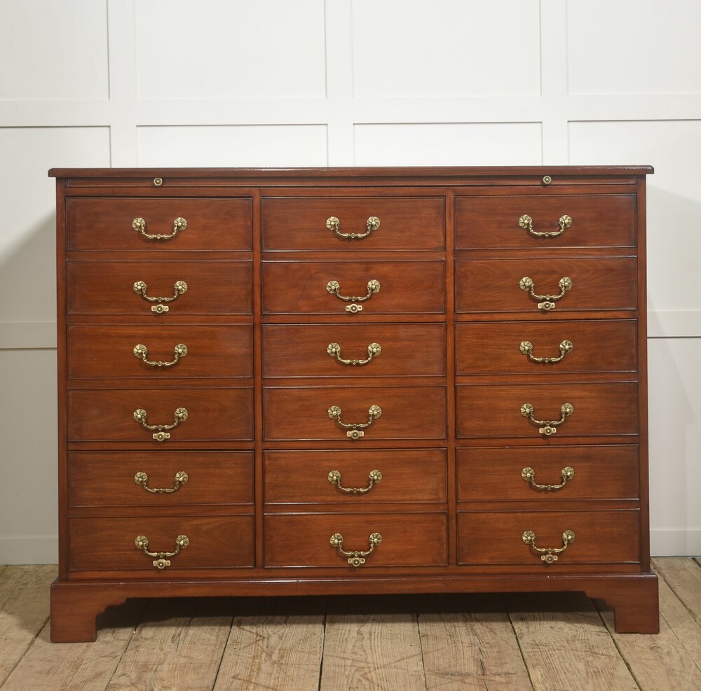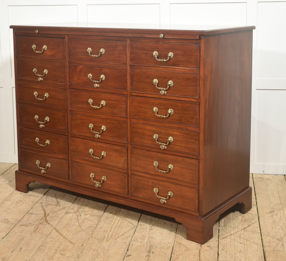 A substantial and finely crafted mahogany filing cabinet of impressive scale and restrained classical design, the rectangular top with a moulded edge and rich, even polish above a well-balanced arrangement of nine drawers. Concealed directly beneath the top is a pull-out brushing-in slide, smoothly operating and neatly integrated within the upper section. The slide provides a practical auxiliary surface suitable for writing or sorting documents and, when closed, sits flush within the moulded framework, maintaining the clean architectural lines of the cabinet.The drawer configuration consists of nine drawers set in three vertical banks of three, offering generous and well-organised storage capacity. Each drawer front is panelled and edged with fine cockbeading, fitted with brass swan-neck handles mounted on decorative rosette backplates, the brasswork displaying a warm, mellow patina that complements the depth and tone of the mahogany. The drawers are evenly proportioned and precisely aligned, demonstrating careful cabinetmaking and attention to symmetry.