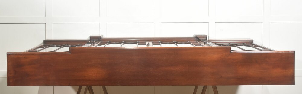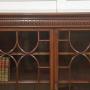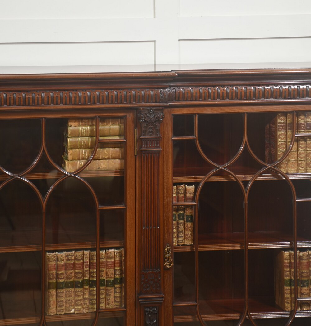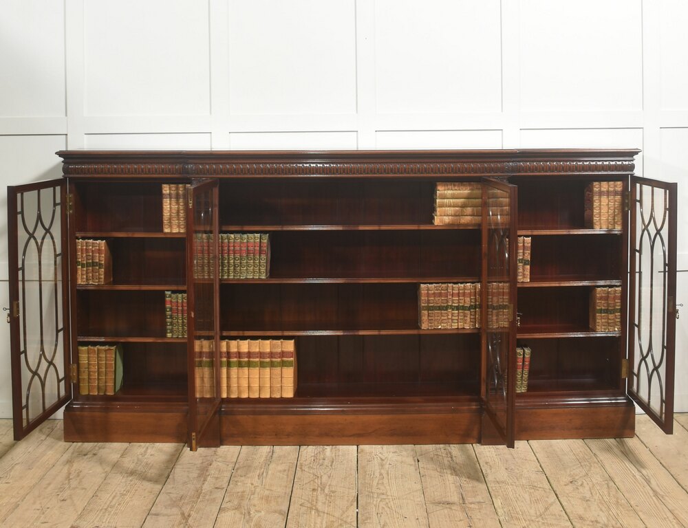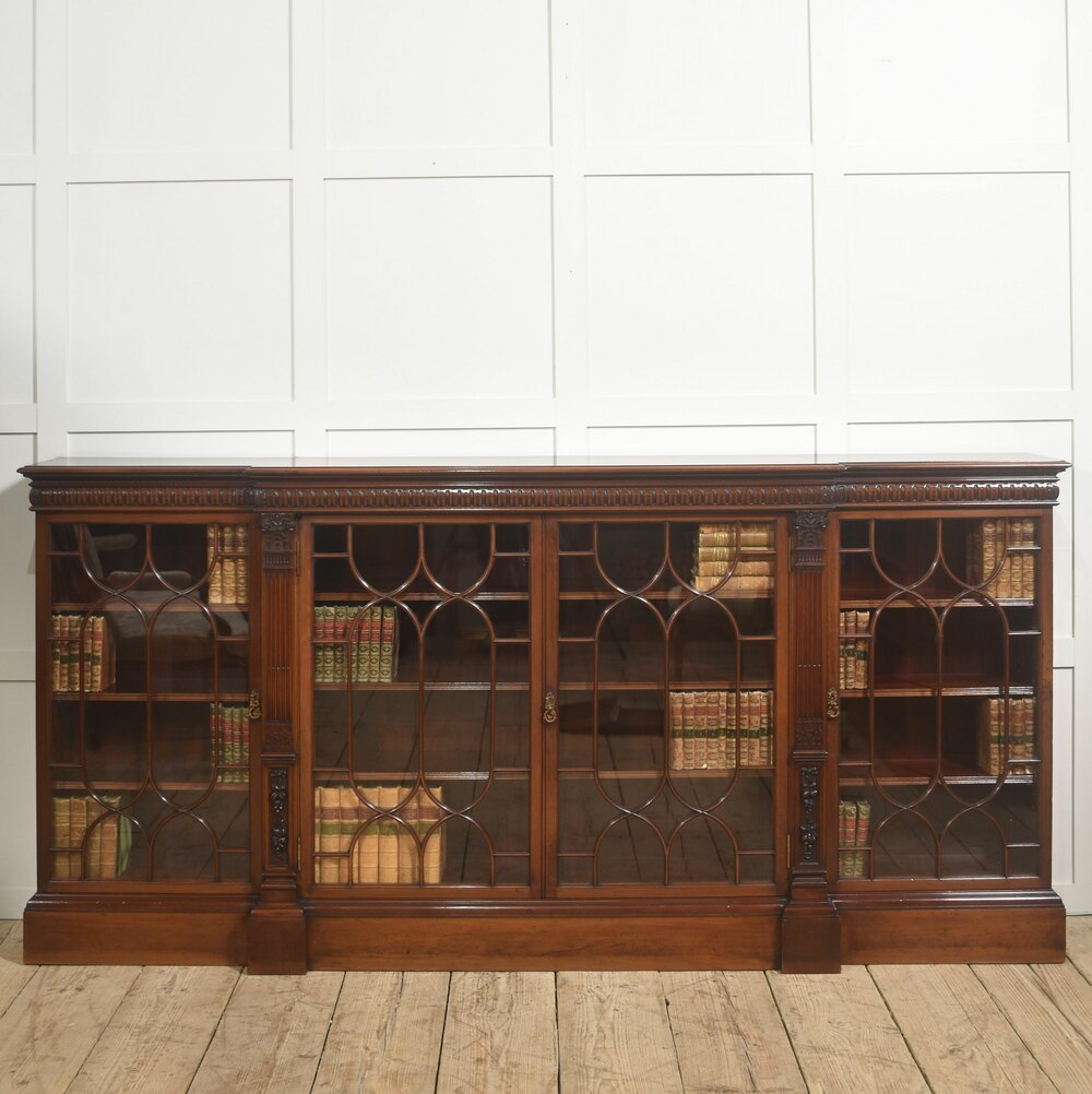 This impressive antique breakfront bookcase is crafted in richly figured mahogany and presents a refined interpretation of classical Georgian design, combining elegant proportions with finely executed decorative detail. The cabinet features a long, low breakfront form, with a subtly projecting central section flanked by slightly recessed end compartments, creating a balanced architectural silhouette well suited to both traditional libraries and refined interior spaces.The upper section is fitted with five glazed doors, each framed with finely shaped astragal glazing bars forming elegant intersecting oval and arch motifs. These decorative mullions lend the piece a distinctive visual rhythm while allowing a clear view of the interior shelving. The doors open smoothly on brass hinges and are finished with small decorative brass handles, providing access to spacious shelving within. Inside, the cabinet is lined in warm mahogany with multiple adjustable shelves, offering generous storage for books, decorative objects, or collections. The interior retains the same rich tone as the exterior, enhancing the overall sense of craftsmanship and continuity.
