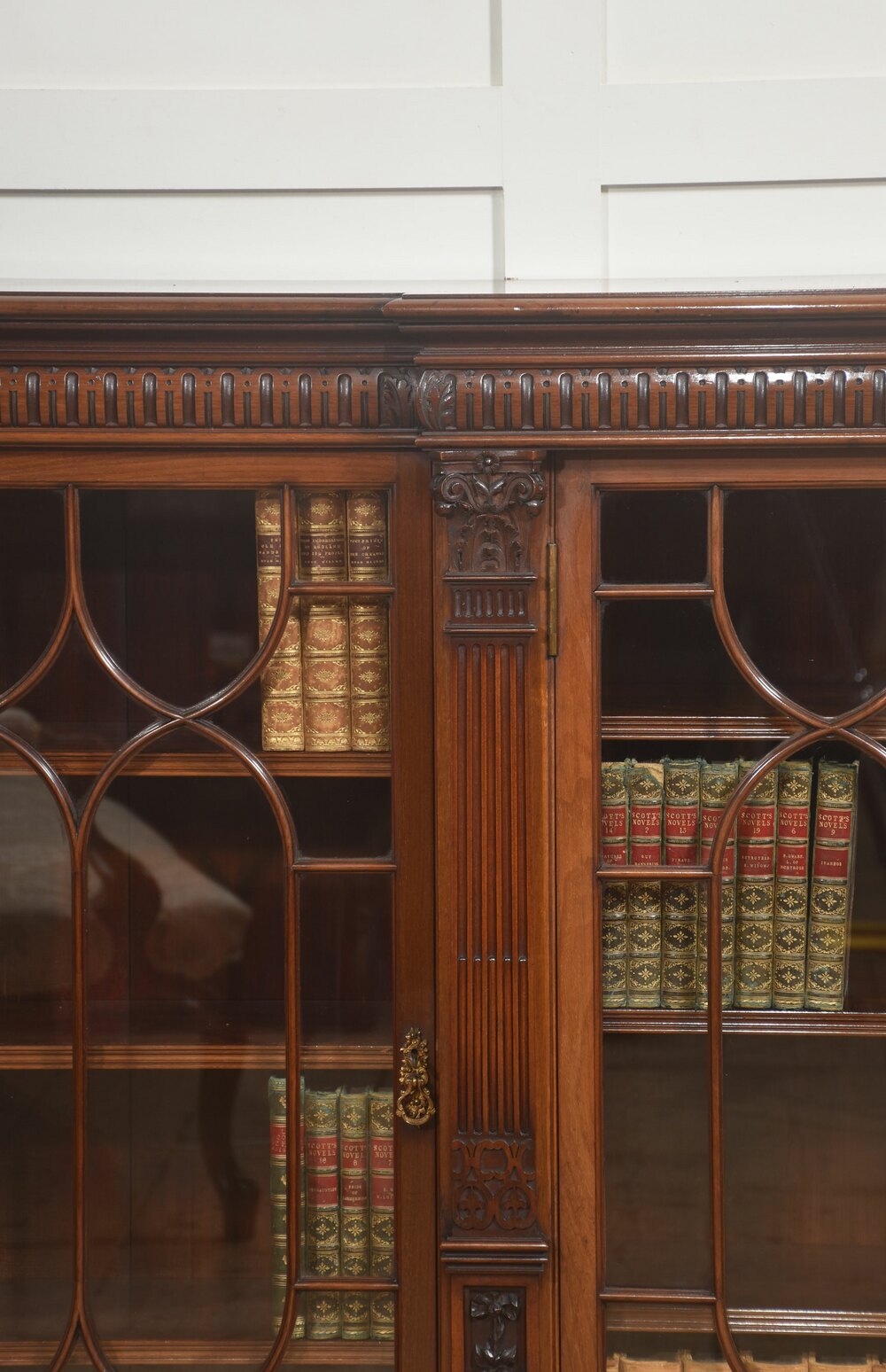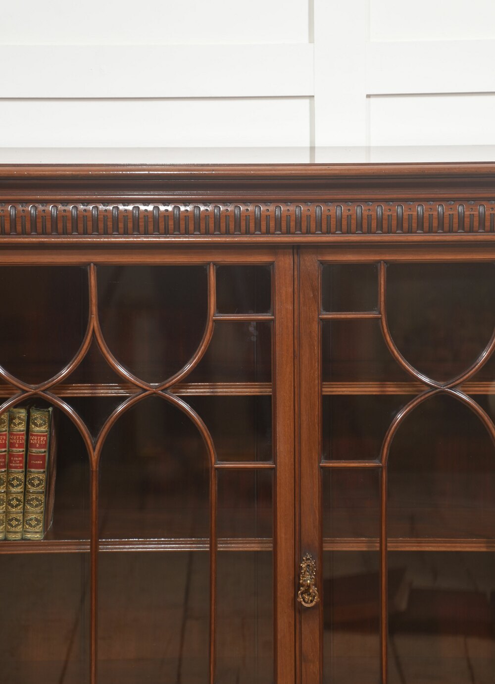 Between the glazed door sections, the bookcase is articulated with fluted pilasters that add vertical emphasis and classical character. These pilasters are further embellished with carved details, including floral and foliate motifs, lending the cabinet a subtle sense of ornament without overwhelming its elegant form. The upper frieze is decorated with a continuous carved dentil-style moulding that runs across the entire width of the bookcase, reinforcing the architectural inspiration behind the design and drawing the eye along the length of the piece.