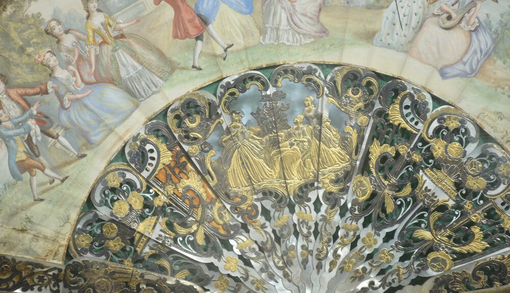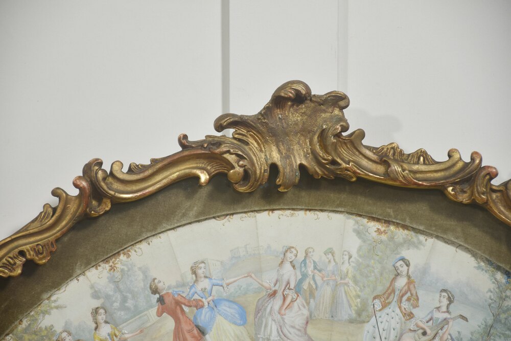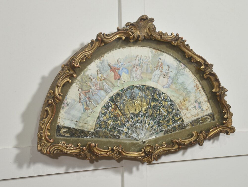 This wall-mounted decorative fan combines a finely crafted folding fan with an ornate Rococo-style frame intended for display. The painted leaf depicts an elegant pastoral fête galante scene, with figures in 18th-century court dress dancing and conversing in a garden setting, reflecting the Rococo revival taste popular in the later 19th century.The fan’s guards and sticks are intricately pierced and decorated with scrolling foliate and floral motifs highlighted with polychrome and gilded accents. At the center, a gilt cartouche with classical figures is surrounded by elaborate ornamental designs.