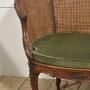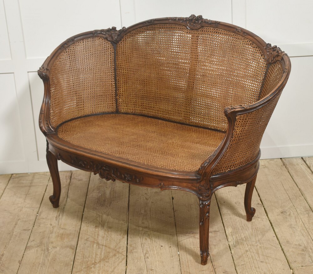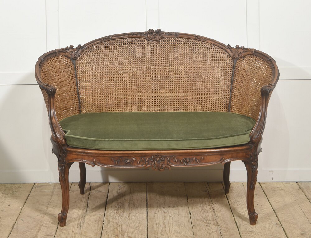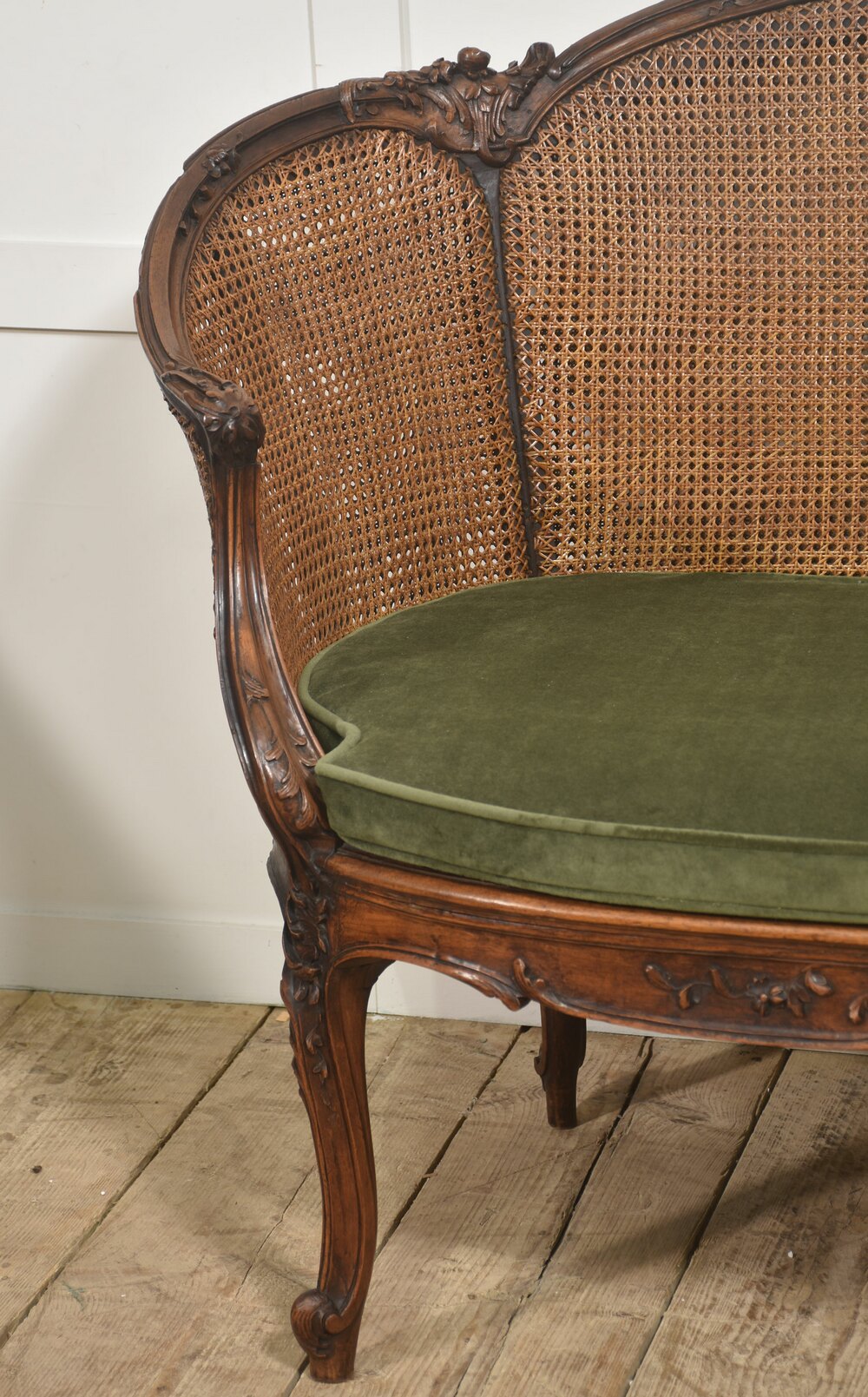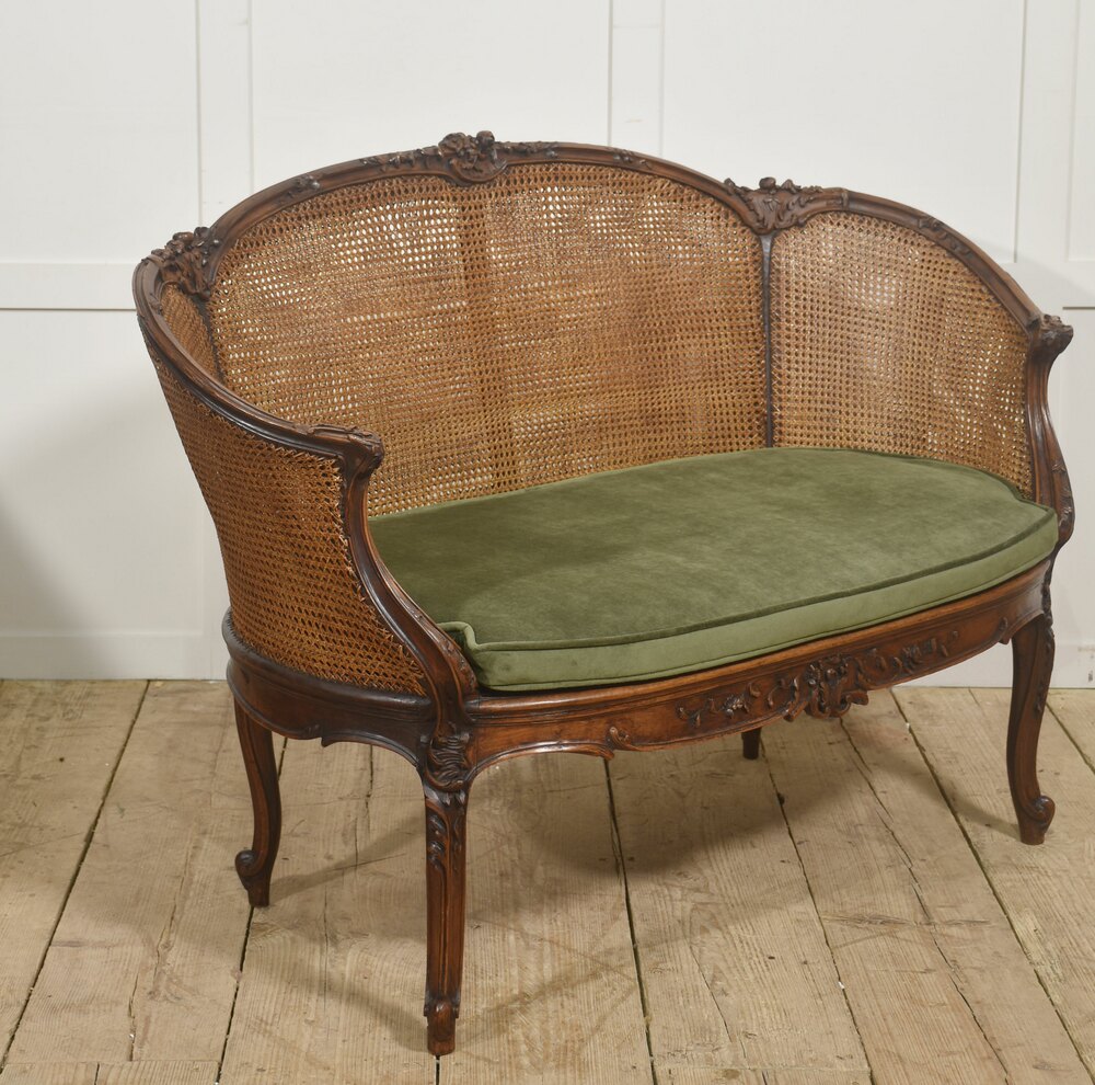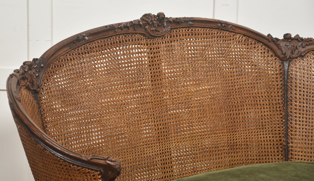 An elegant Louis XV–style caned bergère settee, crafted in richly toned carved walnut. The shaped frame features finely executed rococo ornament, including scrolling foliage and floral carving along the crest rail, apron, and cabriole legs. The serpentine top rail flows gracefully into outward-curving arms, creating a comfortable and visually balanced silhouette characteristic of 18th-century French design.The back and sides are fitted with tightly woven natural cane panels that provide both visual lightness and structural flexibility. The pierced caning wraps around the sides, forming an inviting enclosed seat typical of bergère forms. The seat retains a loose cushion upholstered in soft olive-green velvet, offering a pleasing contrast to the warm tone of the wood and the honeyed color of the cane.