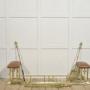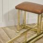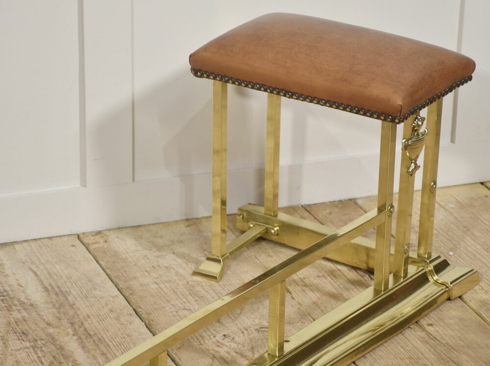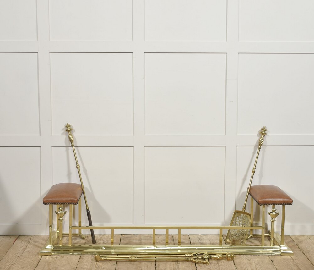 A polished brass club fender with upholstered leather end seats, designed for placement in front of a fireplace hearth. The architectural brass frame forms a long protective rail with integrated seating at each end, each stool topped with warm brown leather upholstery finished with decorative nailhead trim. Classical urn-form mounts add a subtle neoclassical detail to the otherwise clean, linear structure.Club fenders originated in English gentlemen’s clubs in the 19th century, where they allowed guests to sit comfortably close to the fire while the brass rail protected clothing from sparks and heat. This example combines practical function with elegant materials, the rich leather and bright brass creating a refined yet inviting appearance.