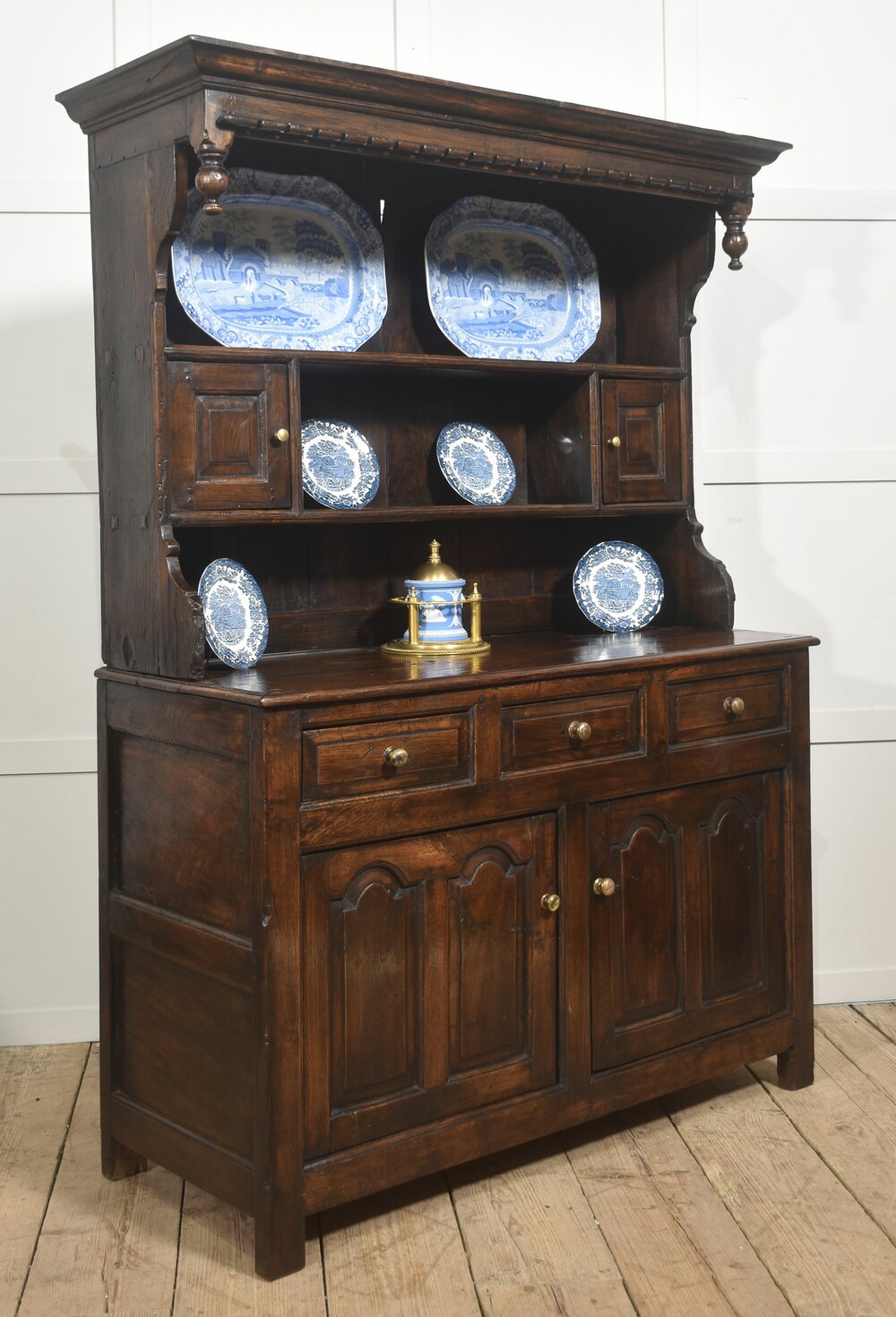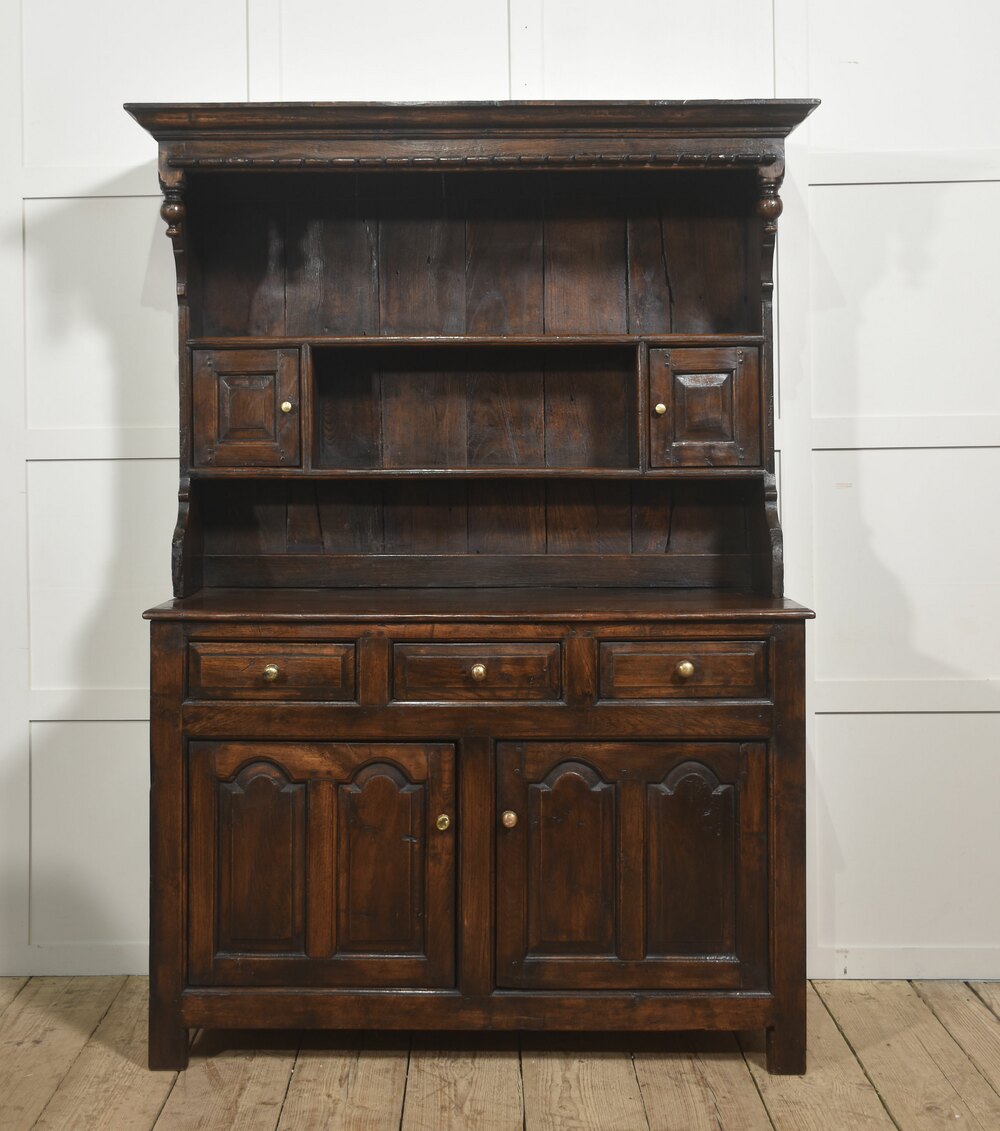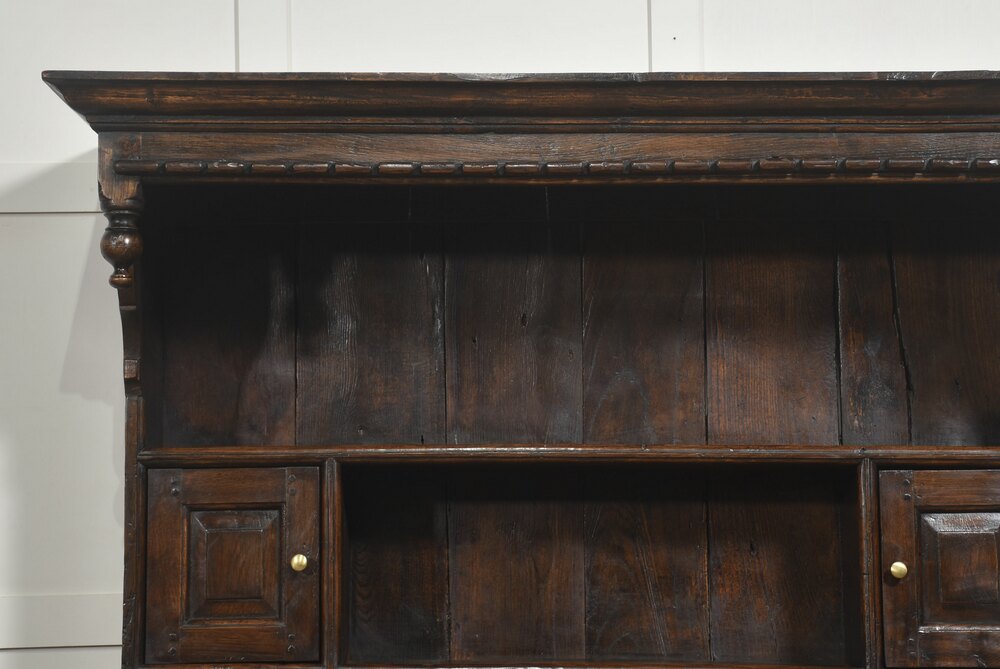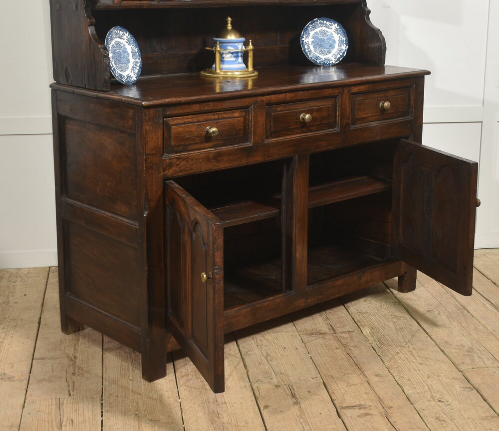 A substantial Welsh oak dresser and rack, probably South West Wales, dating from the late 18th or early 19th century. The rack is surmounted by a broad moulded cornice with dentil-style detailing and turned pendant drops, above open plate shelves with a boarded back. A central open compartment is flanked by small panelled cupboard doors, providing useful enclosed storage alongside display space.The dresser base is fitted with three frieze drawers retaining turned brass knobs, above a pair of panelled cupboard doors enclosing a shelved interior. The sides are of simple framed construction and the piece stands on sturdy square legs. The oak throughout displays attractive grain and a rich, deep patina developed through age and use.