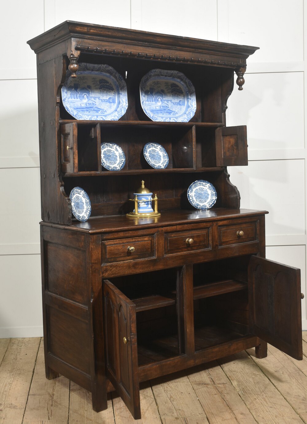 A characterful example of traditional Welsh vernacular furniture, combining practical storage with ample space for the display of ceramics and domestic wares.