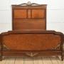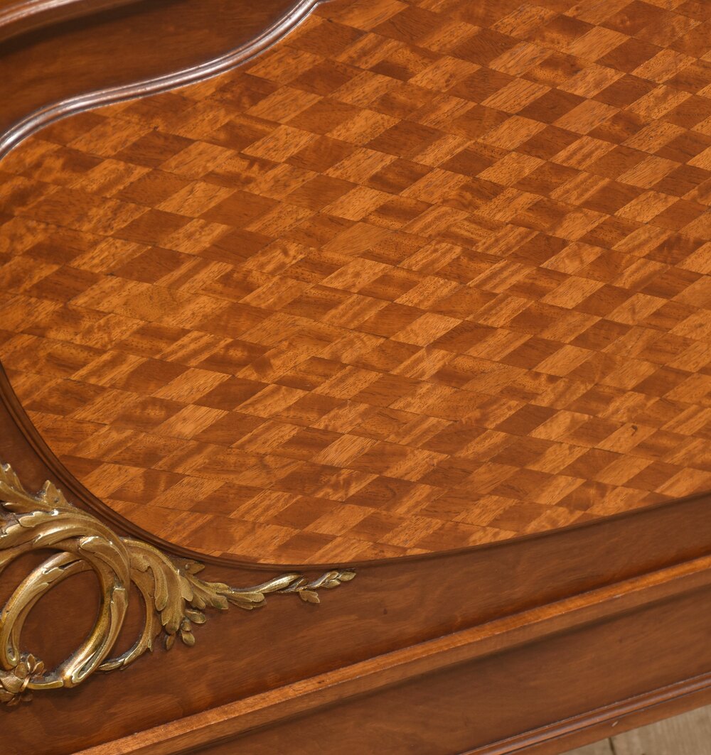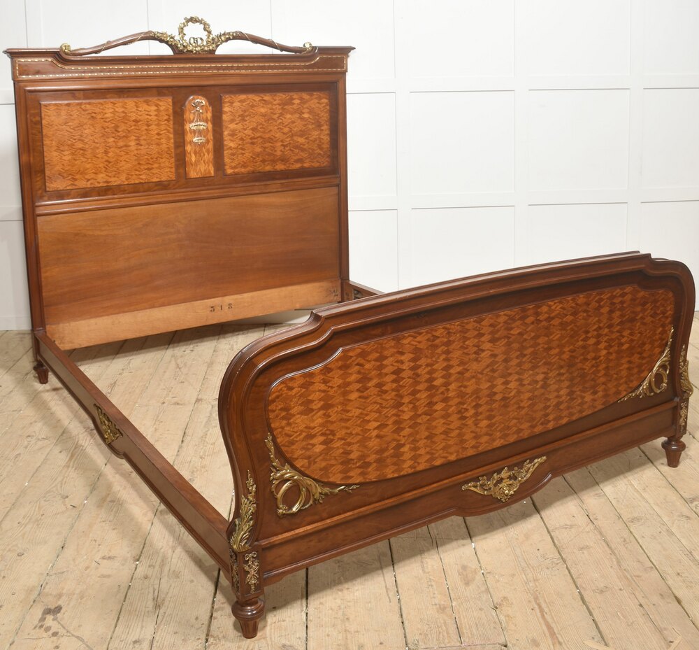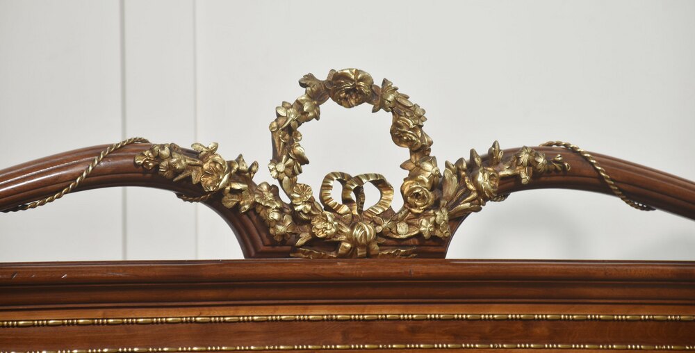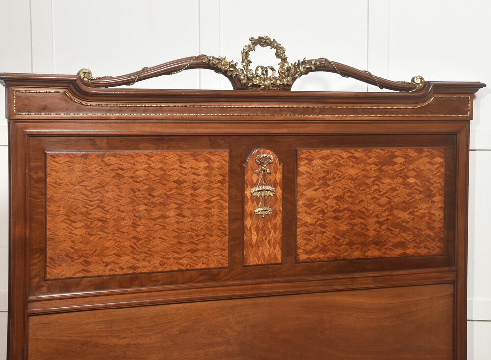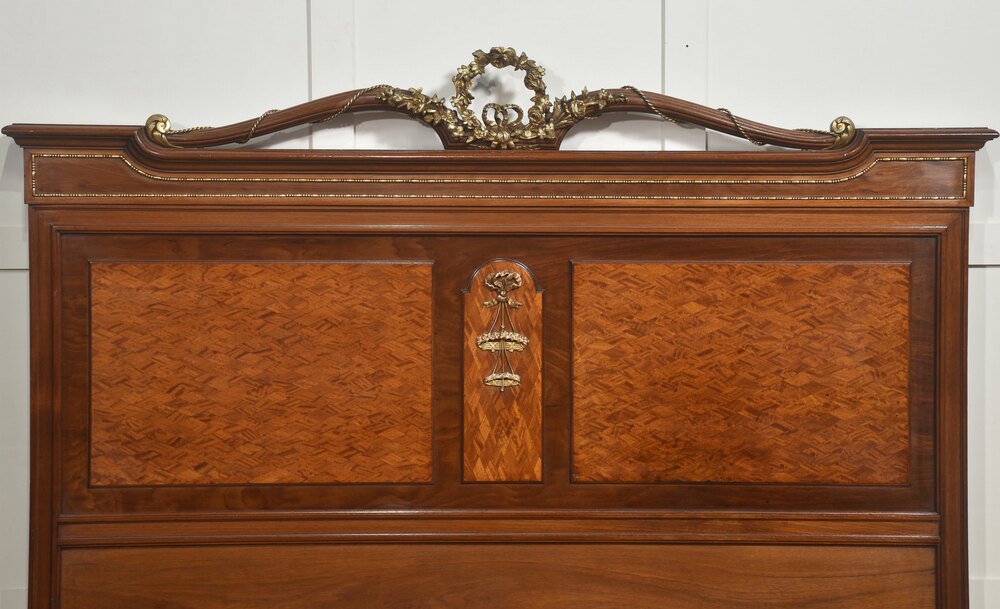 A finely made Louis XVI style mahogany double bed of elegant proportions, richly decorated with figured veneers and gilt bronze mounts. The serpentine shaped headboard is surmounted by a pierced gilt bronze cresting formed as a floral wreath enclosing a ribbon-tied motif, with trailing garlands extending across the top rail. Below, the headboard features finely figured parquetry panels framed within moulded mahogany borders, centred by an applied gilt bronze trophy ornament of suspended baskets and ribbons.The shaped footboard mirrors the refined craftsmanship of the headboard, with a broad central parquetry panel displaying striking geometric figuring. The corners are adorned with scrolling gilt bronze foliate mounts, while the lower frieze is centred by an additional gilt bronze cartouche. The uprights terminate in tapering turned feet, each decorated with further gilt bronze appliqués, reinforcing the classical Louis XVI aesthetic.