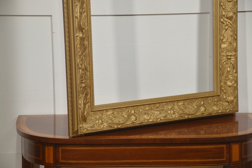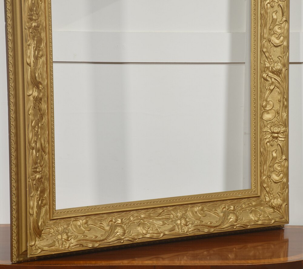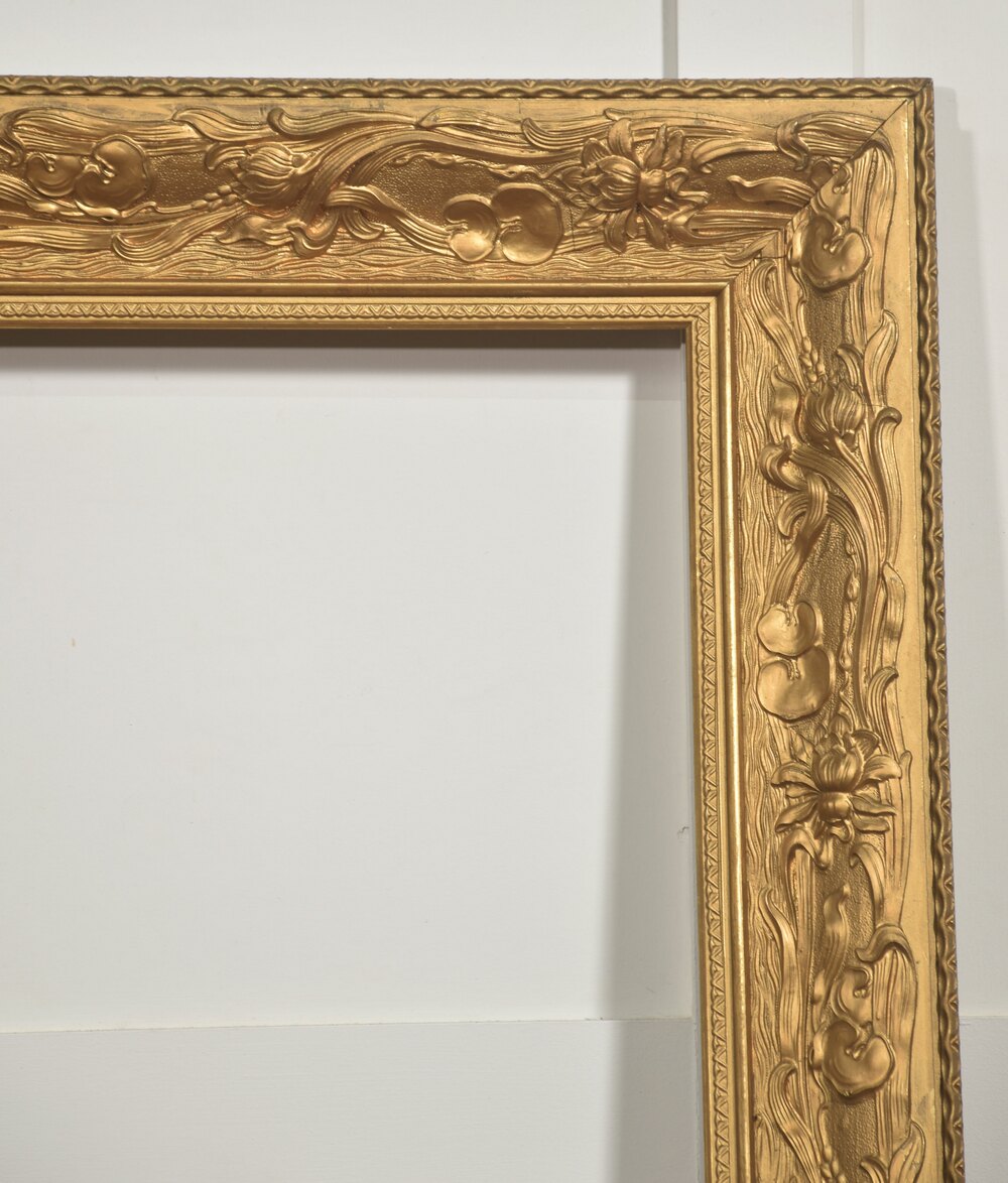 A large decorative giltwood picture frame, of rectangular form, richly moulded with continuous high-relief ornament. The broad frieze is decorated with flowing Art Nouveau–inspired foliate scrolls interspersed with stylised blossoms and fruiting motifs, the sinuous stems running rhythmically around the frame. The inner sight edge is defined by a narrow geometric border, while the outer edge is finished with a small bead-and-reel style moulding.The surface is finished in a warm matte gilt, emphasising the depth and movement of the carving.