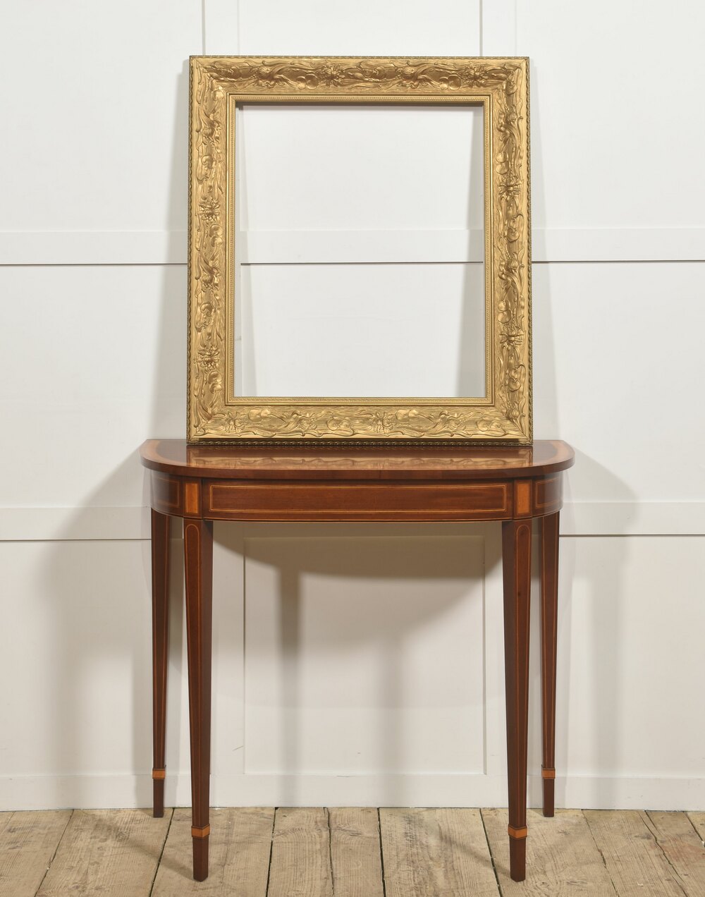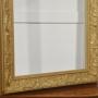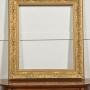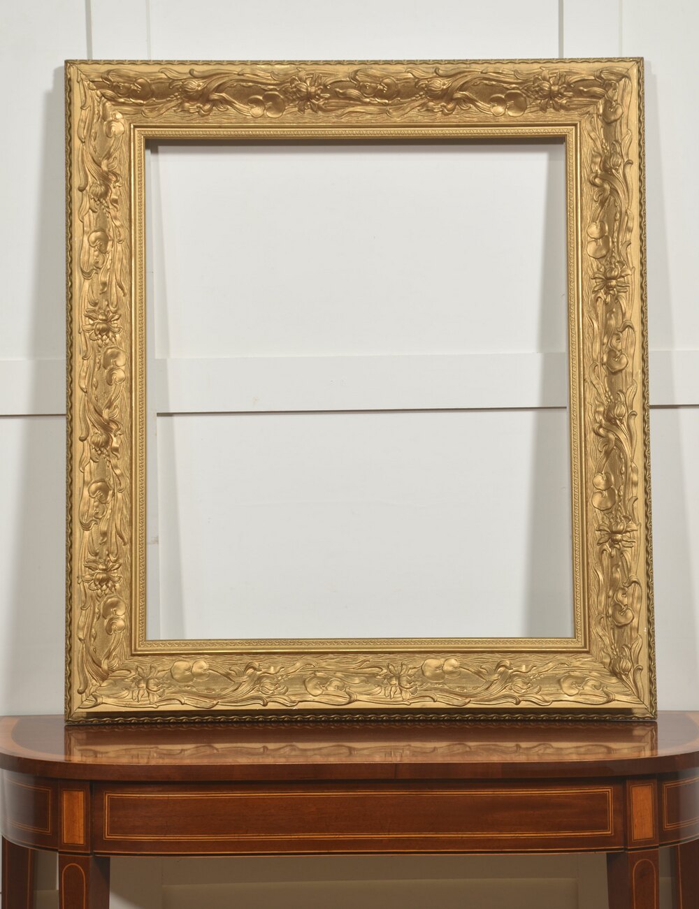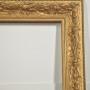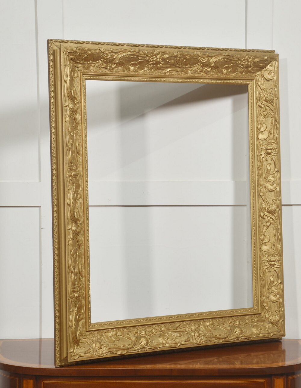 A large decorative giltwood picture frame, of rectangular form, richly moulded with continuous high-relief ornament. The broad frieze is decorated with flowing Art Nouveau–inspired foliate scrolls interspersed with stylised blossoms and fruiting motifs, the sinuous stems running rhythmically around the frame. The inner sight edge is defined by a narrow geometric border, while the outer edge is finished with a small bead-and-reel style moulding.The surface is finished in a warm matte gilt, emphasising the depth and movement of the carving.