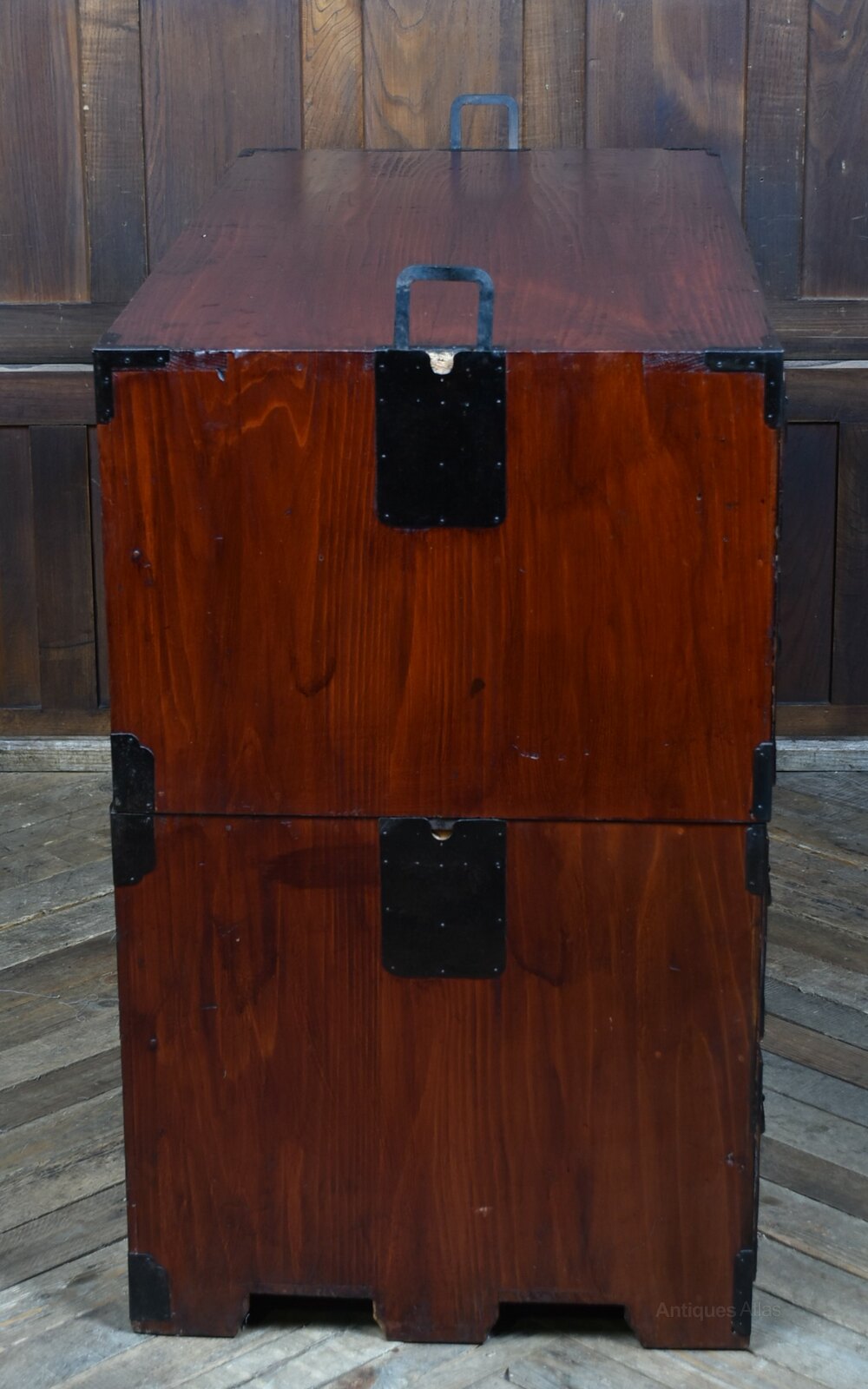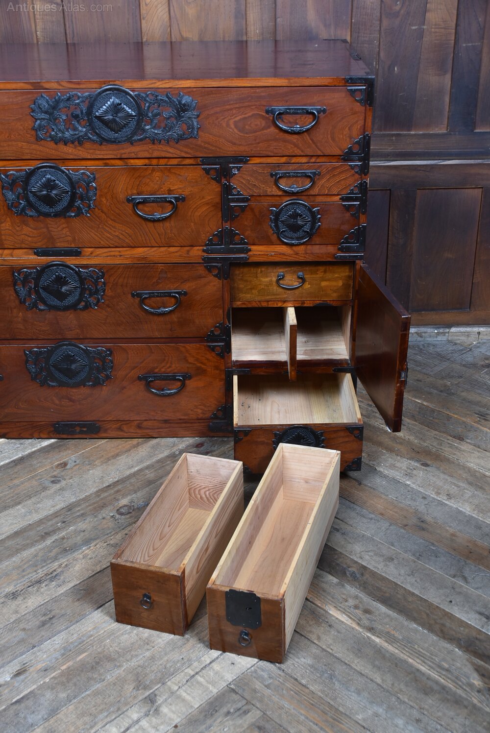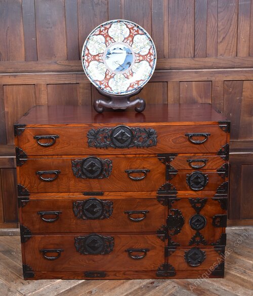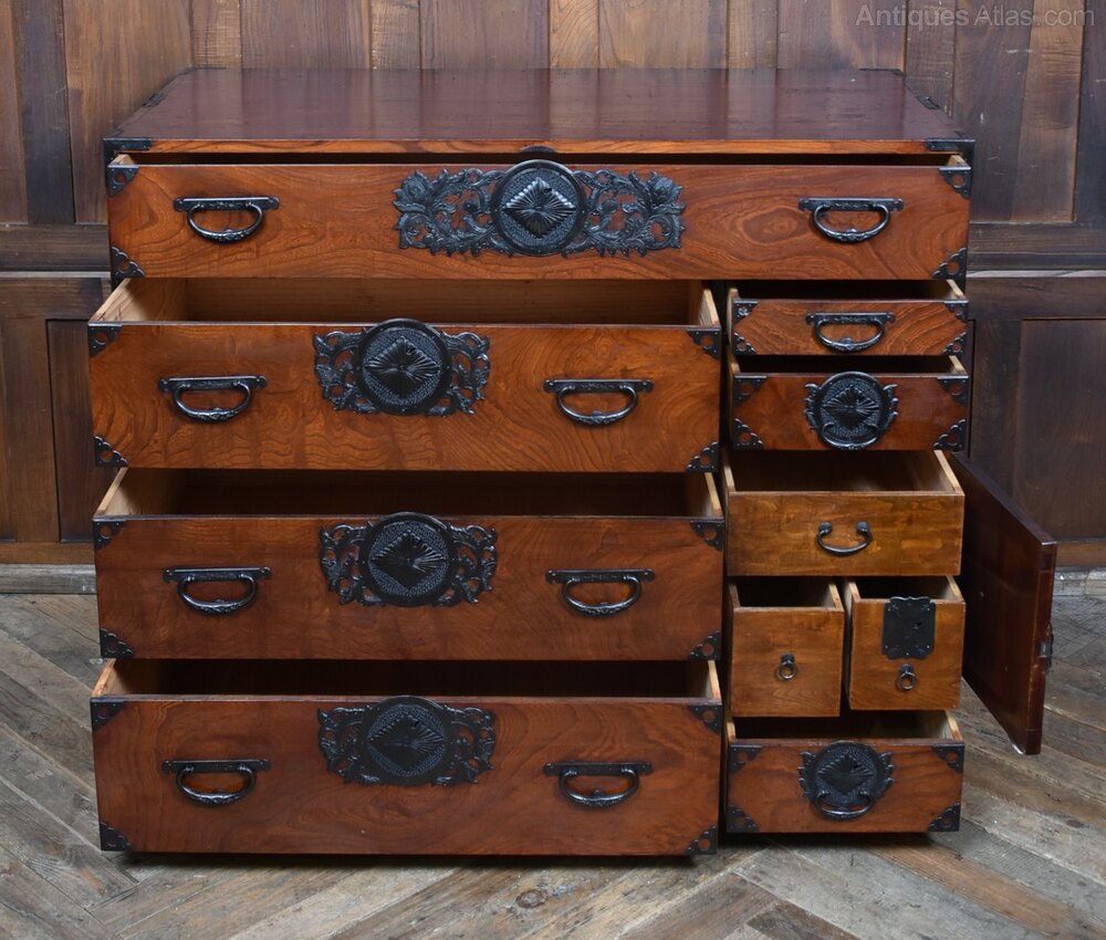 A fantastic Japanese Tansu chest in original condition, crafted from richly grained cedar and adorned with traditional iron hardware. This two-part chest features multiple drawers and compartments, each fitted with ornate black metal handles and decorative mounts showcasing circular and floral motifs. The ironwork is all original, with side-mounted carry handles—one set designed to flip up and secure the upper section to the base.Over years of use, the chest has acquired subtle imperfections that only enhance its character and authenticity. A fine example of Meiji-period craftsmanship, it offers both aesthetic appeal and practical storage, making it a striking addition to any interior.