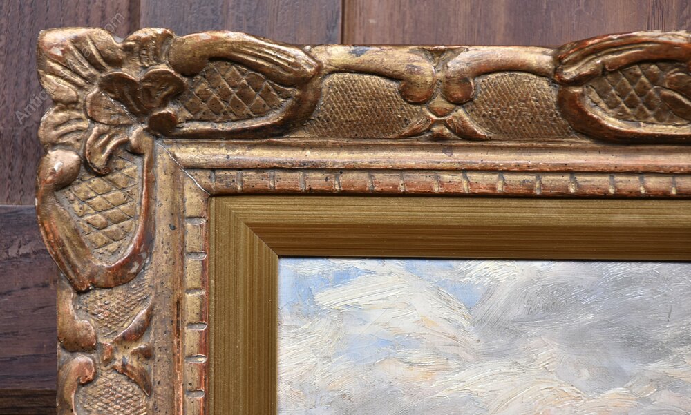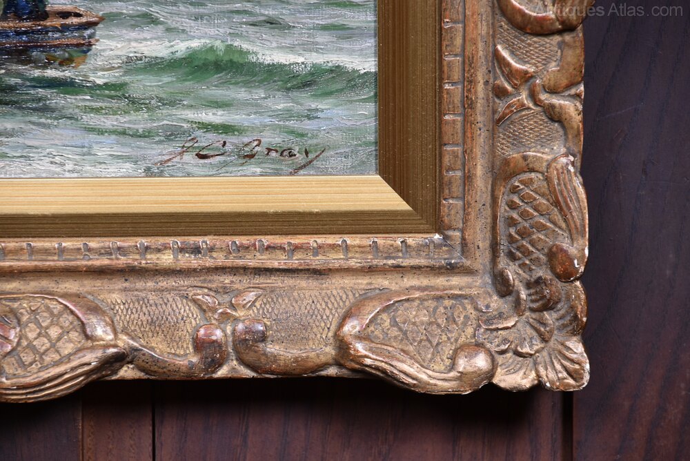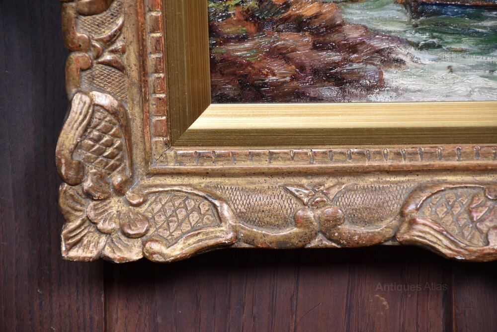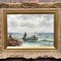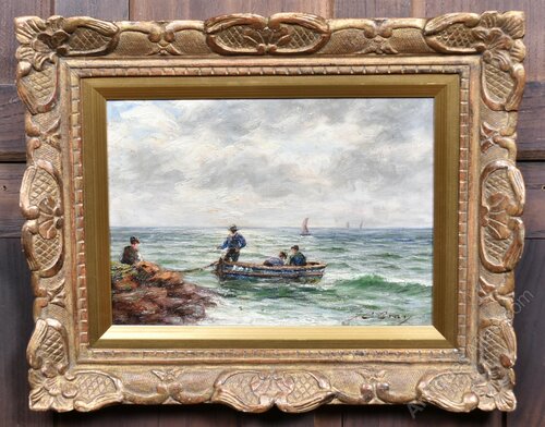 A beautifully executed oil on canvas by accomplished British artist J.C. Gray, signed lower right and offered in excellent antique condition. This atmospheric coastal scene captures a small boat preparing to cast off from a rocky shore, with three figures aboard and a fourth gesturing from land. he sea is rendered with lively, textured brushwork that conveys movement and breeze, while distant sailboats and a clouded sky suggest the vastness and unpredictability of the maritime setting. The palette is soft and naturalistic, with gentle blues, greys, and ochres that heighten the mood and realism. Presented in an ornate gilded frame with intricate carvings, the piece exudes timeless elegance. The frame shows light age-related wear, consistent with its period, but remains a characterful and sympathetic complement. Full of charm and presence, it would make a striking addition to any interior.J.C. Gray was a British painter active in the late 19th and early 20th centuries, known for his evocative depictions of rural and coastal life.