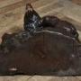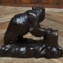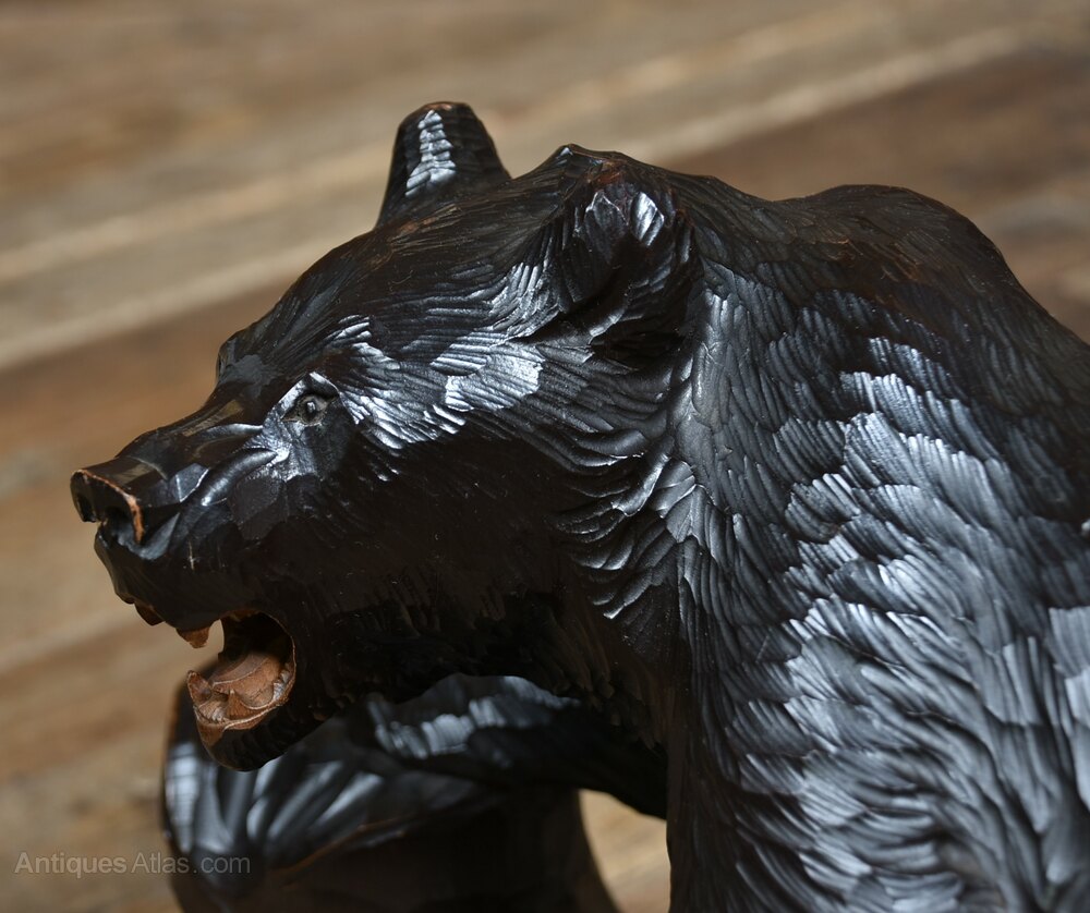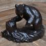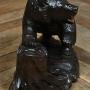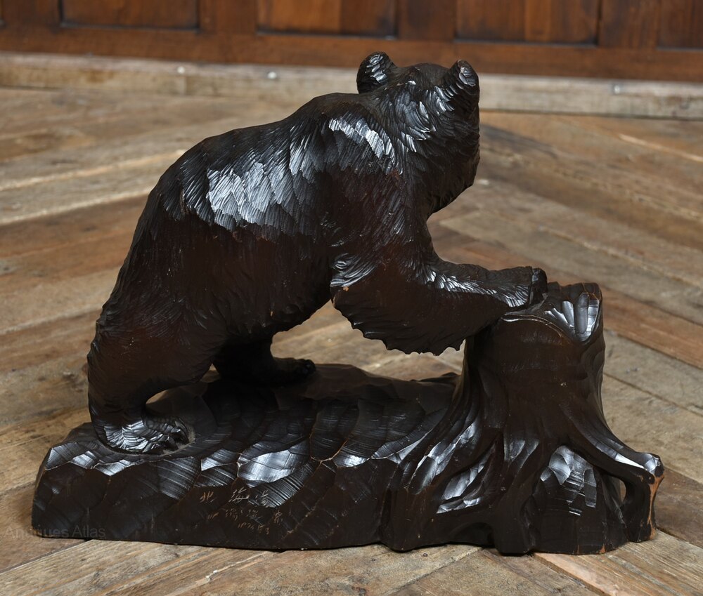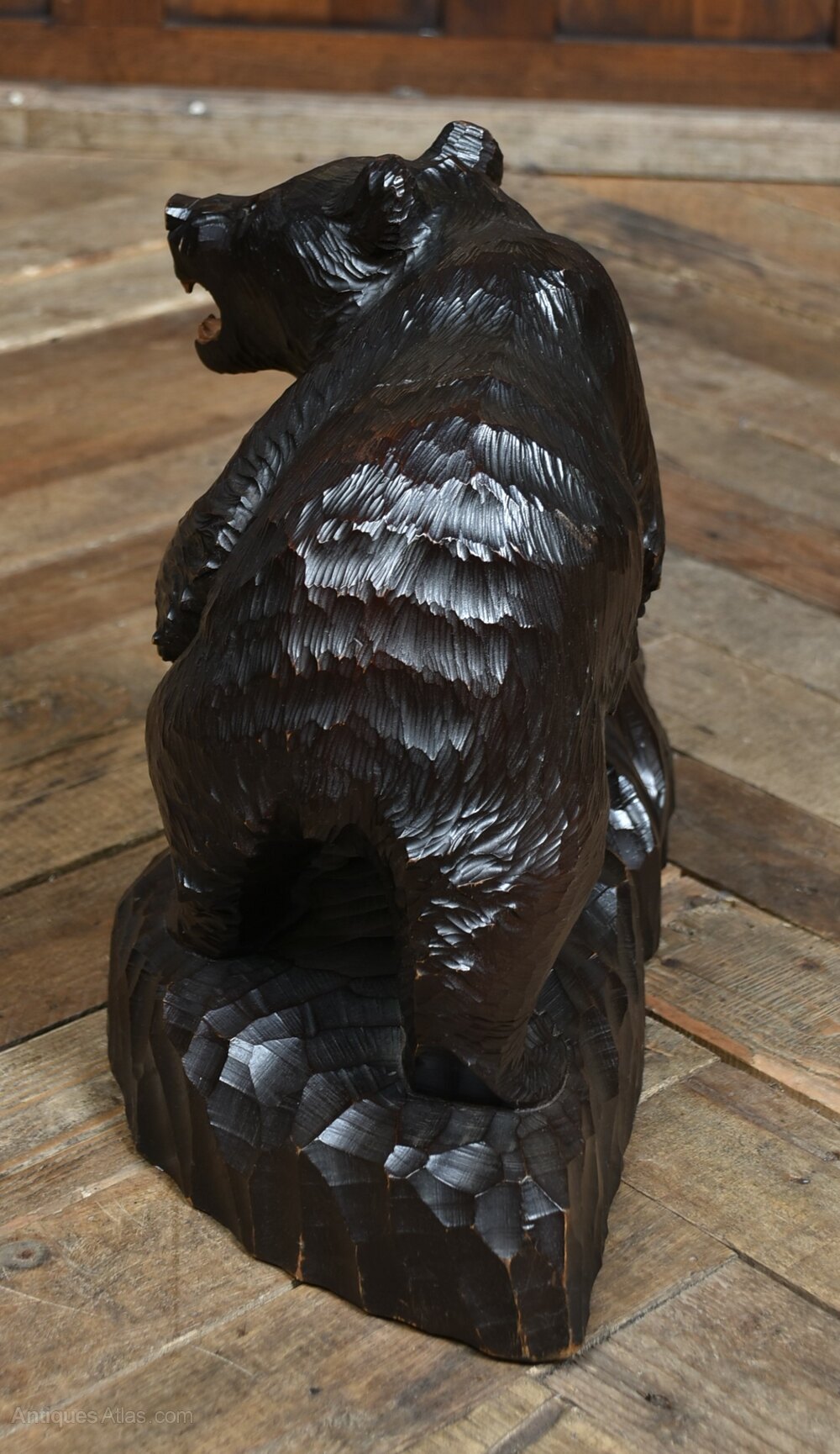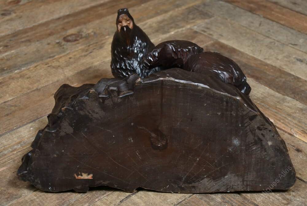 A wonderful Japanese carved wooden bear in excellent antique condition. The bear is rendered in a deep, rich brown and shown in a powerful stance, one paw raised and resting on a tree stump. The sculptor has worked the timber with exceptional skill, carving deeply textured fur, sharply defined claws, and an expressive open mouth that lends the piece a vivid sense of movement and presence. Its naturalistic base, shaped to evoke roots or forest terrain, grounds the composition and heightens its sculptural drama. A fine example of Kibori Kuma carving, it embodies the rich folk-art tradition of Hokkaido and the craftsmanship for which these iconic works are celebrated.Internal Reference: SAI4039