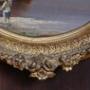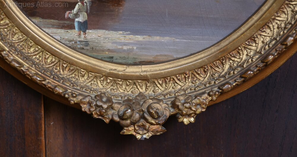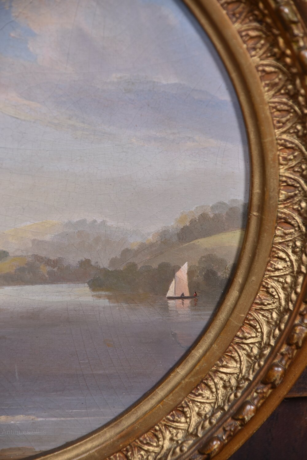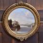 A charming oil on board depicting a tranquil riverside scene in excellent antique condition. A lone figure stands at the water’s edge, while a pair of thatched cottages sit above the riverbank, nestled into the landscape. A sailing boat drifts across the water in the distance, and soft rolling hills fade gently into the horizon beneath a lightly clouded sky. The composition is framed by an ornate circular surround with finely carved floral and foliate motifs, adding a decorative and classical touch that complements the pastoral subject. Like all antiques there are imperfections however this is a beautifully atmospheric piece, full of warmth and quiet rural character.Internal Reference: SAI4043