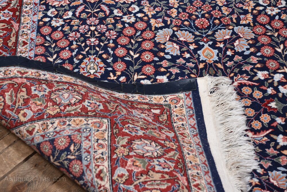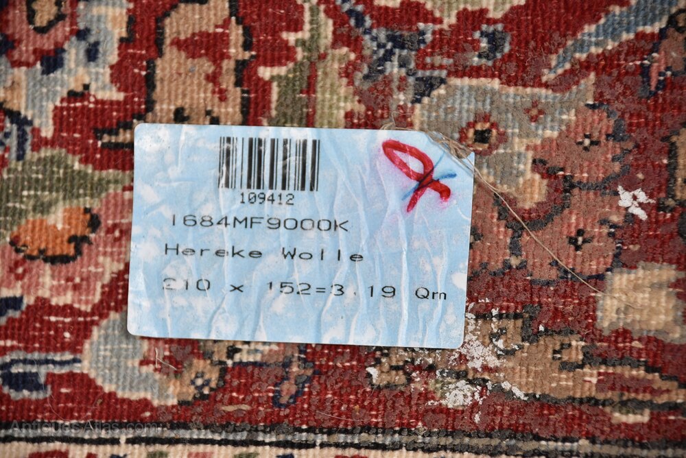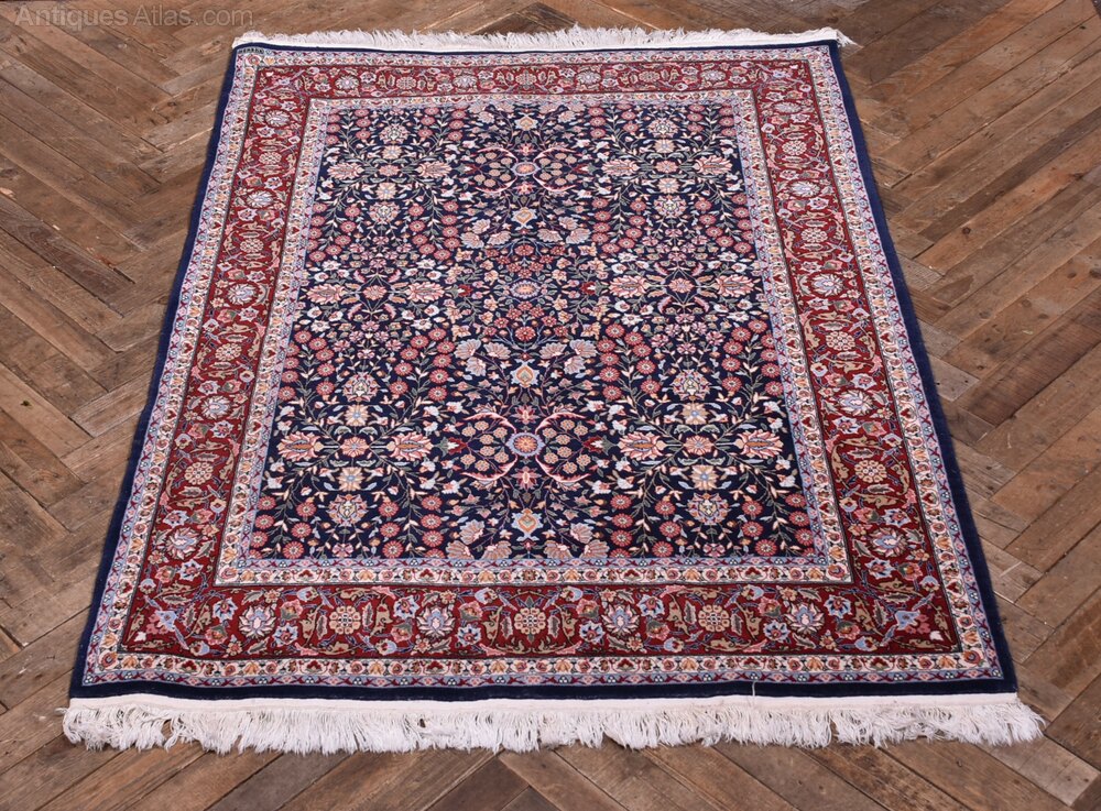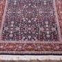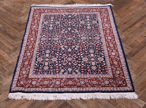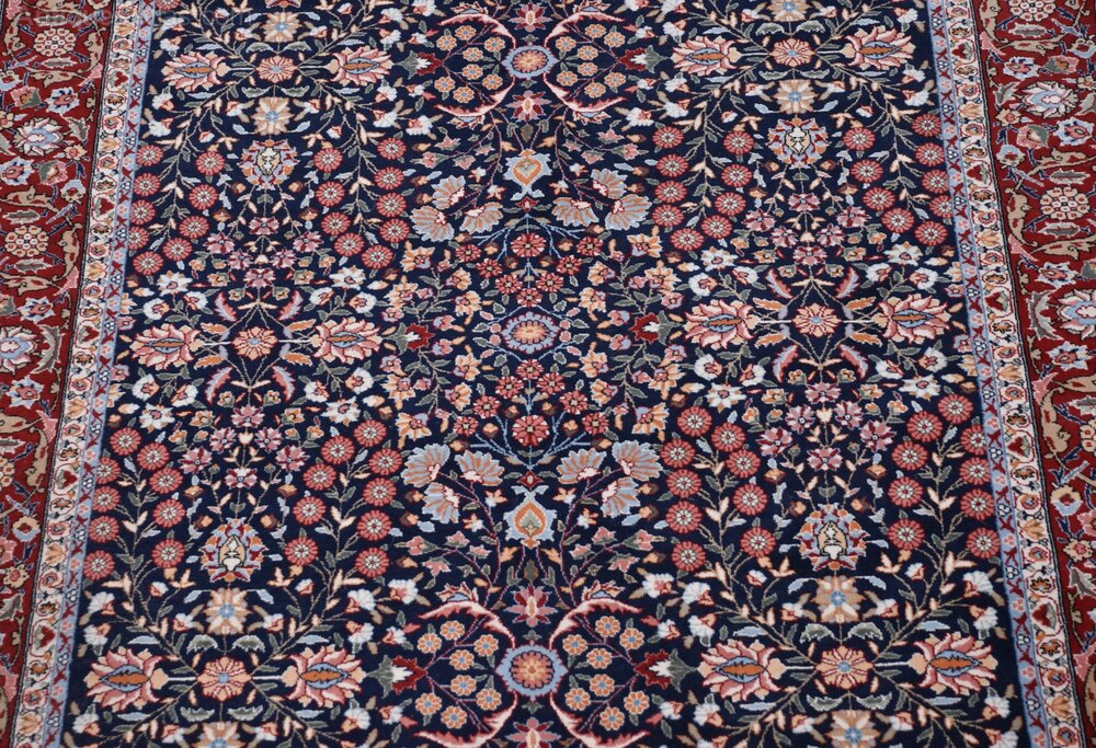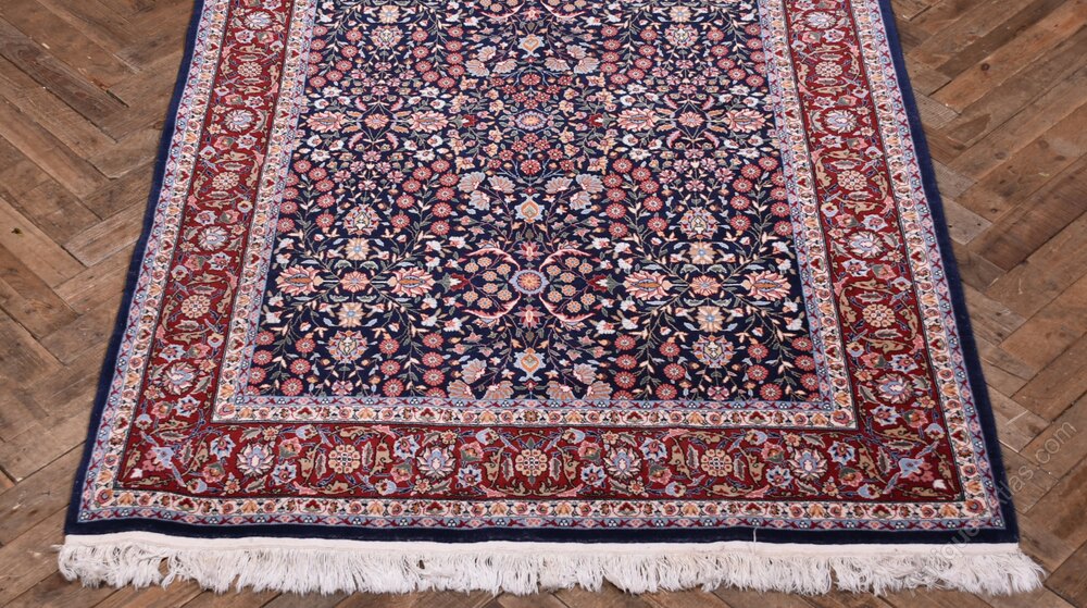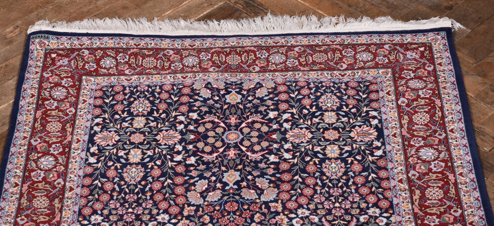 A finely woven Hereke wool rug displaying a richly detailed floral and geometric design in deep navy, soft reds, ivory, and pale blues. The central field is densely patterned, creating a sense of movement and intricacy, while the surrounding borders frame the composition with classic Hereke motifs. The colours are vibrant and the wool pile has a pleasing softness. The craftsmanship is evident in the clarity of the pattern and the tightness of the weave. Completed with hand-knotted fringe and vivid colouration, this rug is both visually captivating and of exceptional quality. Its timeless design and rich character make it a stunning addition to any interior, be it classic or contemporary. A beautifully made piece that would add warmth, colour, and character to a living room, study, or bedroom.Internal Reference: SAI4047