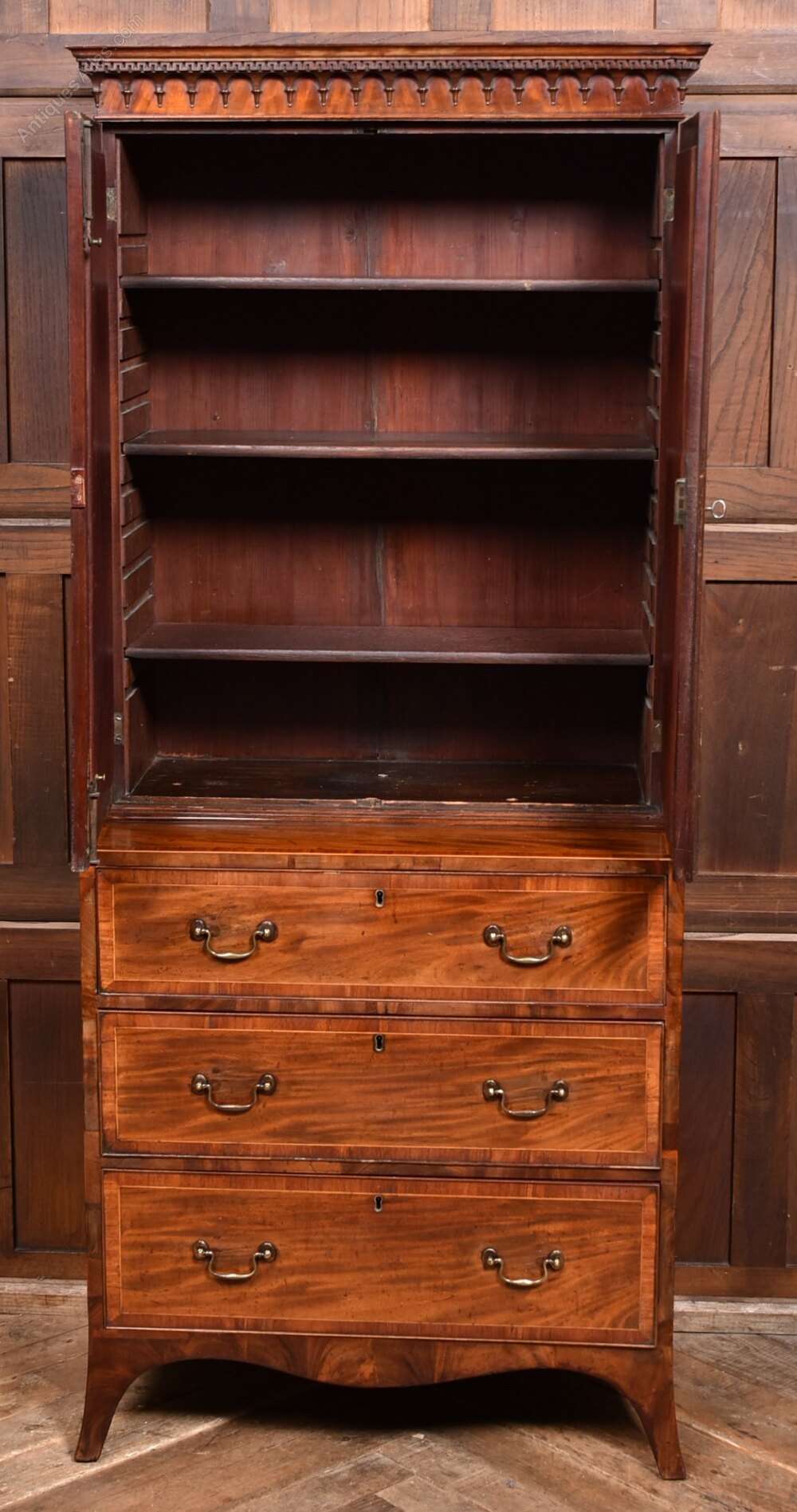 A fine Georgian mahogany secretaire of elegant proportions, offered in excellent antique condition and complete with a working key. This handsome piece separates into two sections, making it practical to move and position within the home. The upper cabinet is crowned with a decorative moulded cornice and fitted with a pair of beautifully inlaid doors with oval panels, opening to reveal an adjustable shelved interior. The base features three drawers, with the top drawer opening as a fall‑front to reveal a green baize writing surface and an interior fitted with small drawers and pigeonholes — a lovely display of the refined craftsmanship and decorative detail characteristic of the period. Below sit two full‑width drawers with their original brass handles and central keyholes, offering generous additional storage. The mahogany has developed a warm, even patina with attractive grain and colour throughout. As with all antique furniture, minor age‑related marks are present, but the secretaire remains solid, well cared for, and wonderfully functional. A distinguished and versatile piece that brings both practicality and Georgian.Internal Reference: SAI4050