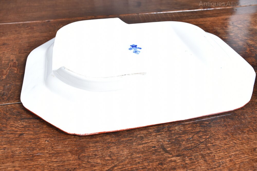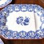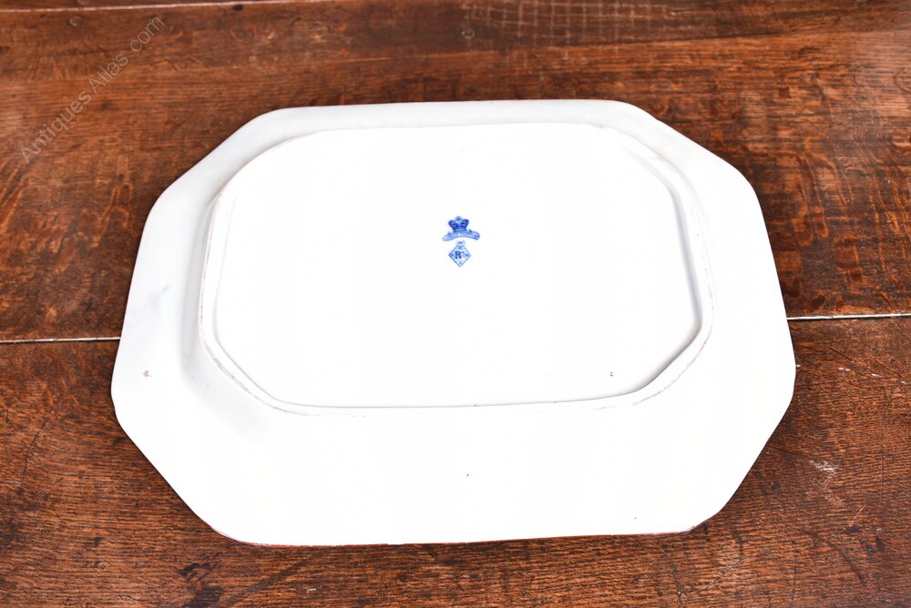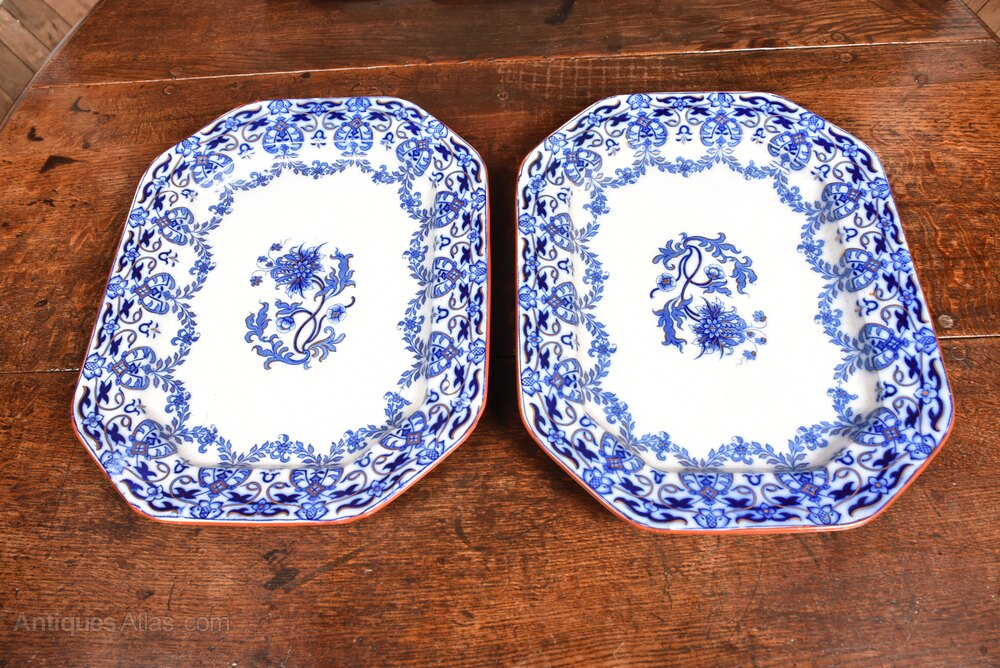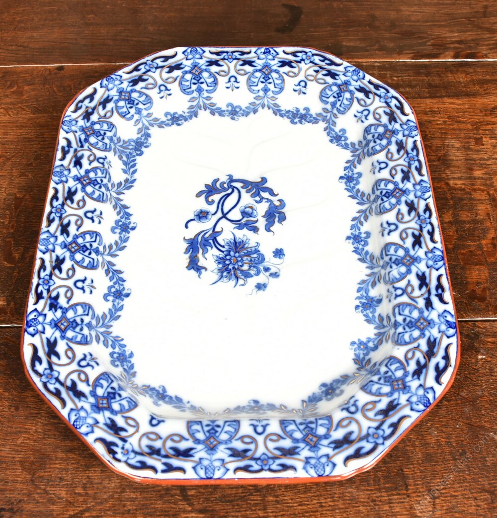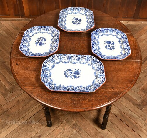 A beautiful set of four octagonal ashetts, each displaying a clean white ground enriched with finely detailed blue floral decoration. The borders are embellished with scrolling foliate motifs and stylised blossoms, framing a central floral medallion. The transfer-printed design reflects the romantic botanical tastes that flourished in Victorian Britain. Their octagonal form, softened at the corners, is typical of mid-19th-century serving wares, traditionally used for presenting meats, fish, or vegetables. The reverse bears both the diamond-shaped British registration mark and the Indian Festoon pattern stamp, confirming their period authenticity.Internal Reference: SAI4064