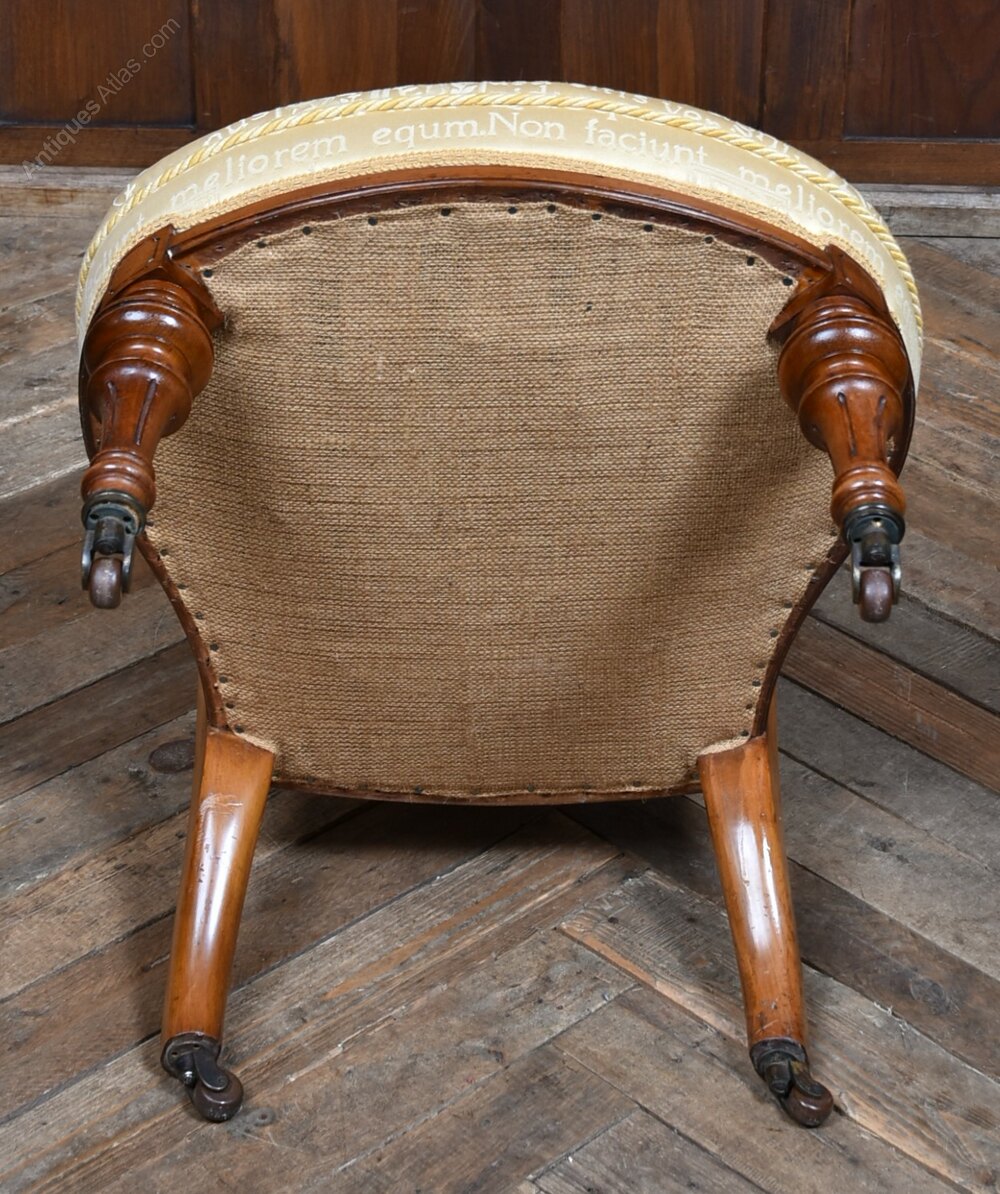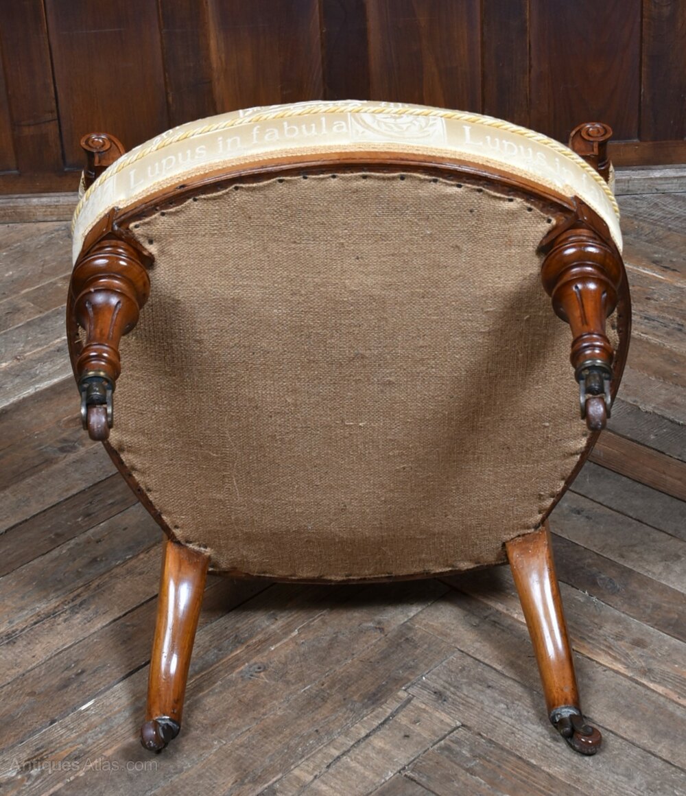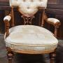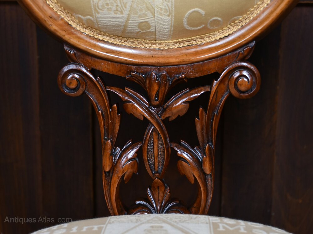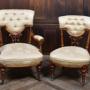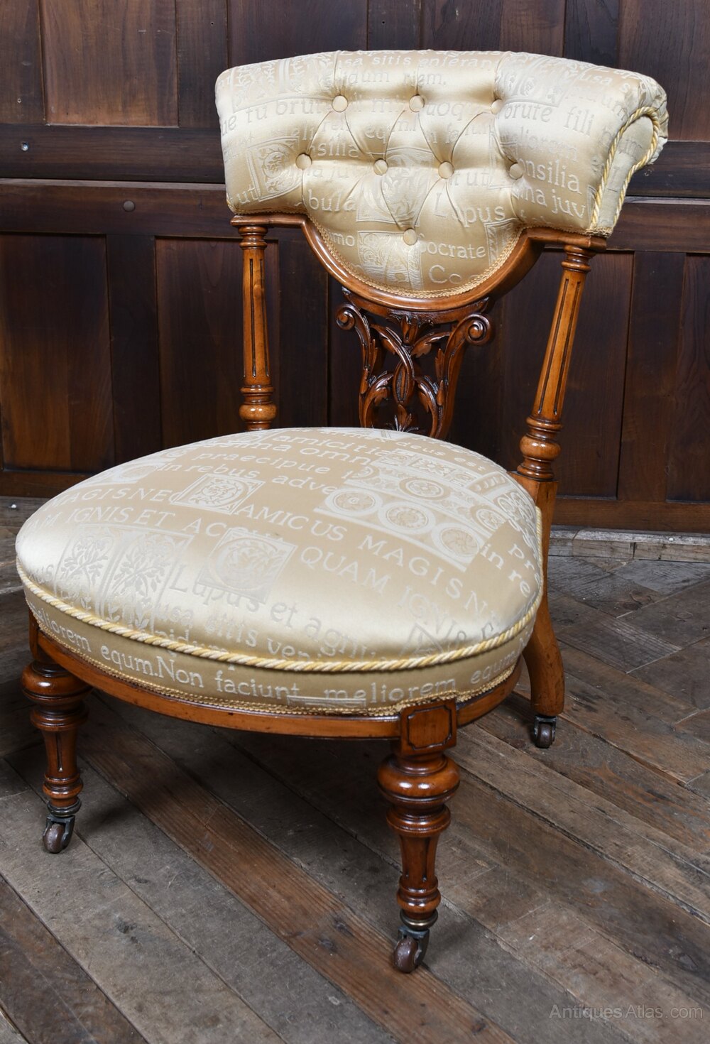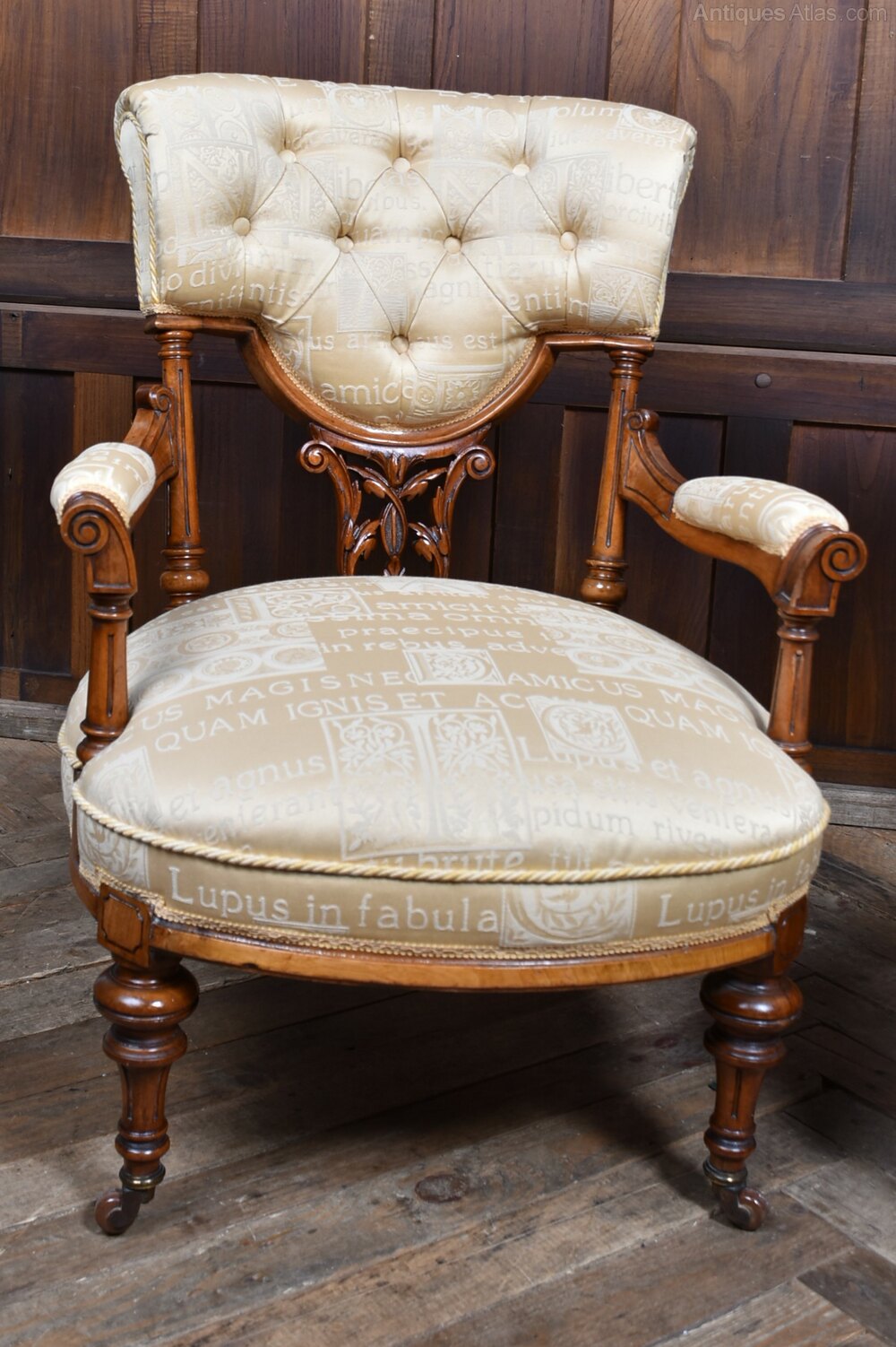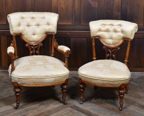 A charming pair of walnut parlour chairs, traditionally referred to as “his and hers,” each with beautifully carved frames and upholstered in a classical printed fabric. The larger armchair, the “his” chair, offers a generous and comfortable seat, while the slightly smaller side chair provides a more delicate companion piece, creating a balanced and elegant pair. Both chairs feature button‑tufted backs, shaped supports, and cabriole‑influenced legs, giving them a refined silhouette and a warm, inviting presence. The walnut frames display attractive colour and patina, enhancing their decorative appeal. A lovely duo for a bedroom, sitting room, or hallway, full of character and ready to place.Internal Reference: SAI4066