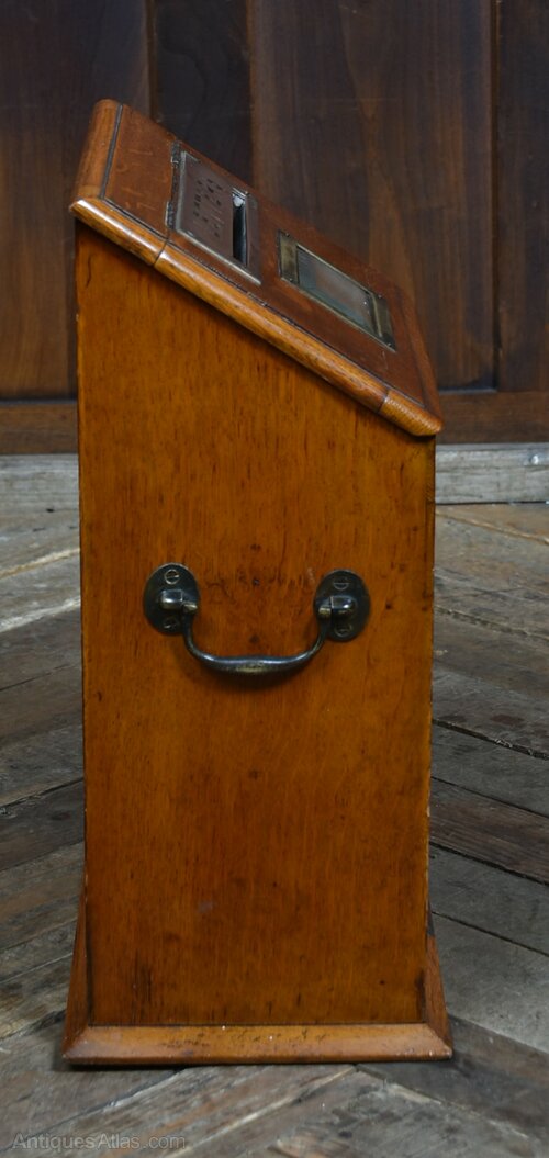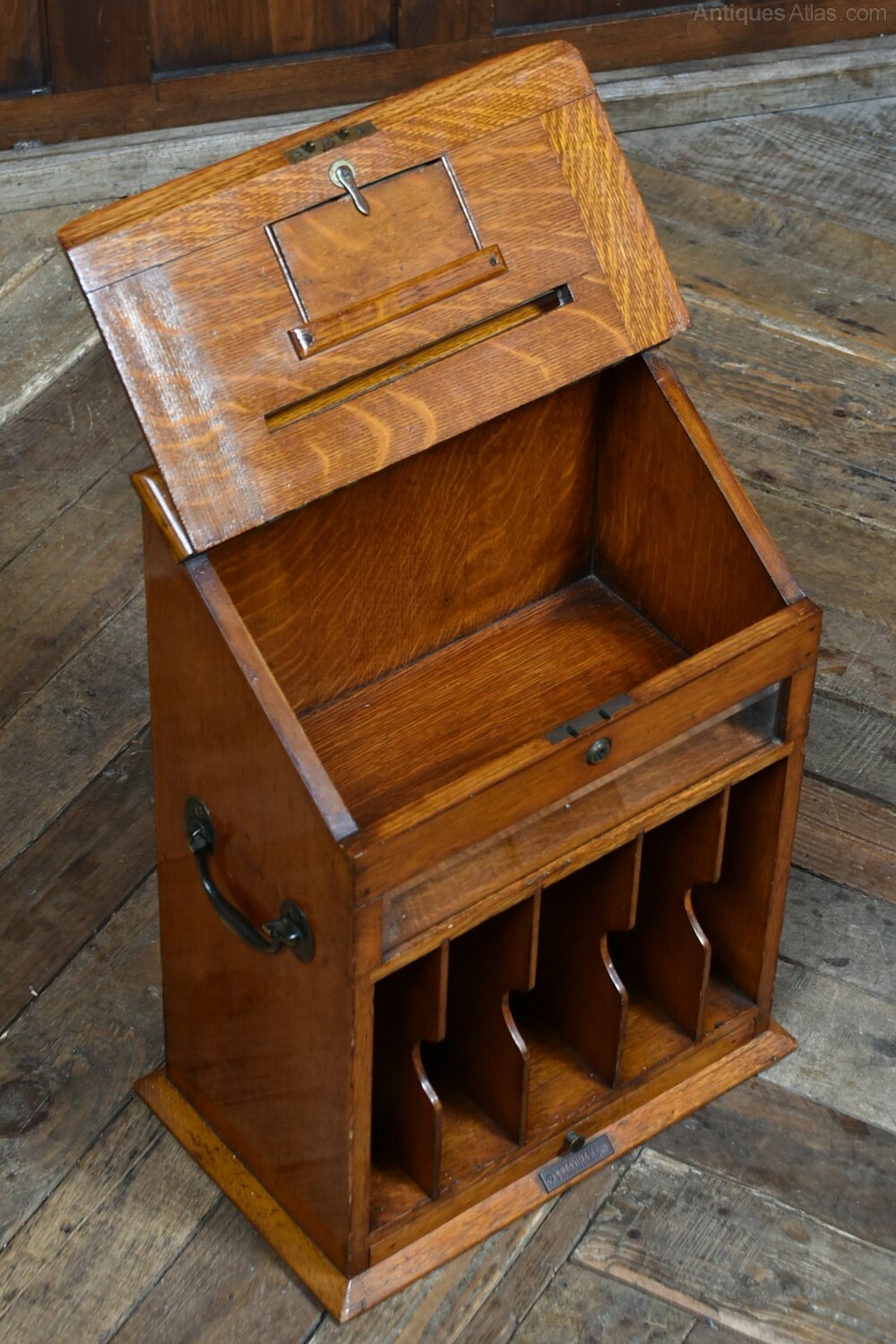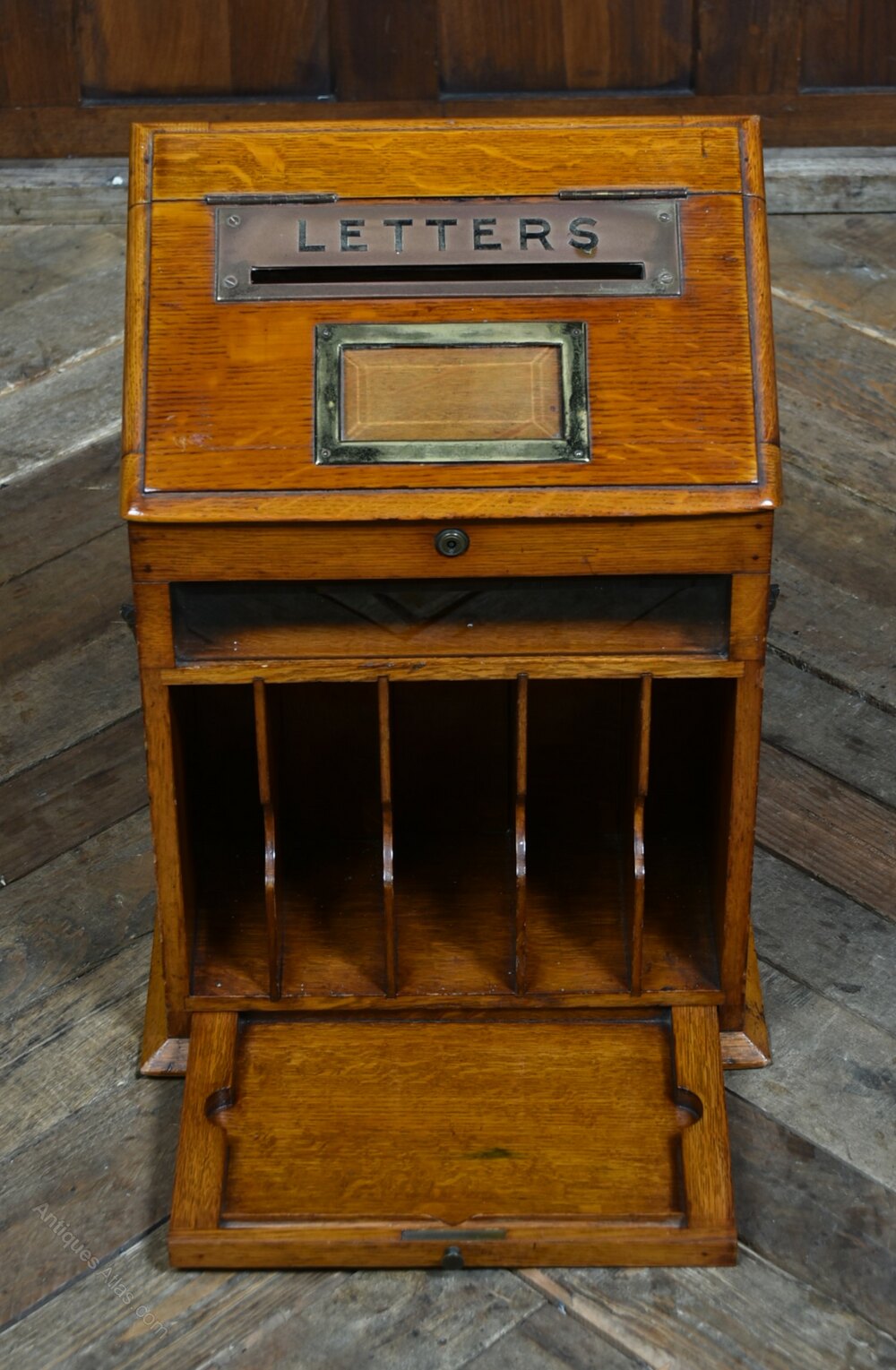 A charming Edwardian oak country‑house letter box, beautifully made and full of period character. The sloped top is fitted with a metal letter slot crisply labelled “LETTERS”, sitting above brass label holders that would once have held the household’s postal instructions or collection times. Underneath there is a glazed panel so you can see if there is any post and series pigeons holes each designed for sorting incoming letters and telegrams — the lower section still bears its original metal “TELEGRAMS” plaque. There is also a small tray for collecting and carrying the day’s mail. Crafted in solid oak with a warm, mellow patina, the piece has side carrying handles and all the quiet practicality you’d expect from a well‑run country estate. Both decorative and functional, it makes a wonderful hallway feature or a characterful addition to a study or office.Internal Reference: SAI4075