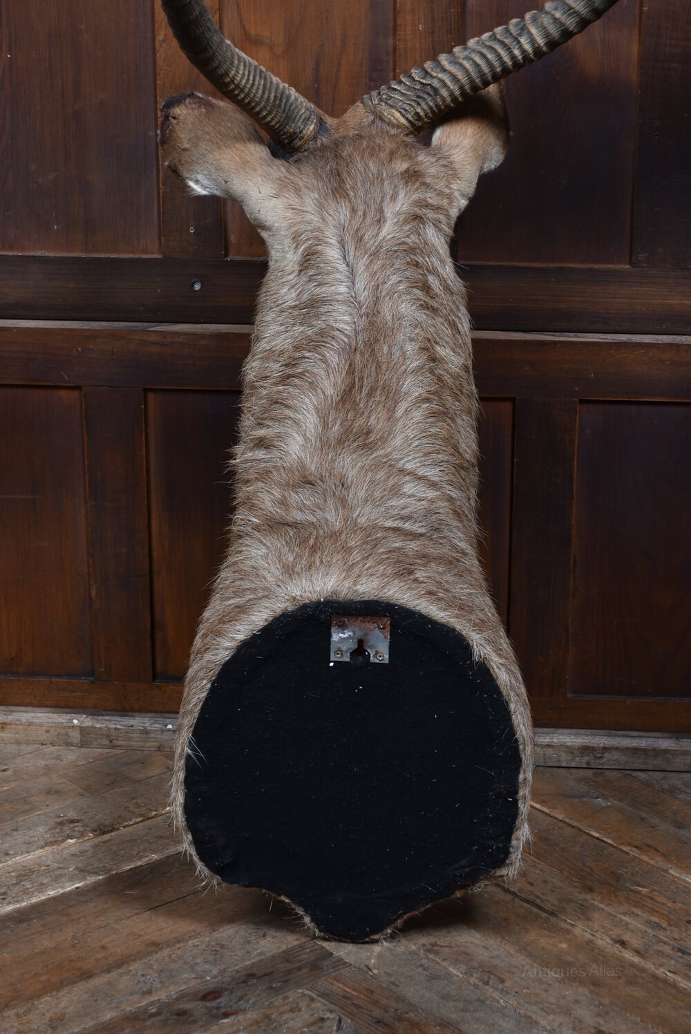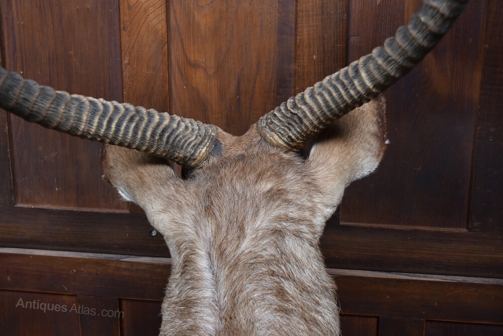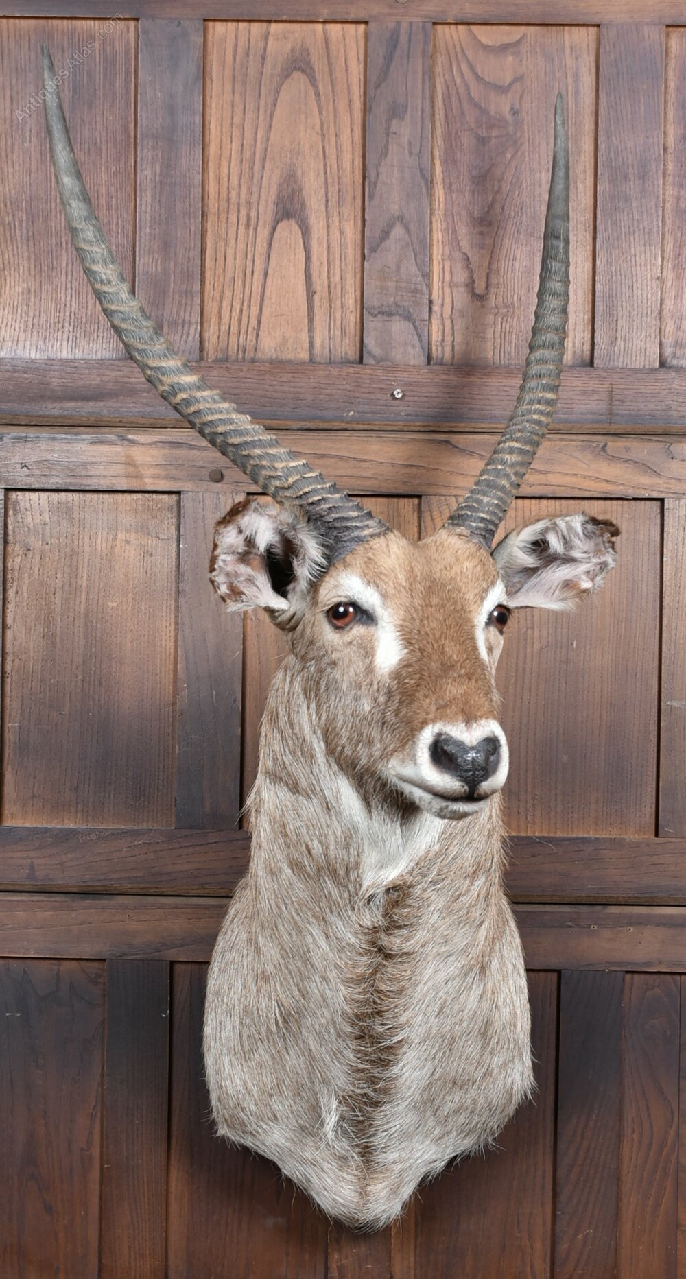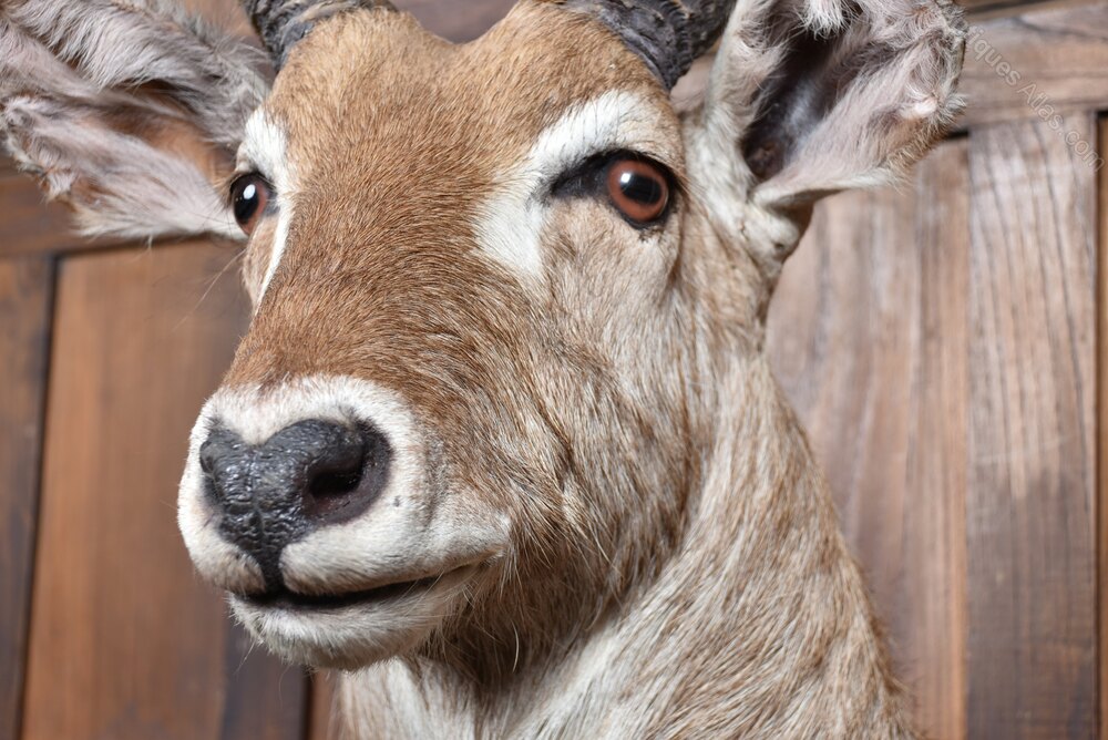 A handsome taxidermy waterbuck in wonderful antique condition. The head and neck are very well modelled, with a warm, rich brown to the coat that shows beautifully. It’s a noble, striking piece of taxidermy, executed with real skill. An eye-catching focal point, it would sit brilliantly in a large reception room, lodge, restaurant or pub, bringing character and presence to any interior.The waterbuck is a large antelope native to sub-Saharan Africa, typically found in scrub and savanna habitats near rivers, lakes, and valley systems. Because they rely on both open grasslands and ready access to water, their distribution tends to be patchy, following these transitional ecotone areas.