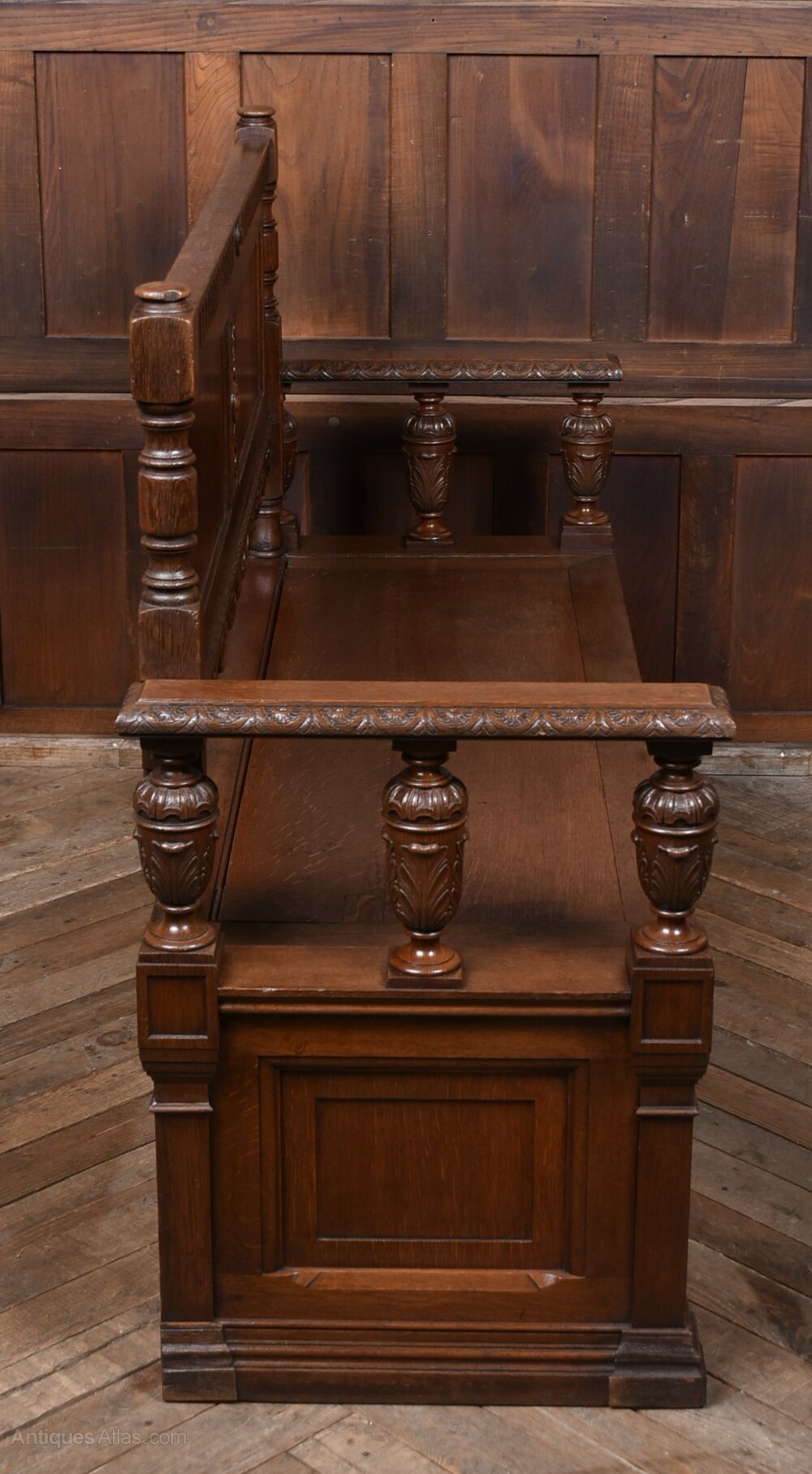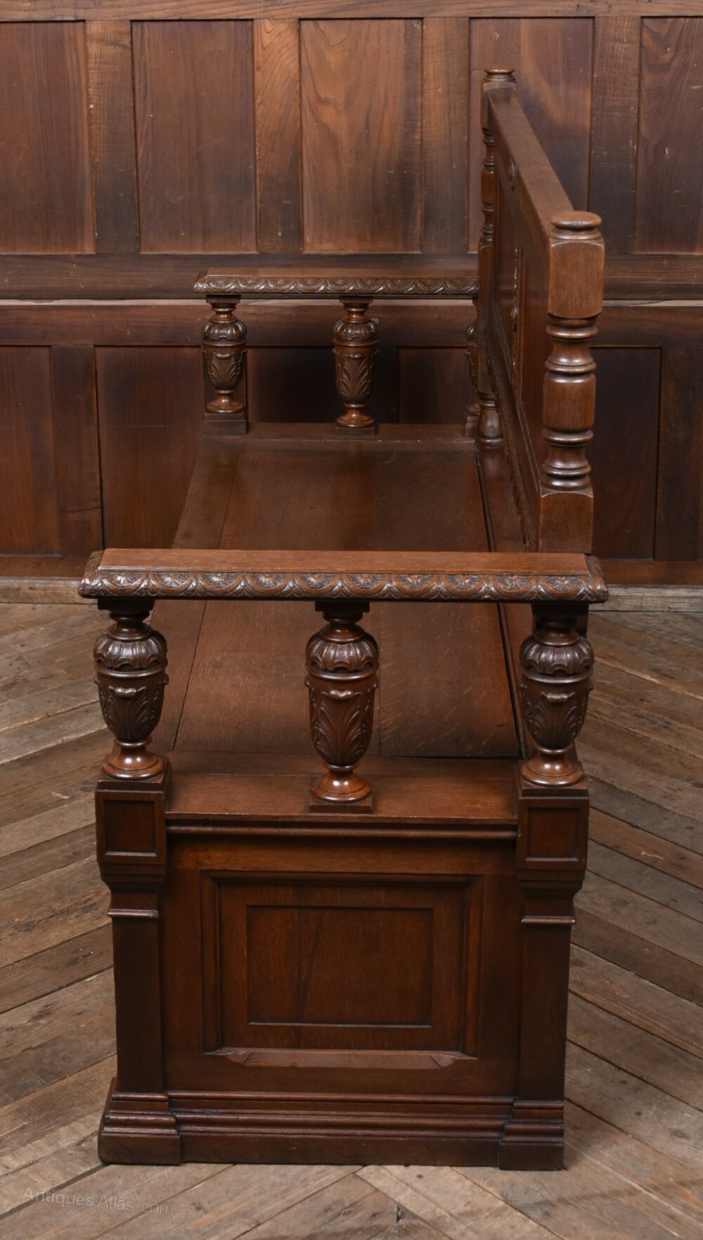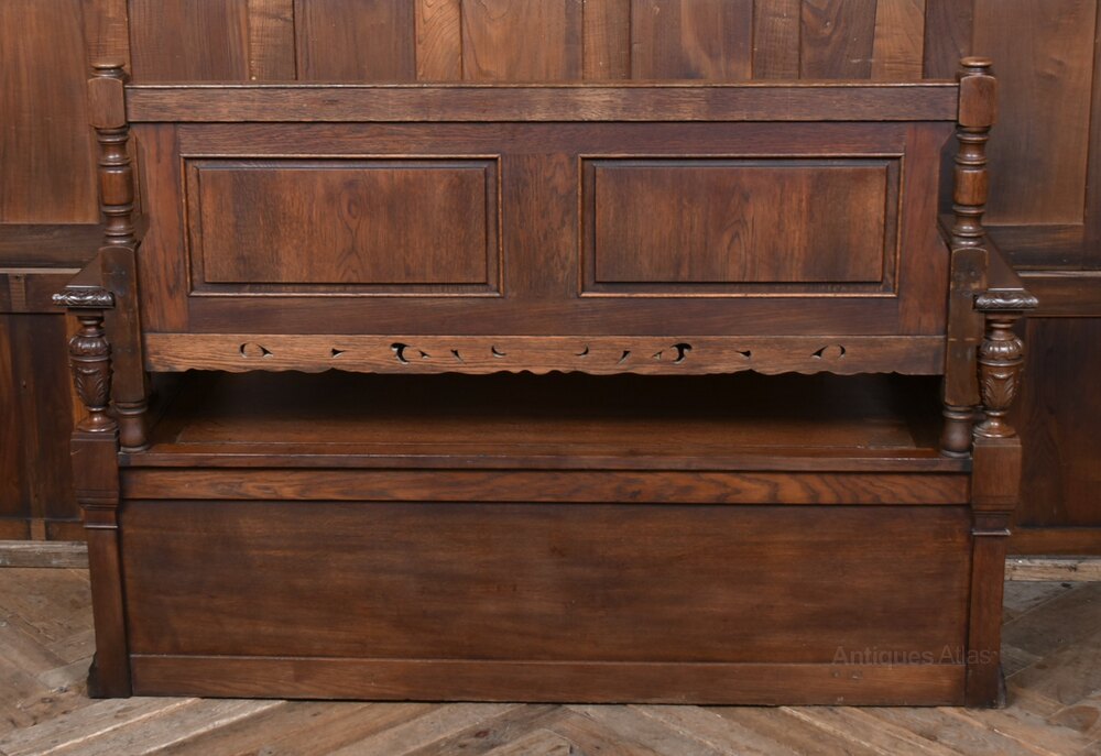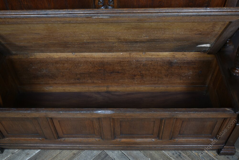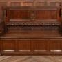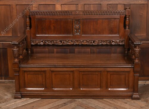 A handsome French oak bench with a high, panelled back and richly carved detail. The top rail is decorated with scrolling and foliate motifs, flanked by turned posts. The solid seat lifts to reveal a useful storage compartment, and the front is finished with shaped and fielded panels typical of provincial French craftsmanship. The oak has a deep, even colour with a warm polish, highlighting the crisp carving. Sturdy, decorative and practical, it works beautifully in a hallway, boot room or kitchen. A charming and well‑made piece of French country furniture with both presence and utility.Internal Reference: SAI4166