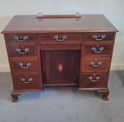 This mahogany kneehole desk from circa 1900 is in superb restored condition and ready to go into service. A very neat example sitting on the ogee bracket feet it has string inlays around the drawers and around the top. This Sheraton revival desk has shell inlays in the top and on the door facing which certainly set this example apart from lesser quality examples. Colour of timber is nice and rich and the stringing is all in place, a good and impressive example.Description40ins wide, 22ins deep, 31ins tallDimensionsCirca 1900Dateas017a1675Code01565 874075Contact£890 Price€1021.1 $1203.99 Euro & Dollar conversion rates as of 5/FEB/2026 Always confirm final price with dealer