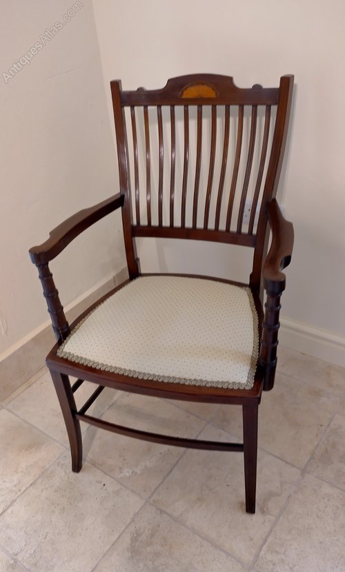 This early 1900s inlaid Mahogany Elbow chair has many potential uses, we feel it would make a great desk chair owing to the well shaped back. It is a great looking example with the turned arm facings and string inlays, enhanced by the fan inlay in the back rail. This chair also makes a great occasional chair in a bedroom or elsewhere if further seating may be required. It is in lovely condition and has just been reupholsterd for sale. A superb example at a sensible price. give us a call to discuss with pleasure. Description90cms high, 58 Wide 65 D overall.