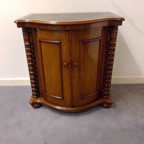 A most unusual bow fronted cabinet from the 19th Century. Just in from a local house this most useful little cupboard is in good clean condition with a black tooled leather top, with no rips or cuts only a little impression where items have been the surface. PLease see picture to see how good it is. There is a nice finish and colour with a most appealing hint of mellow from its time over the years. This has not been abused in its life. It is most versatile, able to go into almost any room in the house, especially if space is a bit limited, the doors slide back behind the pillars so do not open into the room. All in all a super little item in good condition with lots of uses. Give us a call if you would like to discuss 01565 874075Description80cms wide, 57 deep and 81 highDimensionsVictorian, 19th CenturyDateas017a2402Code01565 874075Contact£480 Price€549.65 $647.23 Euro & Dollar conversion rates as of 23/DEC/2025 Always confirm final price with dealer