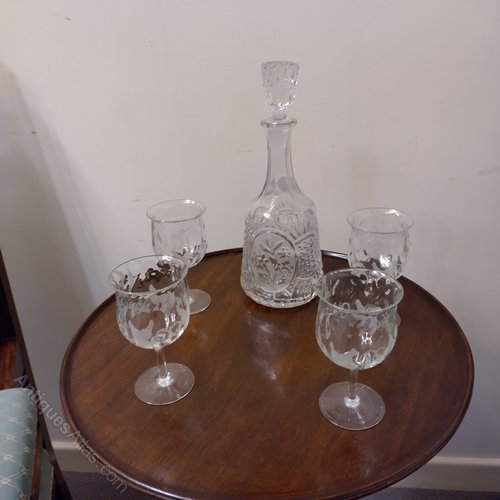 A set of four attractive glasses with a good shape and rather nice decoration from the early 1900s. We have a decanter with similar etched detail, again a most pleasing shape.