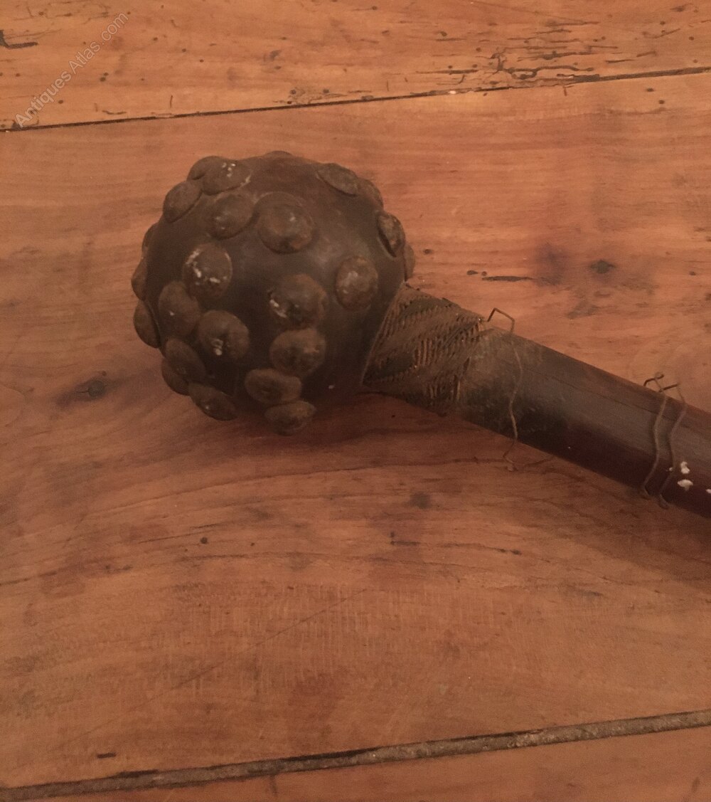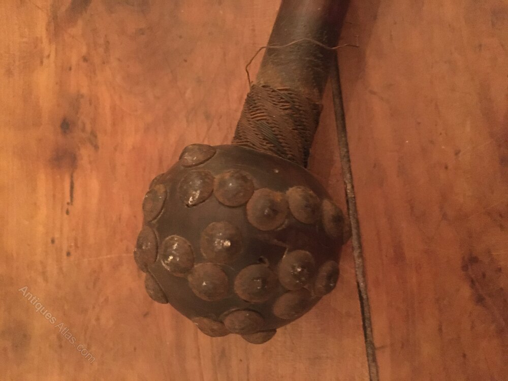Very early and rare Zulu knop Keri. Round studded head wire bound shaft . This shows a lot of age very dark age patina . this has been through the wars as they say , missing the odd stud split in the head some wire loose but I would think a couple of hundred years old at least even damaged it’s way above your average Keri.Shipping information