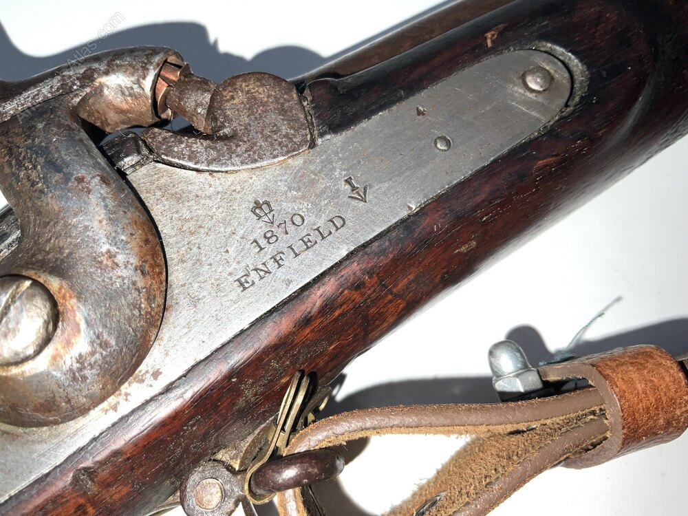 This is an iconic 3-band Musket by Enfield. Dated 1870 with Tower stamp. These were widely used in conflicts such as the American Civil War and the Indian Rebellion of 1857, and were an important part of the evolution of firearms technology during the 19th century.This rifle has a 38 inch barrel and would have fired a .577 caliber MiniƩ ball, which was a conical-shaped bullet that expanded upon firing to fit the rifling grooves in the barrel. This was used to increase accuracy and range.