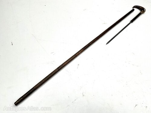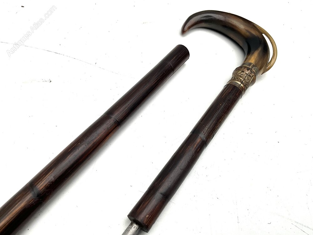 Rare item, dates from the late 1900’s has lovely horn carved handle gold plated collar long elegant partridge wood cane hidden within is a high tensioned steel blade, length in total 91 cm steels tip to top of handle being 40 cm, offering free delivery UK reference LC69We now are only operating as an internet shop, We are passing on these savings to our customers making the prices more reasonable. Having turned to the internet and finding that all over heads are kept to a absolute minimum we related that this is the best way forward for any antique dealer or collector to display therein items on one to an enormous audience.