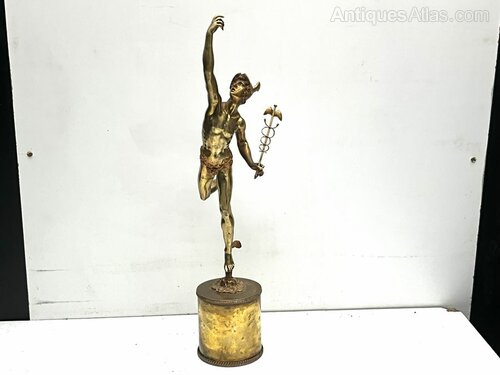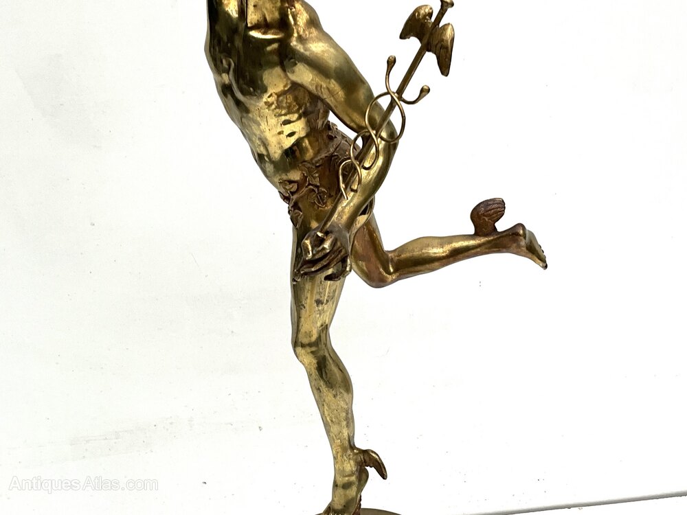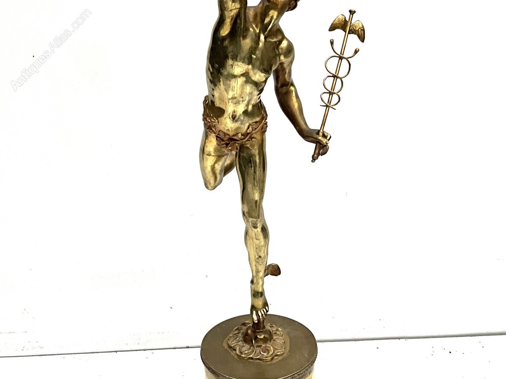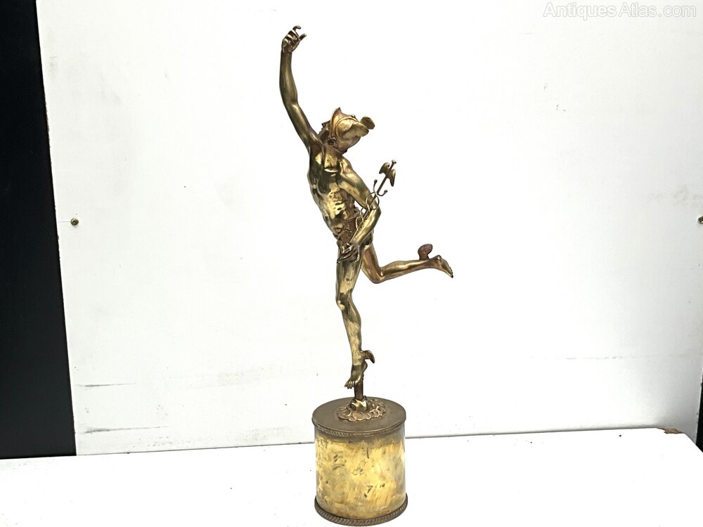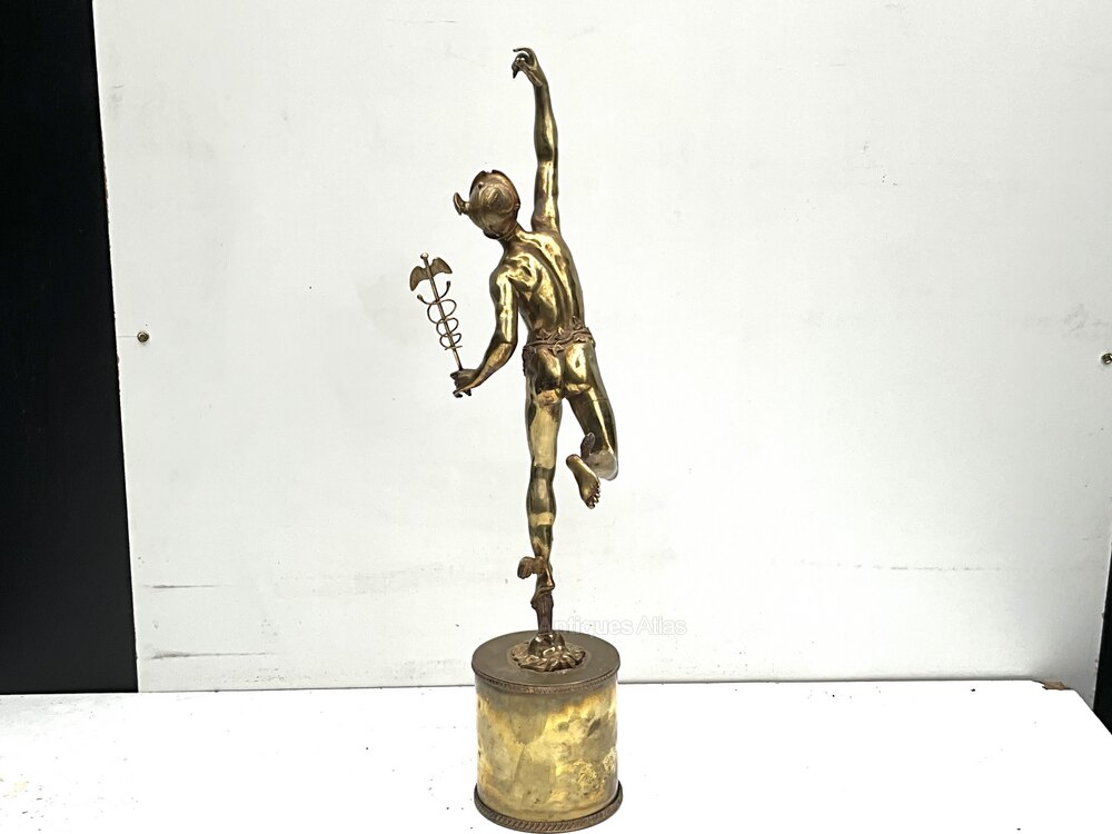 flying messenger of the gods Hermes sculpture after the famous Giovanni da Bologna’s famous “Flying Mercury”, known as Hermes in Greek, depicts the Greek messenger of the gods as he soars through the air. The artist produced four versions of this statue. The statue offered here is the Paris version. Mercury is depicted with a winged Petasos hat on his head and winged sandals, both of which together give him speed in flight. In his hand he holds the caduceus, also known as the wand of Hermes, the magic wand given to him by Apollo, which has come to symbolise the practice of medicine. Overall condition very good being Victorian hot cast bronze the gilded it has some blemishes as one expects, standing an impressive height of 80 cm length being 22 cm depth of 28 cm, offering free worldwide delivery, reference FRC Tel: +44 7505 165 843 We accept online payments for all our items listed: Bank transfer cash on collection or if wishing over the phone using your debit or credit cards, also doing layby payments plan, or email giving your address details & contact number and we shall send you your items invoice to make payment with your card. Send your request to - john.strong2@gmail.comWe now are only operating as an internet shop, We are passing on these savings to our customers making the prices more reasonable. Having turned to the internet and finding that all over heads are kept to a absolute minimum we related that this is the best way forward for any antique dealer or collector to display therein items on one to an enormous audience.