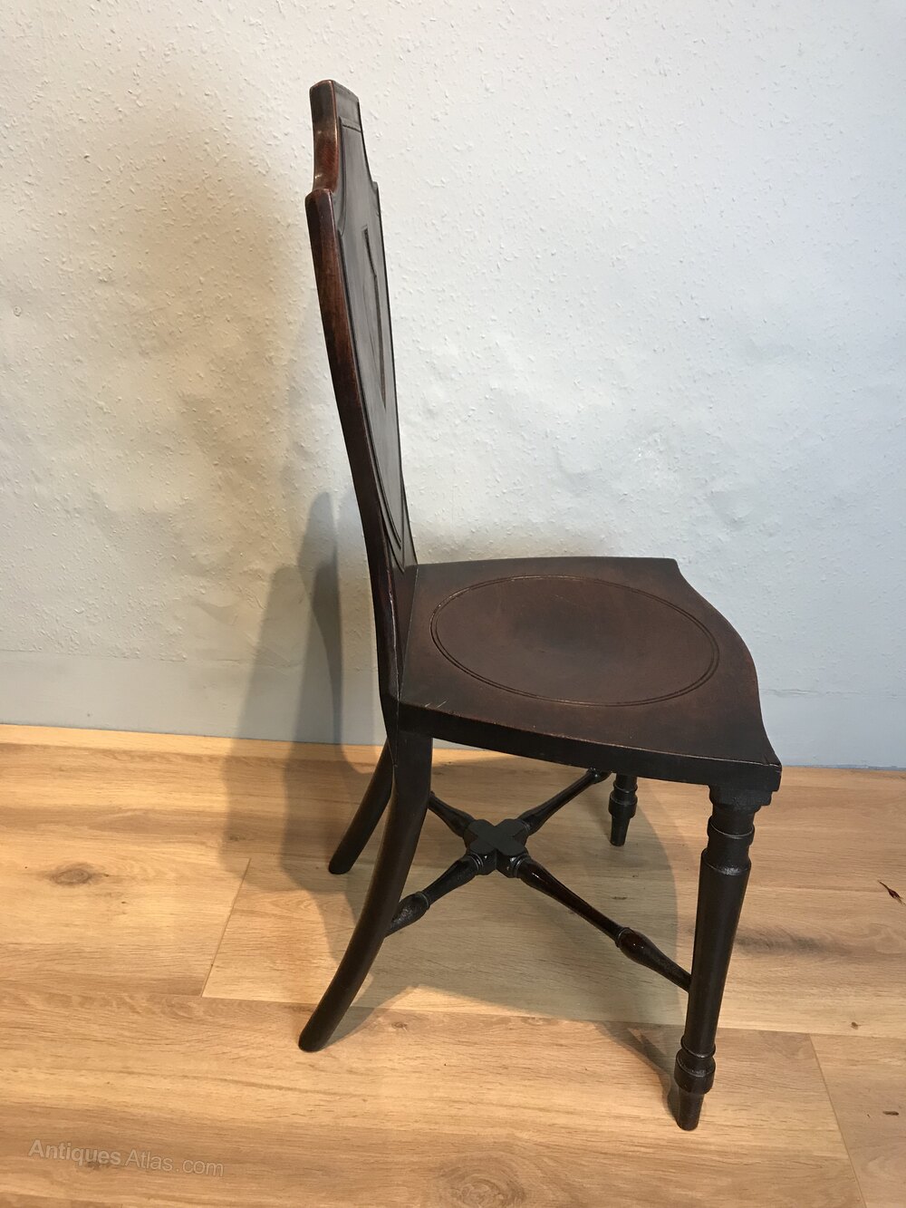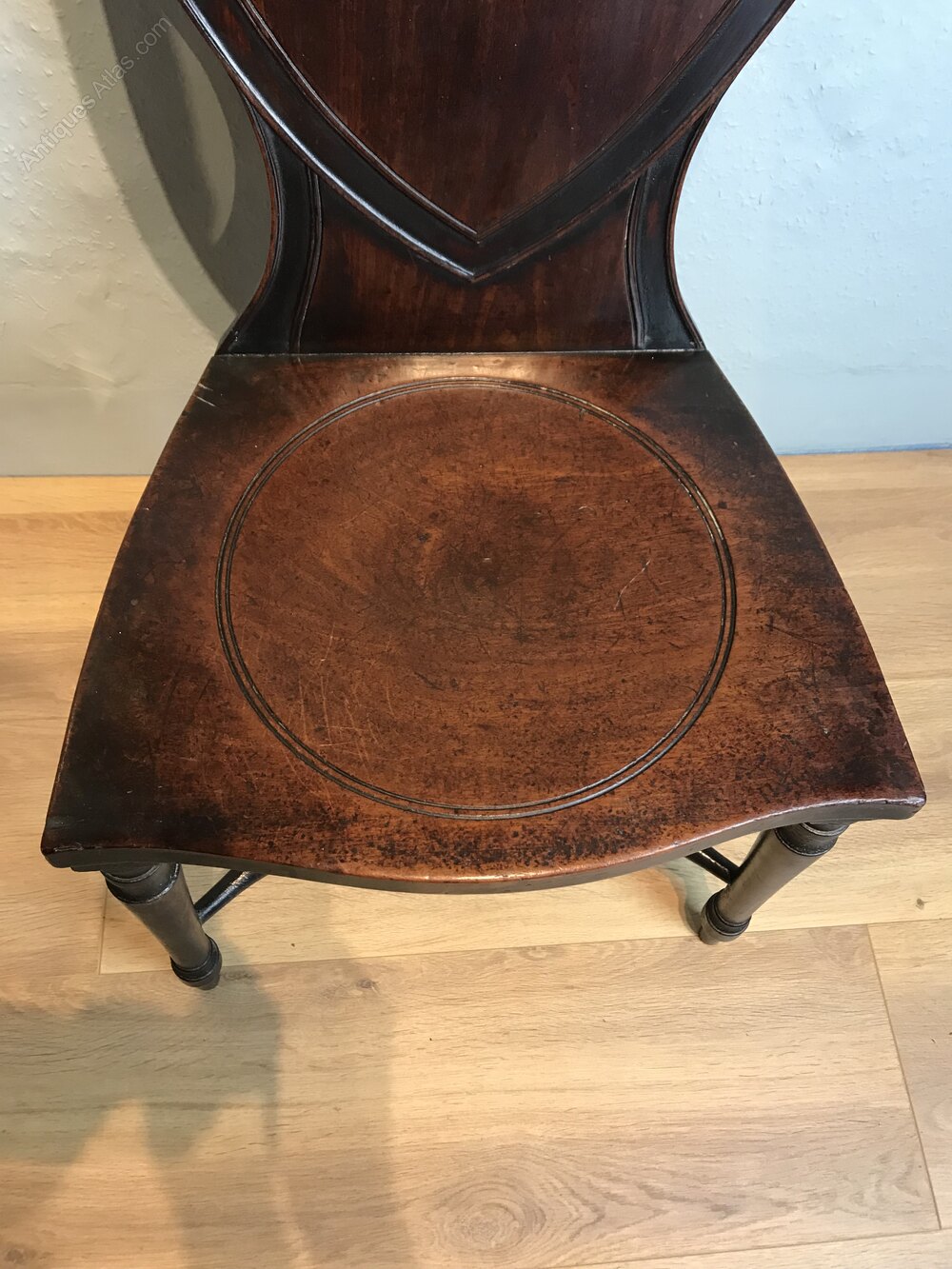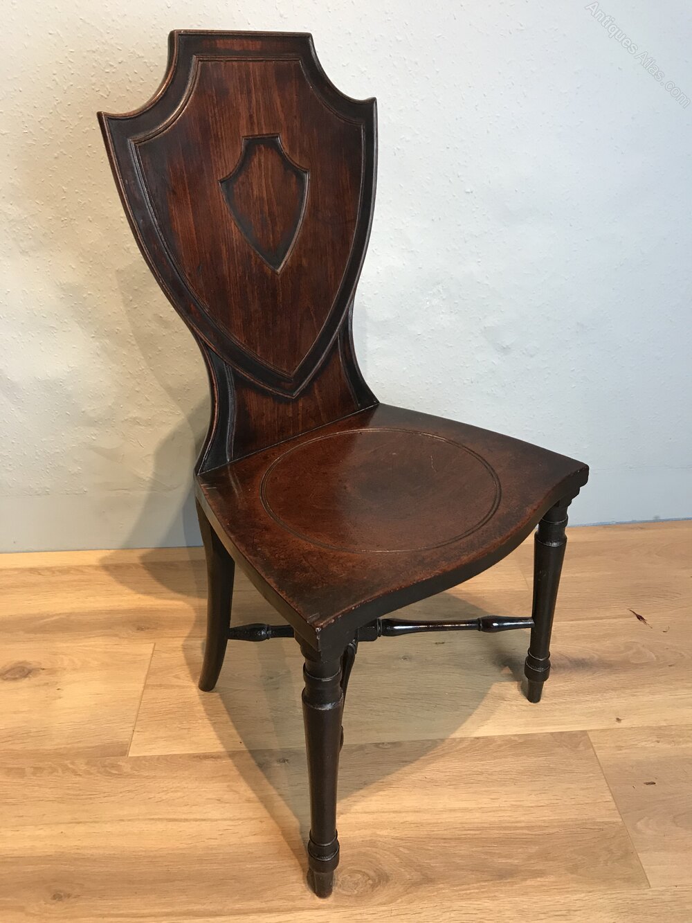A stunning Sheraton period mahogany shield back hall chair, circa 1790 with circular dished seat, resting on slender turned legs, connected with a lower turn stretcher. This hall chair is in wonderful untouched condition.DateLate 18th Century :