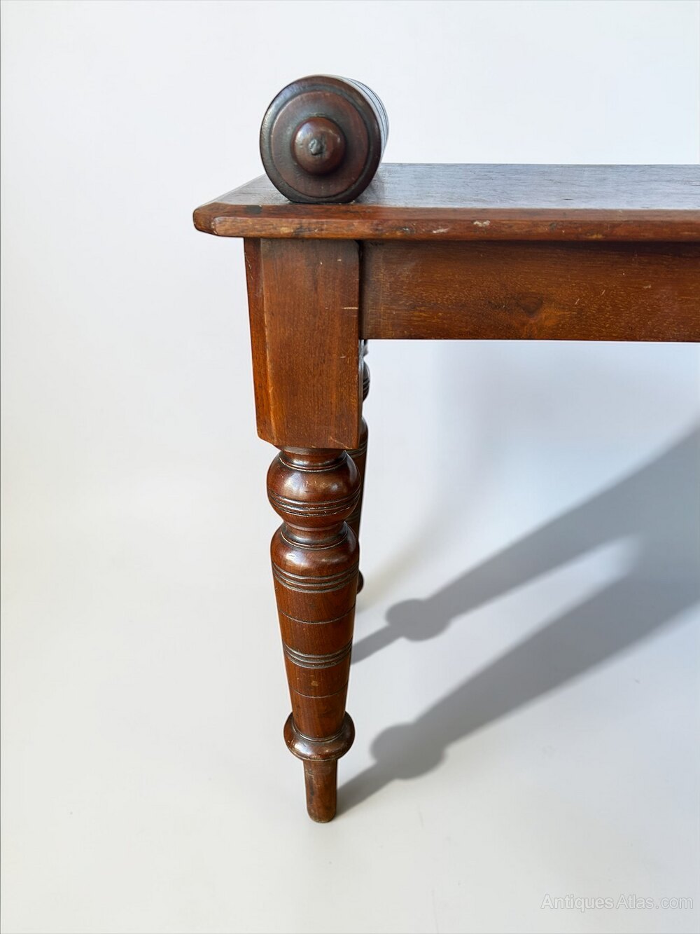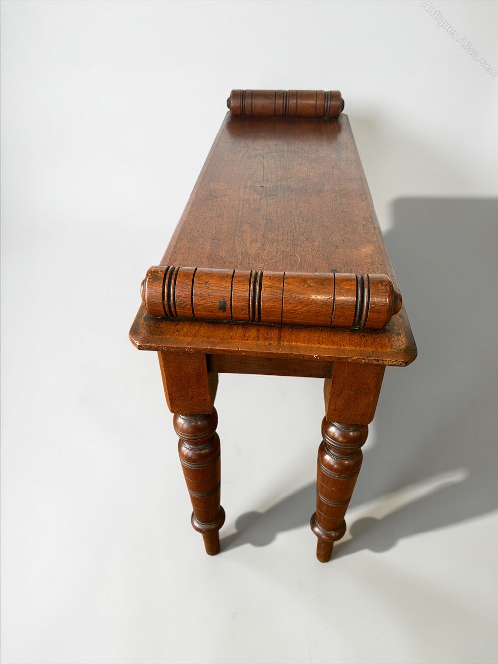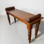 Walnut hall bench made by the cabinet maker Shoolbred &Co with applied enamel label, stamped and numbered. The richly patinated seat is flanked with bold bolster ends resting on elegant turned legs.DateMid 19th Century :