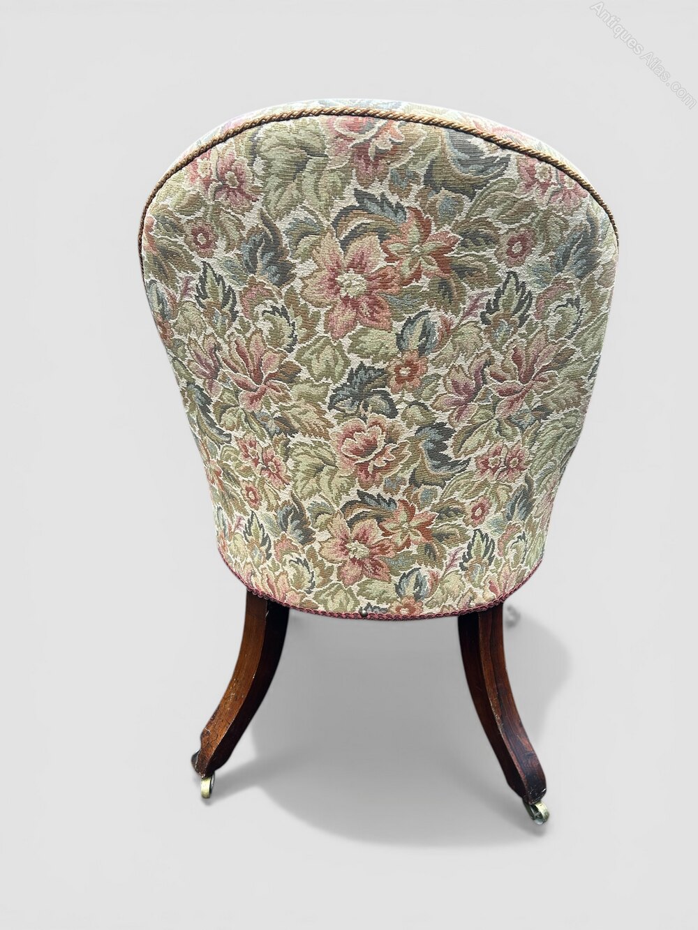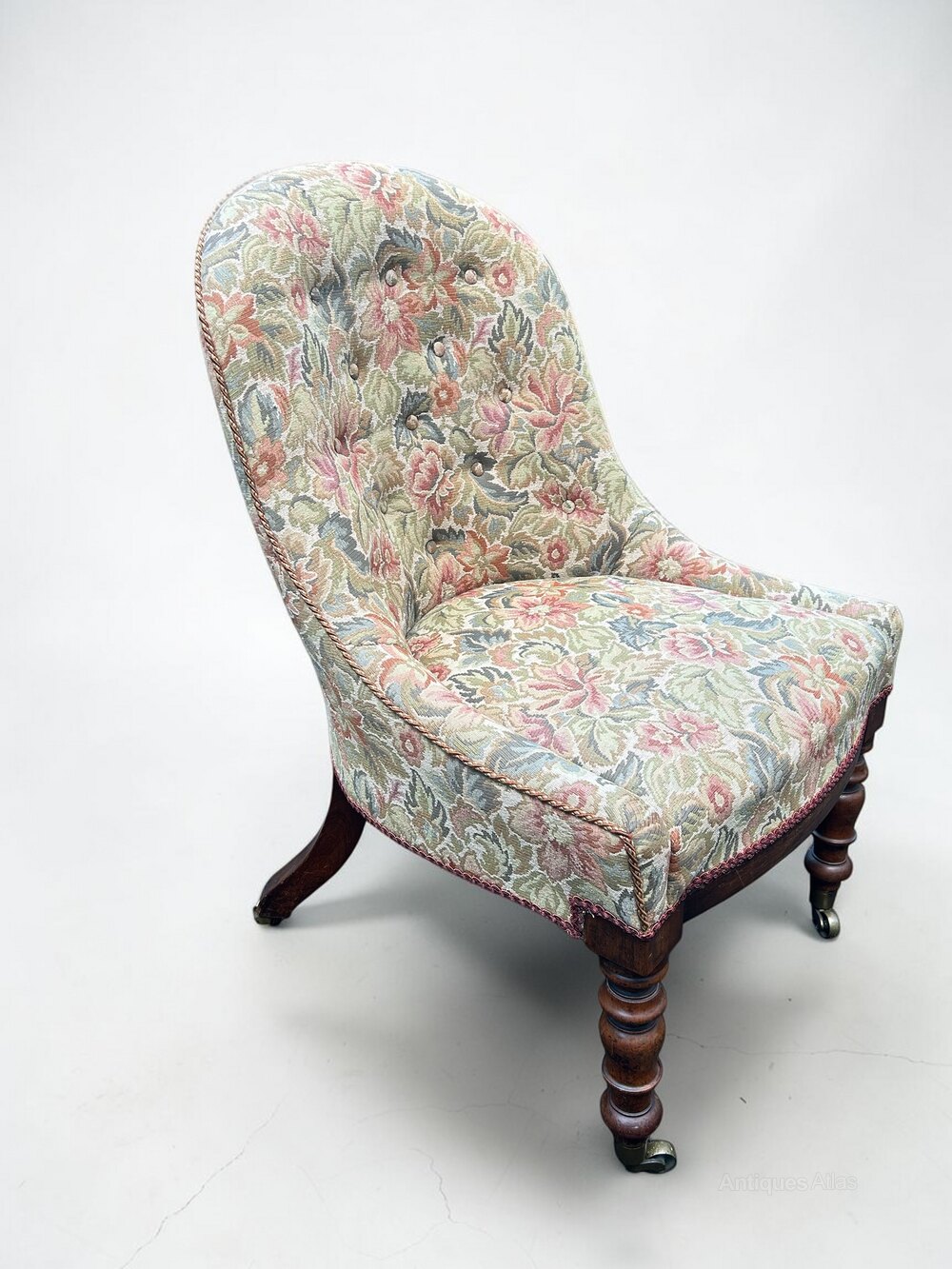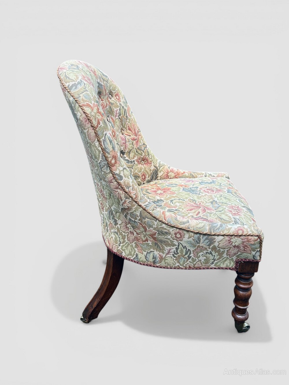 19th century slipper chair circa 1830, raised on fine turned legs ending on brass cup castors, the back legs are splayed and veneered ending on a brass plate castors, the chair is structurally in good order as well as the chintz fabric. Seat height 43cm.Date19th Century :