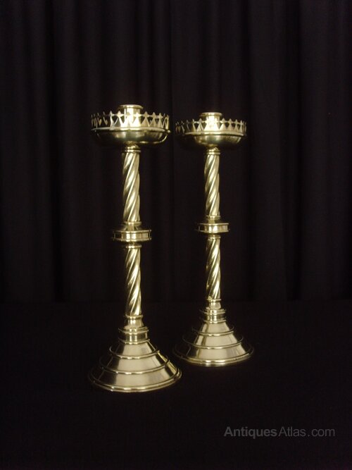 We are offering for sale this excellent pair of Heavy Brass Gothic Revival Candlesticks. They have ribbed conical bases, two twist columns divided by a central, ribbed socle and tall sconces set within deep dishes with typical Gothic pierced galleries.Height: 15 3/8 inches - 39cm