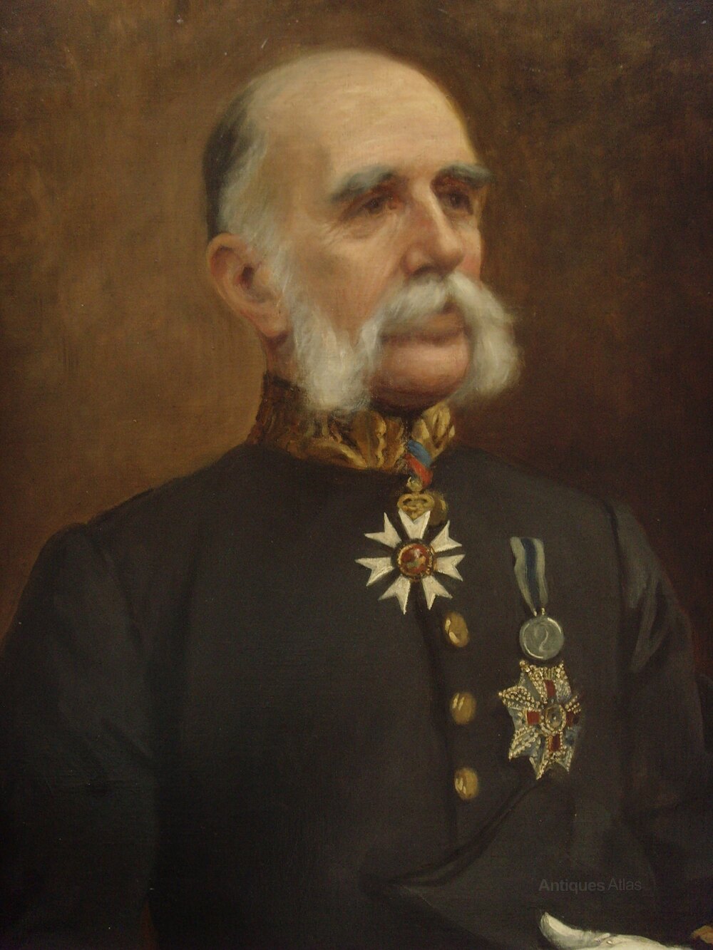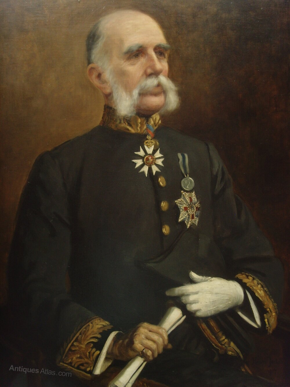 We are very pleased to offer for sale this superb portrait of a dignitary by the English artist Honora Jackson 1867-1950, who has signed the portrait in the lower right hand corner and dated it 1917. The portrait depicts an older, distinguished gentleman in court levee dress, wearing the Cross of the Order of St. Michael and St. George on a ribbon around his neck, and the Star of the Order on his left breast. This denotes that he was a Knight Commander of the Order (KCMG), which was awarded to ambassadors and the upper echelons of the court and administration. It is not a military decoration and he wears no military awards. He is also wearing Queen Victoria's Jubilee medal from 1887, which shows that he was part of the proceedings, which was awarded in gold, silver and bronze. (The medal measures 30 millimetres (1.2 in) in diameter and was awarded in gold (to members of the Royal Family), silver (to officers and those of similar status) and in bronze (to selected other ranks and those of similar status). Strangely, he is not shown wearing the clasp to the medal given out in 1897 on the occasion of her Silver Jubilee, which took the form of that date in digits between two bars and would be clasped around the medal ribbon. The clasp was awarded to all those who had received the 1887 medal, so it is possible that either it hadn't been added to the medal, or the portrait was executed from an earlier photograph.In levée dress the coatee had the same embroidery, but only on collar, cuffs, and pocket flaps the collar of the 1st and 2nd classes had embroidery all around the neck as on full dress, whereas that of 3rd class had front embroidery 4+1⁄2 inches (11 cm) long, that of 4th class had front embroidery 3 inches (7.6 cm) long, and that of 5th class a saw edge only. The coatee was fastened with practical buttons bearing the Crown onto button-holes. Blue cloth trousers were worn in place of breeches, with a gold oak lace stripe, 2+1⁄2 inches (6.4 cm) wide for 1st and 2nd classes, 2 inches (5.1 cm) for 3rd and 4th classes, and 1 inch (2.5 cm) for 5th class. White gloves were again worn, while patent leather military boots replaced the buckled shoes, and the sword accessories were similar to that on full dress, but with blue cloth frog.