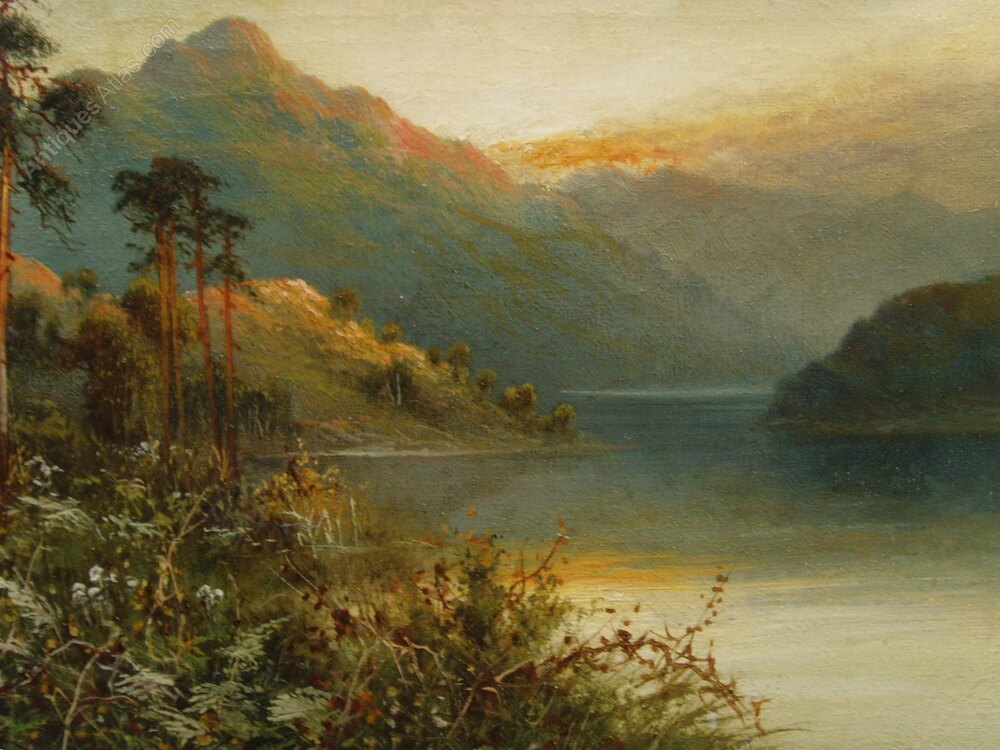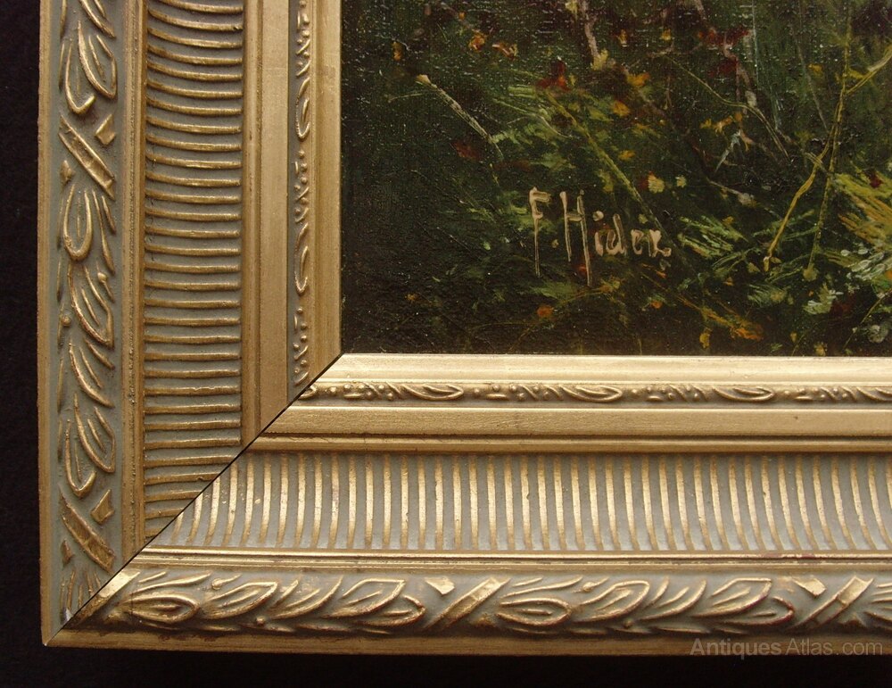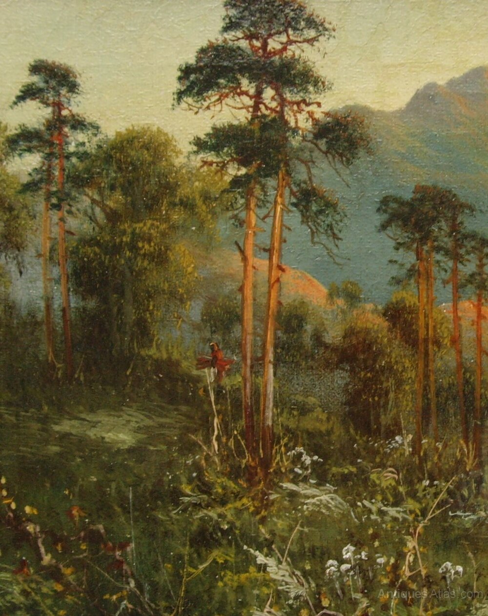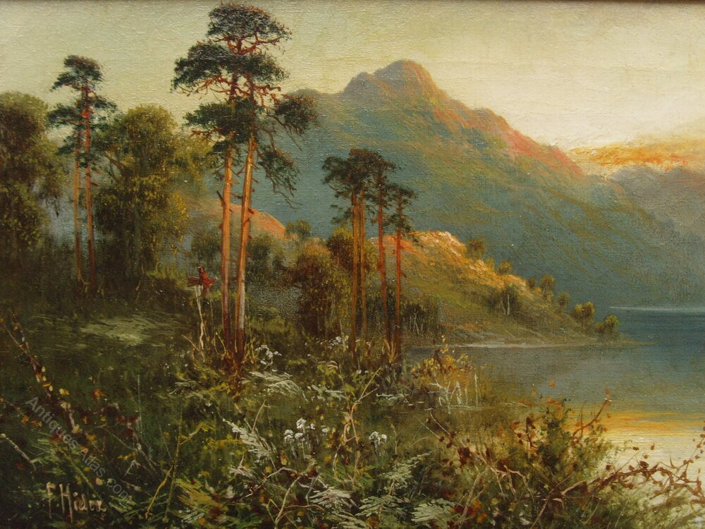 We are offering for sale this very well executed sunset scene of the Highlands of Scotland by the artist Frank Hider, who has signed the painting in the lower left hand corner and entitled it verso 'Shades of Evening'. The painting depicts a sunset landscape, with a figure in red who has been collecting wood, walking on a path through the trees. There are Hider's trademark white flowers in the foreground, which seem to appear in all his landscapes.This is a quote from Jeremy Wood's book Hidden Talents. 'Frank Hider was a painter in oil and sometimes watercolour of coastal scenes and rural landscapes. This artist was very prolific and his work is frequently seen on the market - the beach scenes in oil being the most common. The oils were often inscribed with the title and location on the reverse. Frank Hider's style and colour are similar to S. Y. Johnson but he usually painted with a broader technique. There are also some similar oils signed George Hider and he may have been related. Frank Hider lived at Forest Gate, Essex for a number of years and died on the 29th November, 1933.'