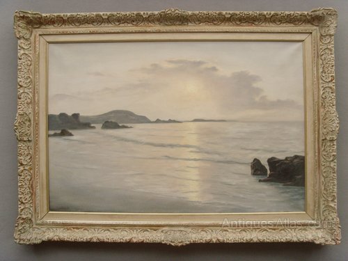 We are delighted to offer for sale this large oil on canvas by the French artist Roger de la Corbiere, who has signed the painting in the lower left hand corner and inscribed it verso on the edge of the canvas 'Bretagne St. Jacut'. St. Jacut de la Mere is a popular seaside town on the coast of Brittany with several wonderful beaches and the painting depicts one of these at sunrise.ROGER DE LA CORBIERE, 1893-1974, was a French artist who was born in Vienna. He studied under the Russian painter Choltse, who was a great exponent of light and shade particularly in snow scenes. He exhibited at the Paris Salon for 35 years, receiving the Silver Medal in 1954. In 1957 he received the Bronze Medal from the Salon des Independants. The French State acquired several of his paintings in 1925. His painting are in the collections of many well known persons throughout the world.